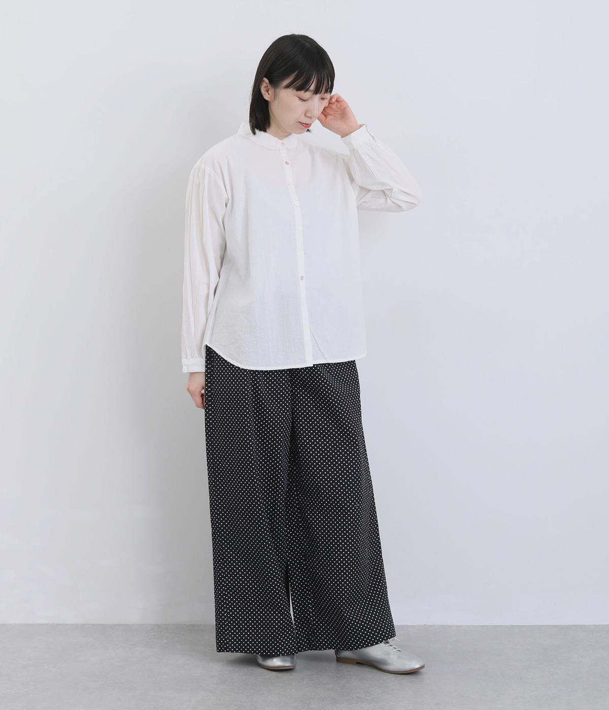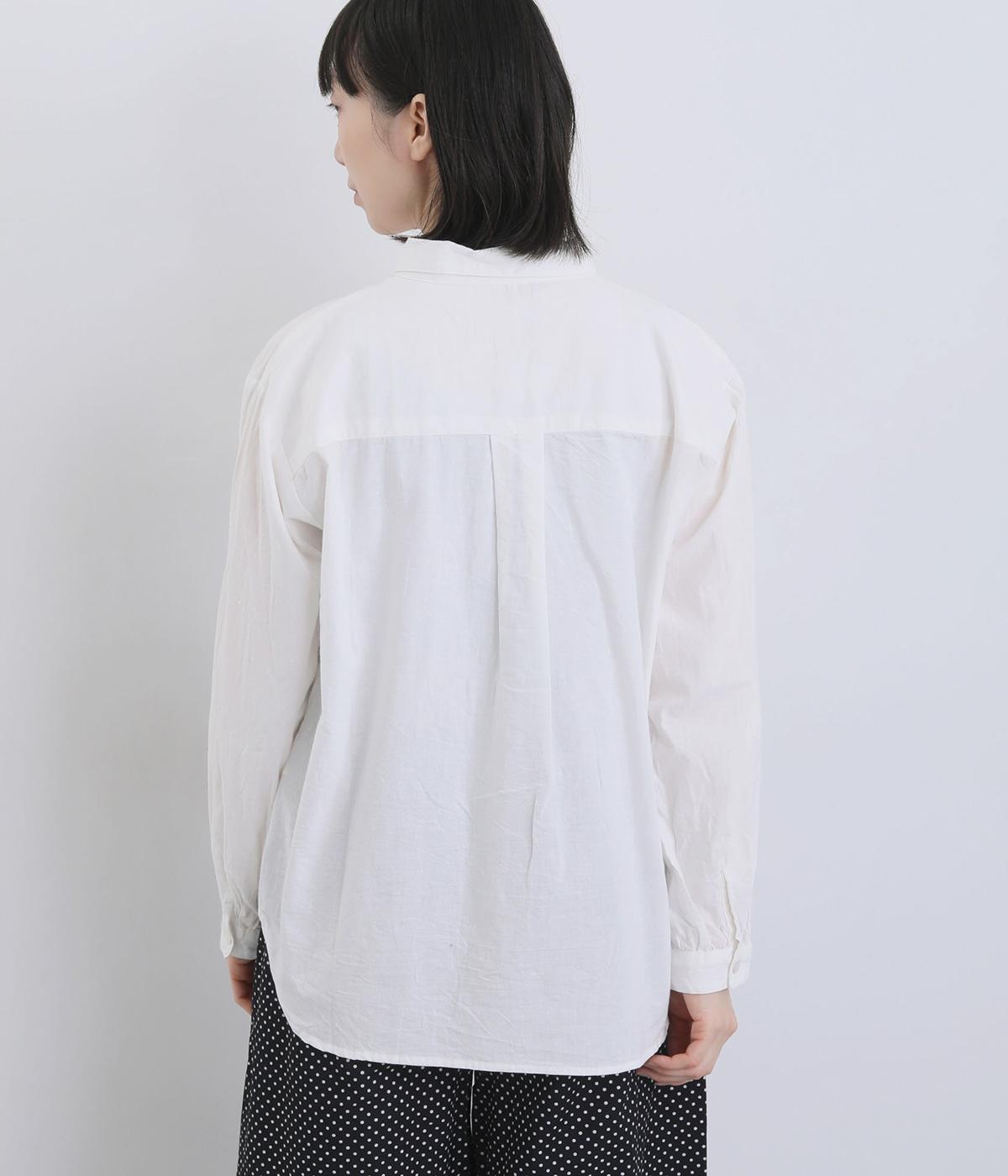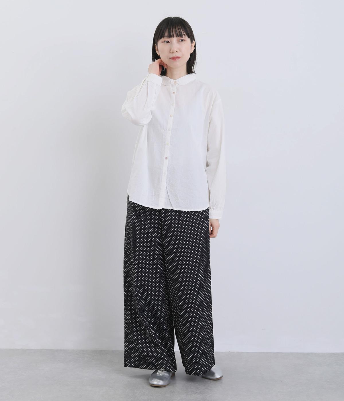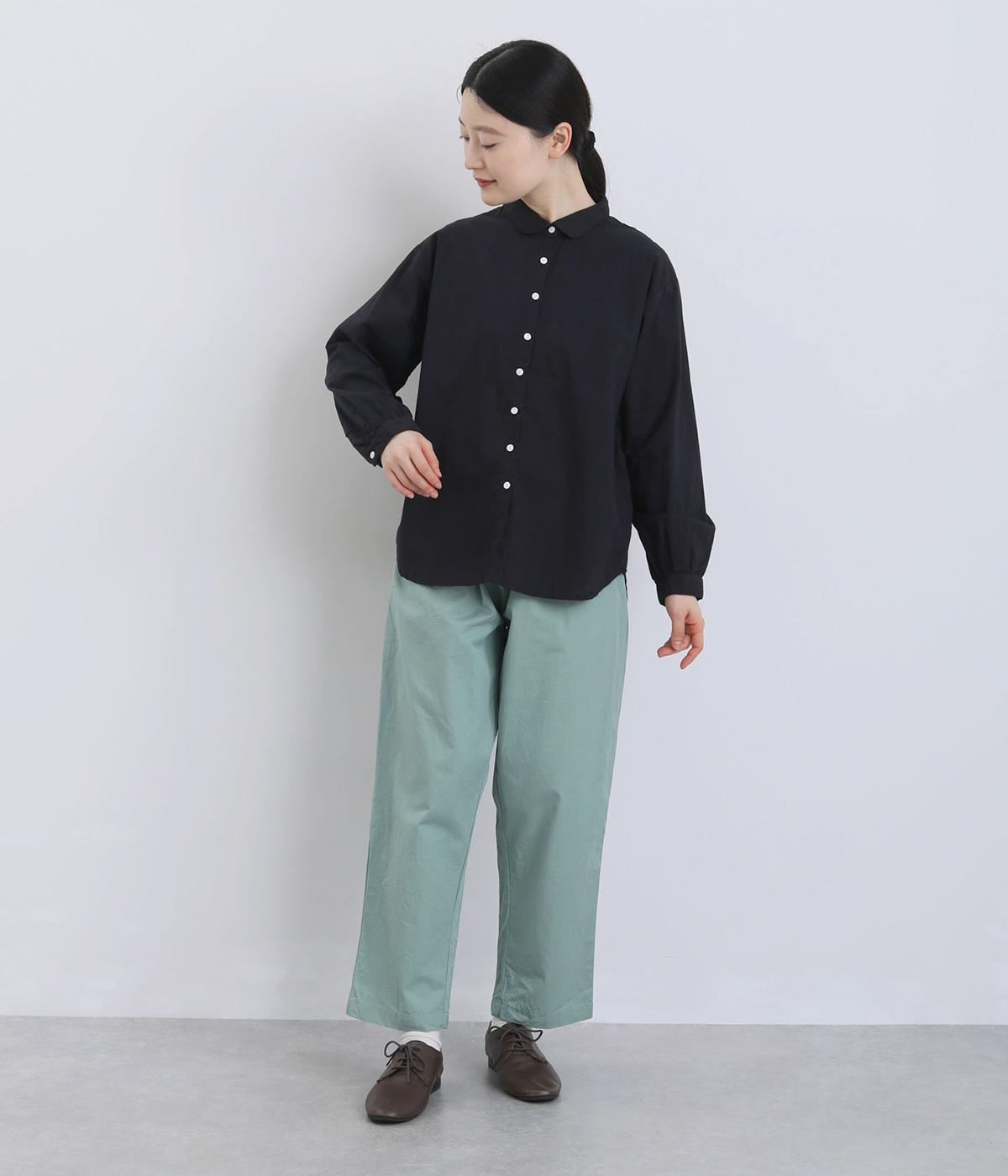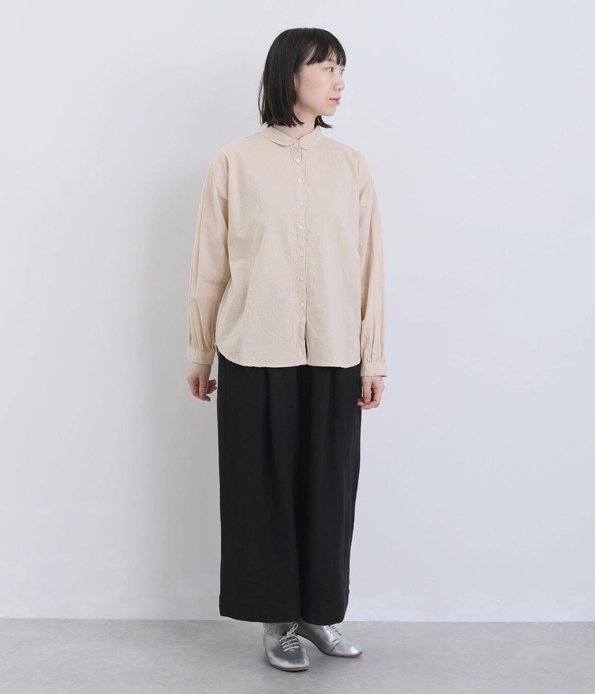 シンプルで着まわしやすいレギュラーシャツを、ほどよくフィットするサイズ感で仕立てました。丸みのある襟元と袖口に寄せたギャザーがやさしい表情を添え、女性らしい印象に。インナーとして重ねるのはもちろん、前をあけて羽織りとしてもたのしめる、着まわしに活躍する一枚です。