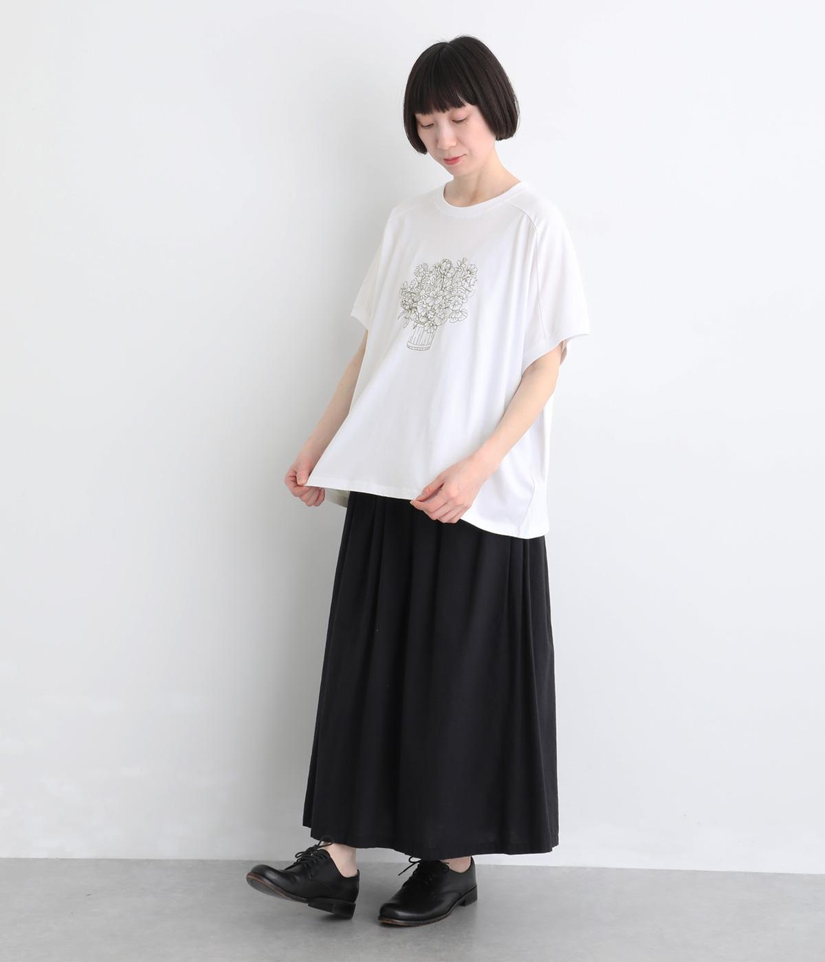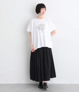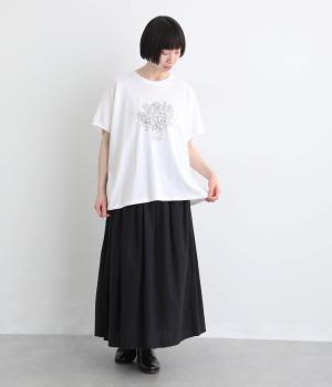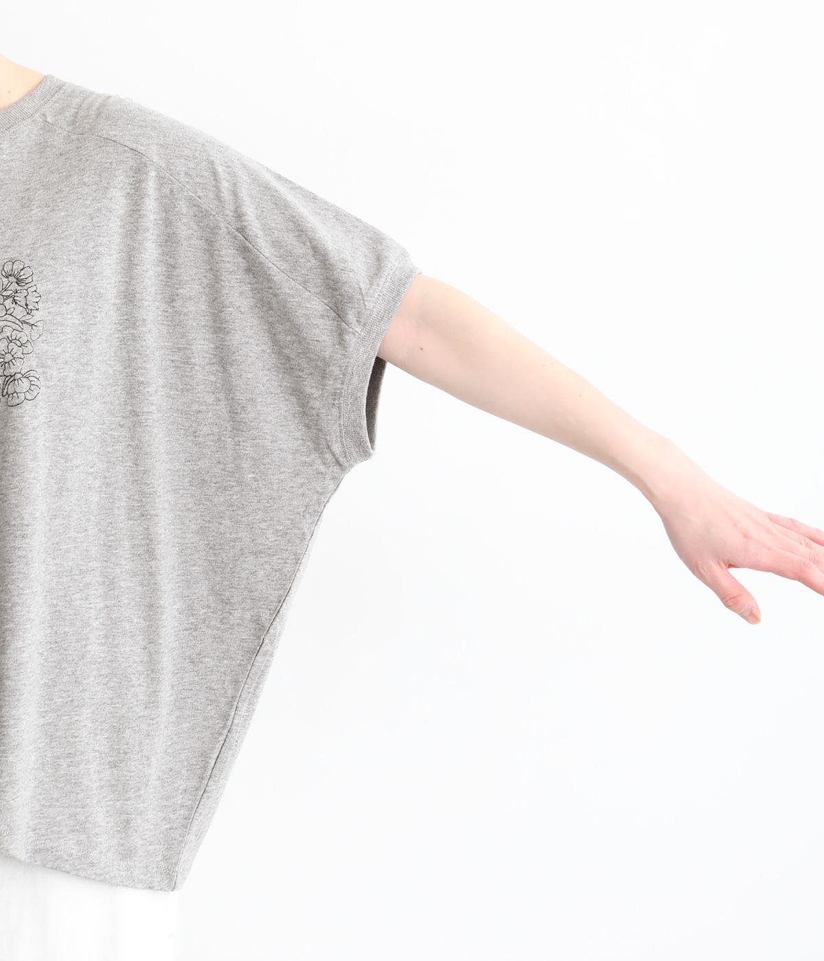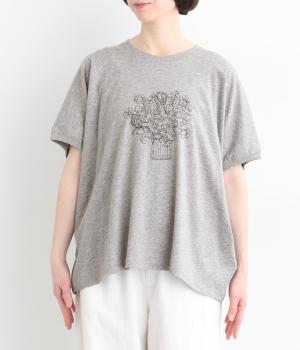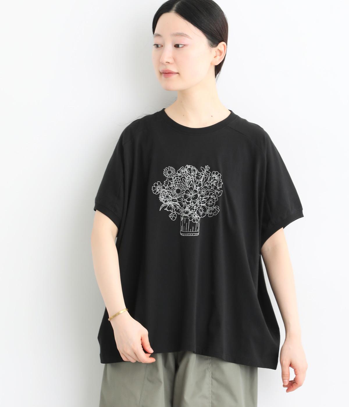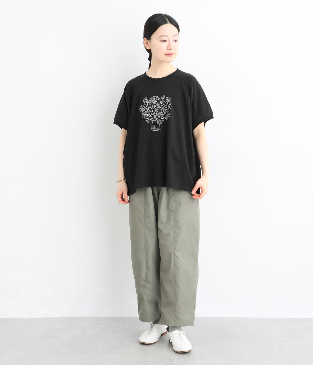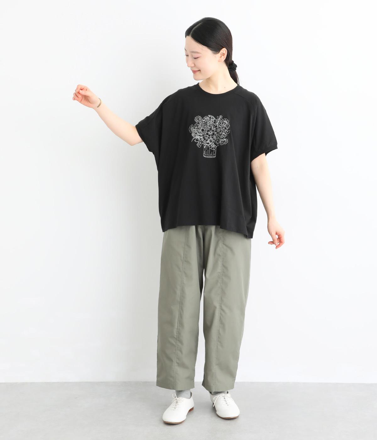 花束モチーフの刺しゅうをあしらい、やさしい華やぎを添えたTシャツです。ポンチョのようにゆったりと広がるワイドシルエットで、着るだけでこなれた印象に。身頃から続く袖のデザインにより動きやすく、リラックス感のある着心地も魅力です。コーディネートにほどよい個性をプラスできる一枚です。