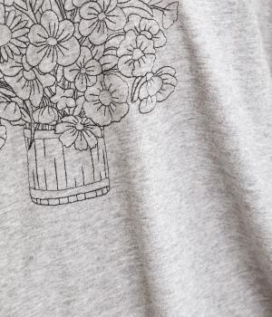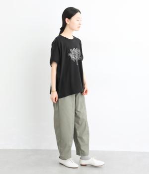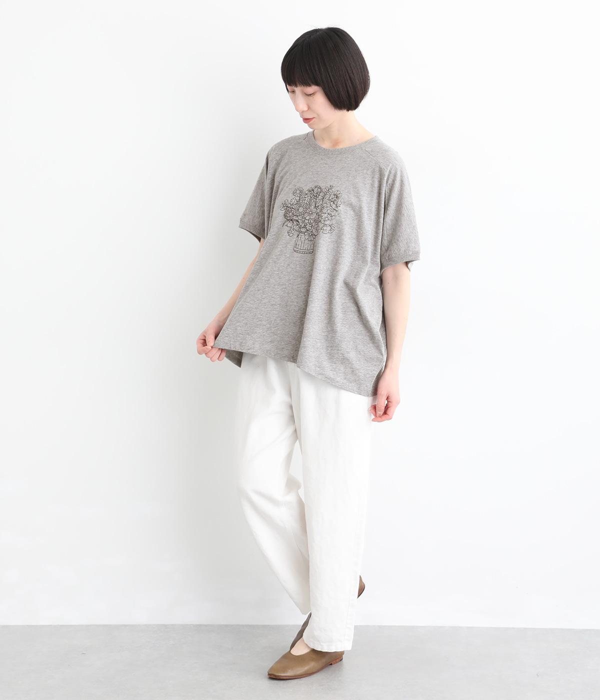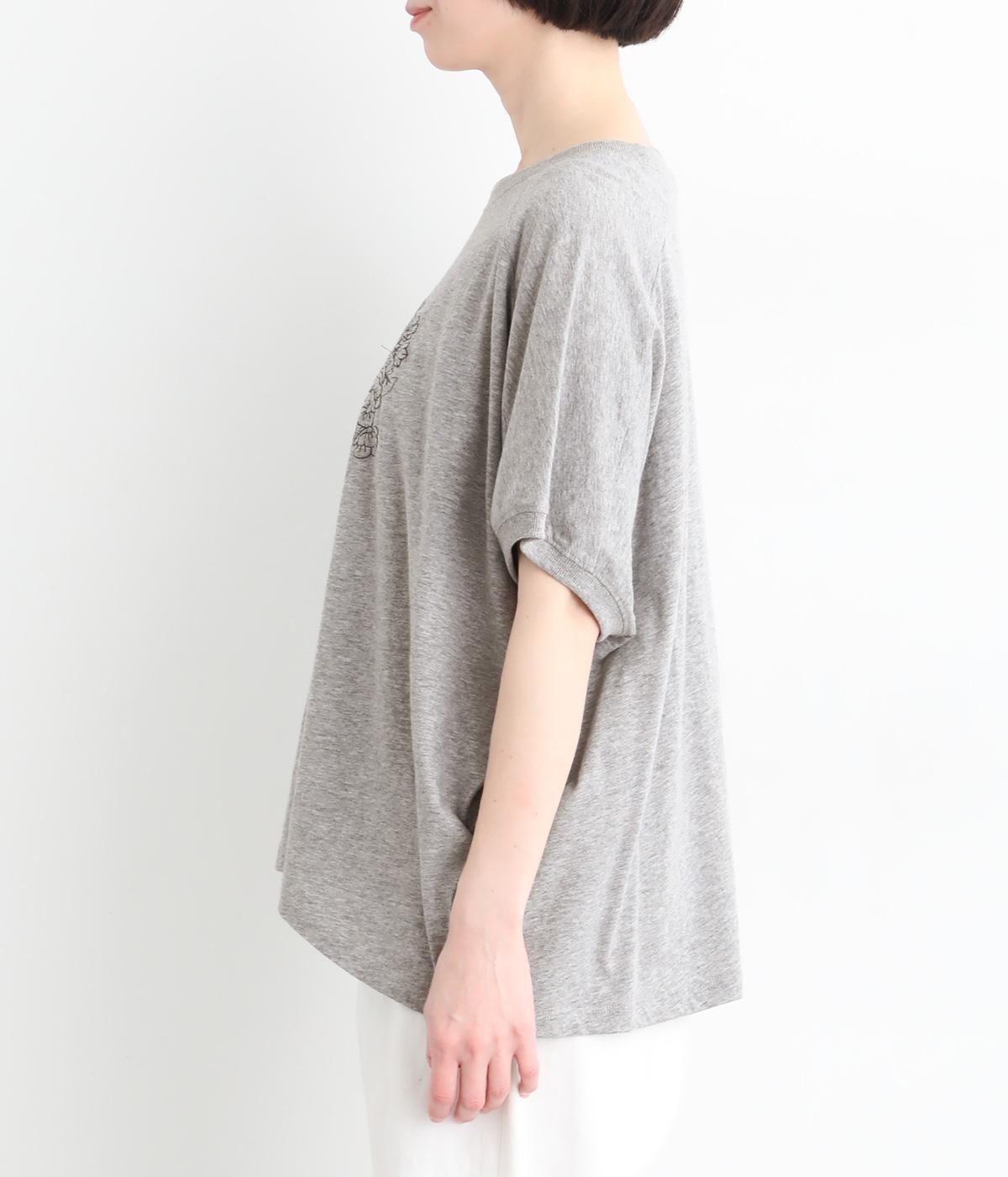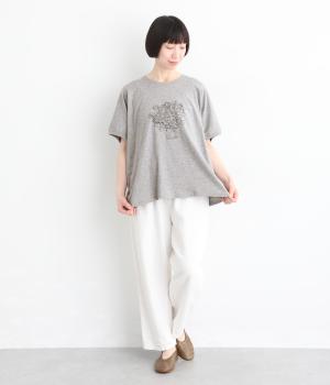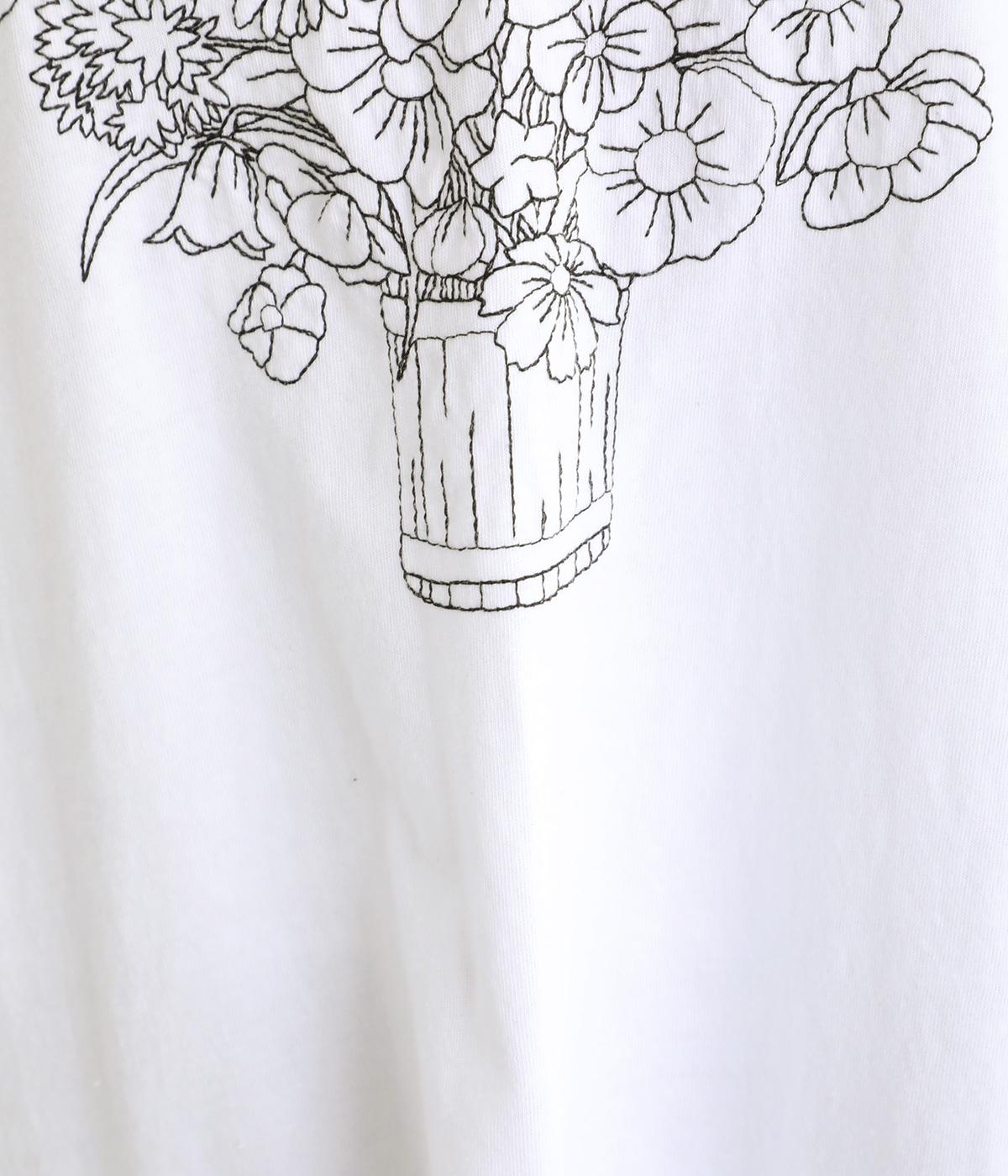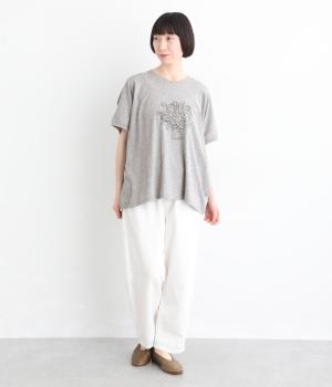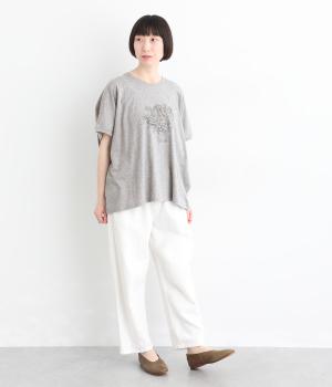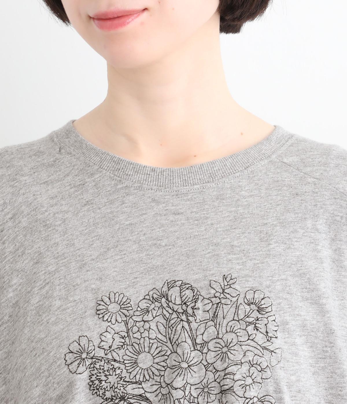 花束モチーフの刺しゅうをあしらい、やさしい華やぎを添えたTシャツです。ポンチョのようにゆったりと広がるワイドシルエットで、着るだけでこなれた印象に。身頃から続く袖のデザインにより動きやすく、リラックス感のある着心地も魅力です。コーディネートにほどよい個性をプラスできる一枚です。