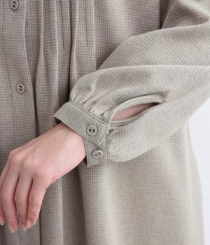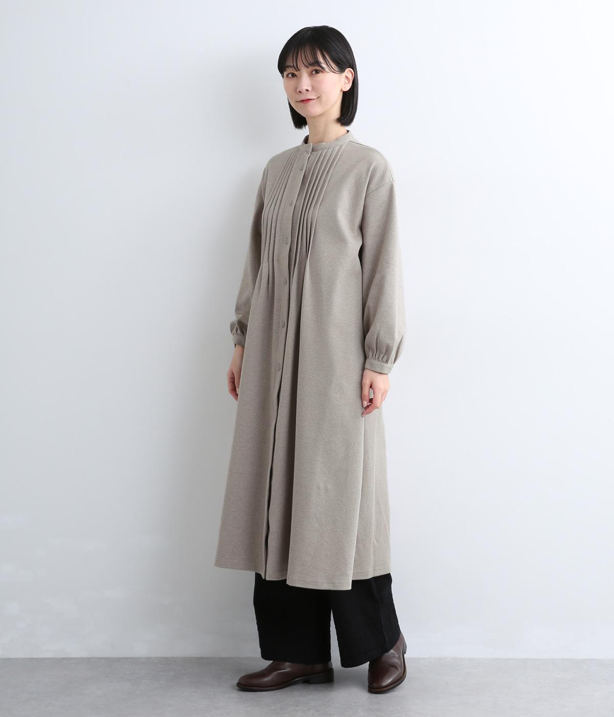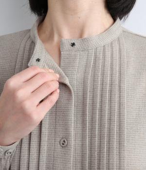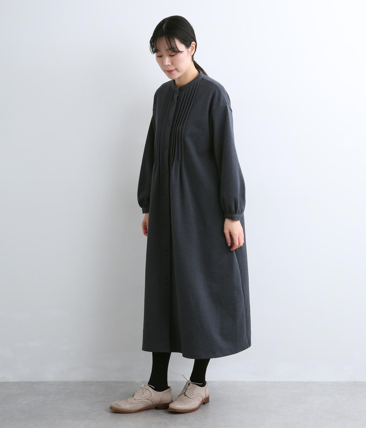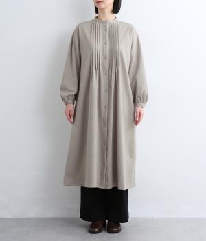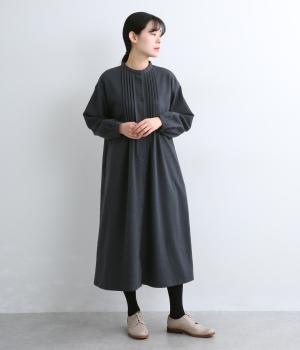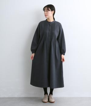 前面にほどこしたピンタックがきちんと感を演出するワンピース。タック下は優雅なドレープを描き、ふんわりと女性らしいシルエットです。袖のシルエットやくるみボタンでかわいらしさをプラスしました。