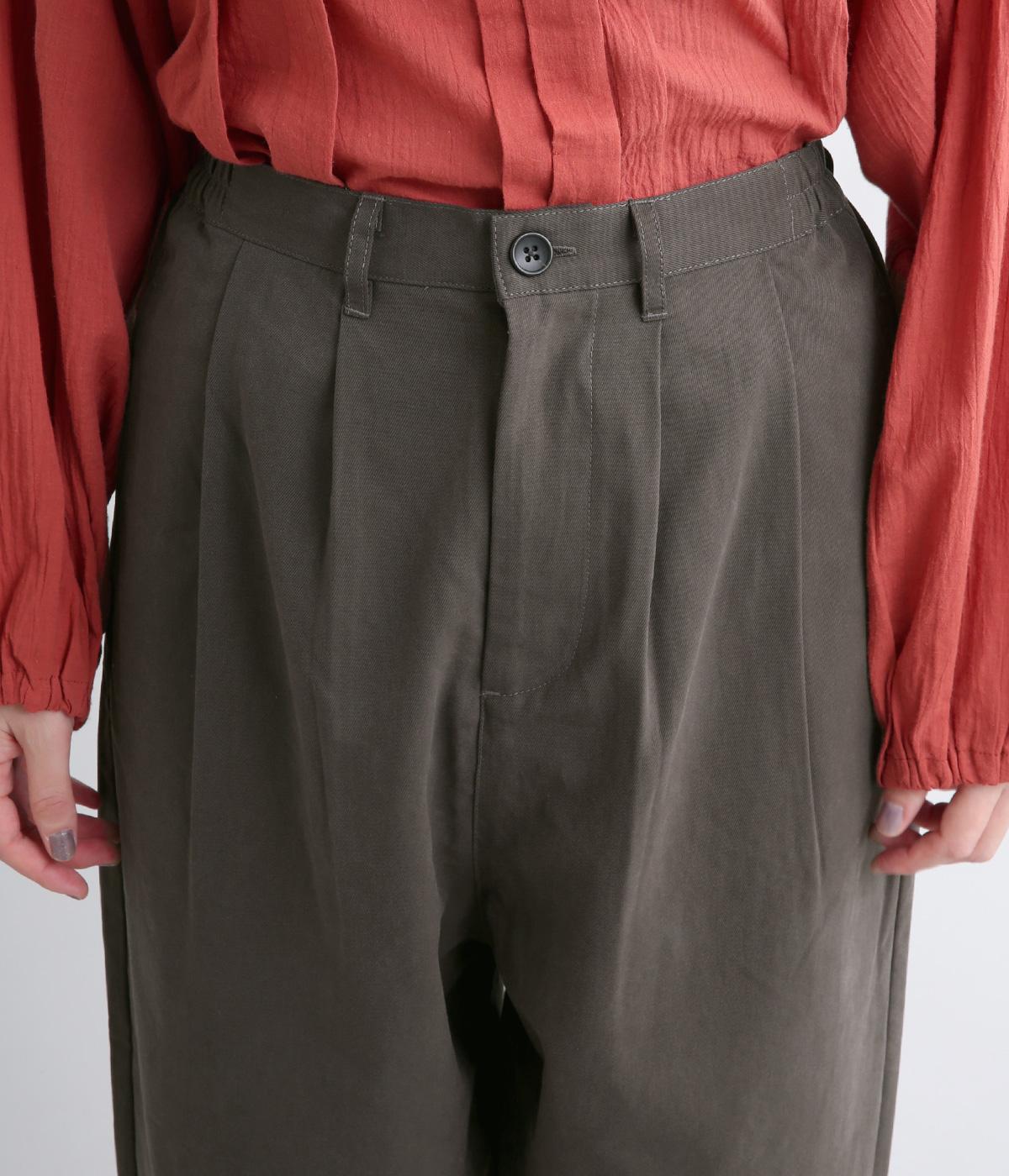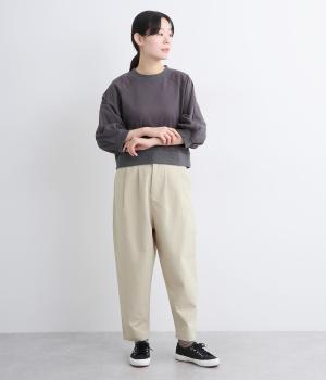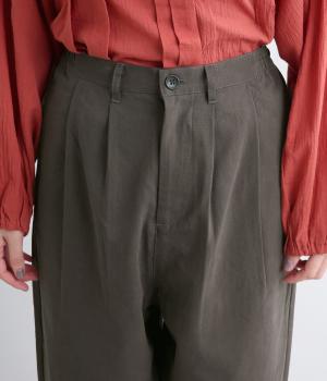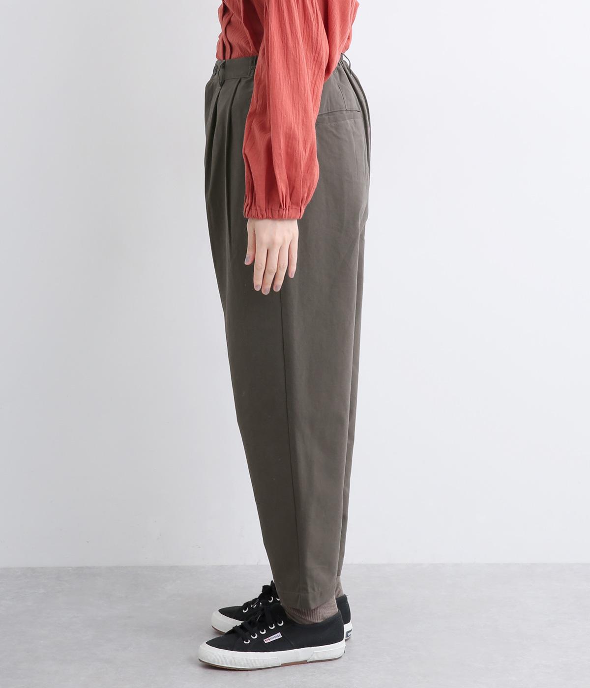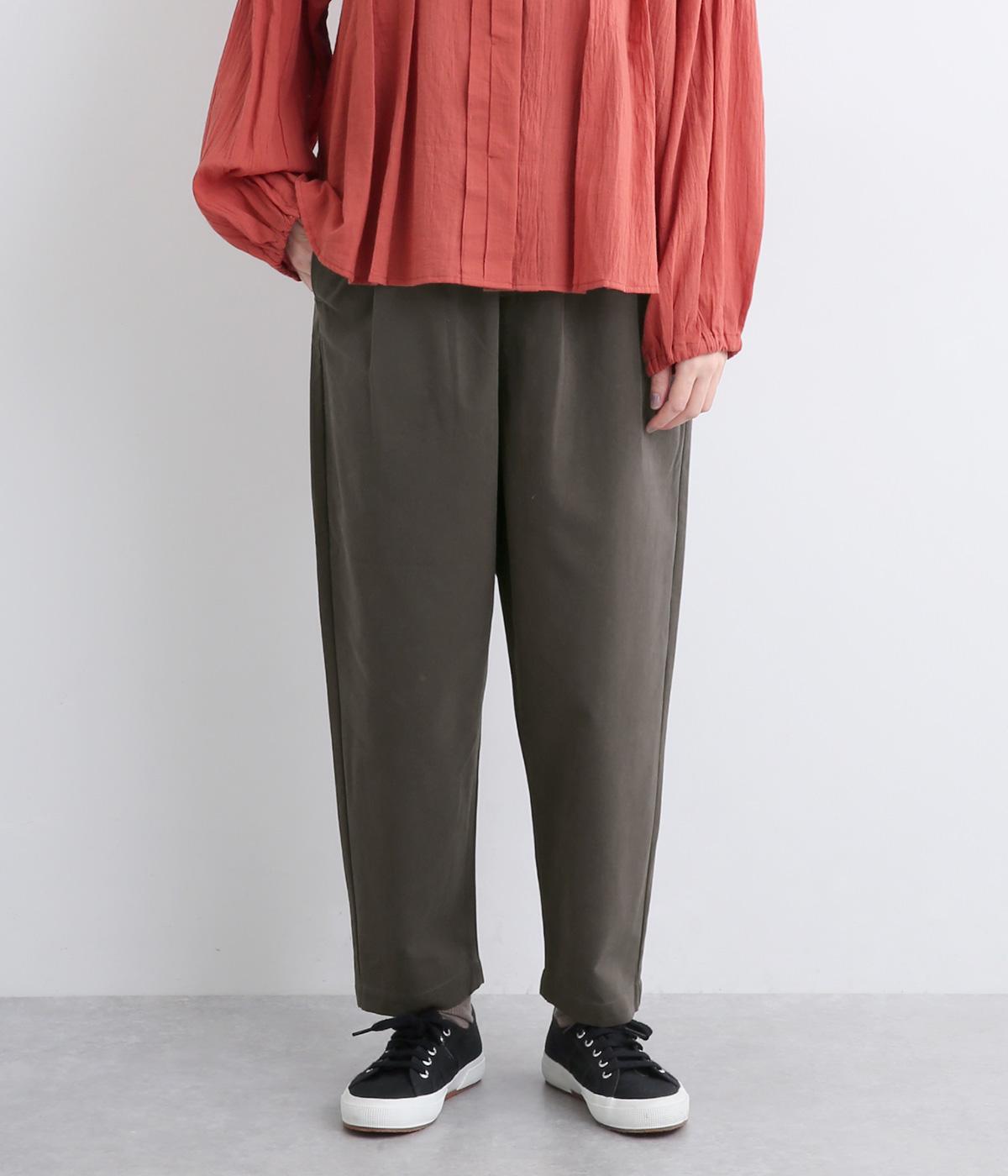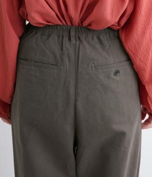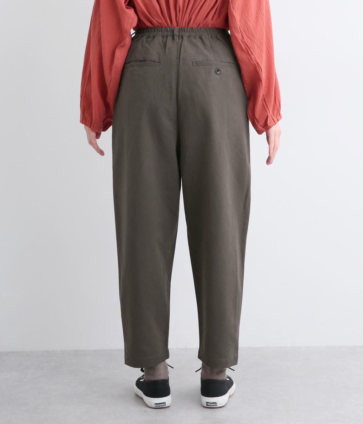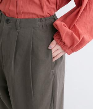 タックとテーパードシルエットですっきり見えするパンツです。フロントはボタンどめでウエストまわりをきれいに見せつつ、バックはゴム仕様で快適な履き心地に。しなやかなハリがきれいなラインを保ちます。
