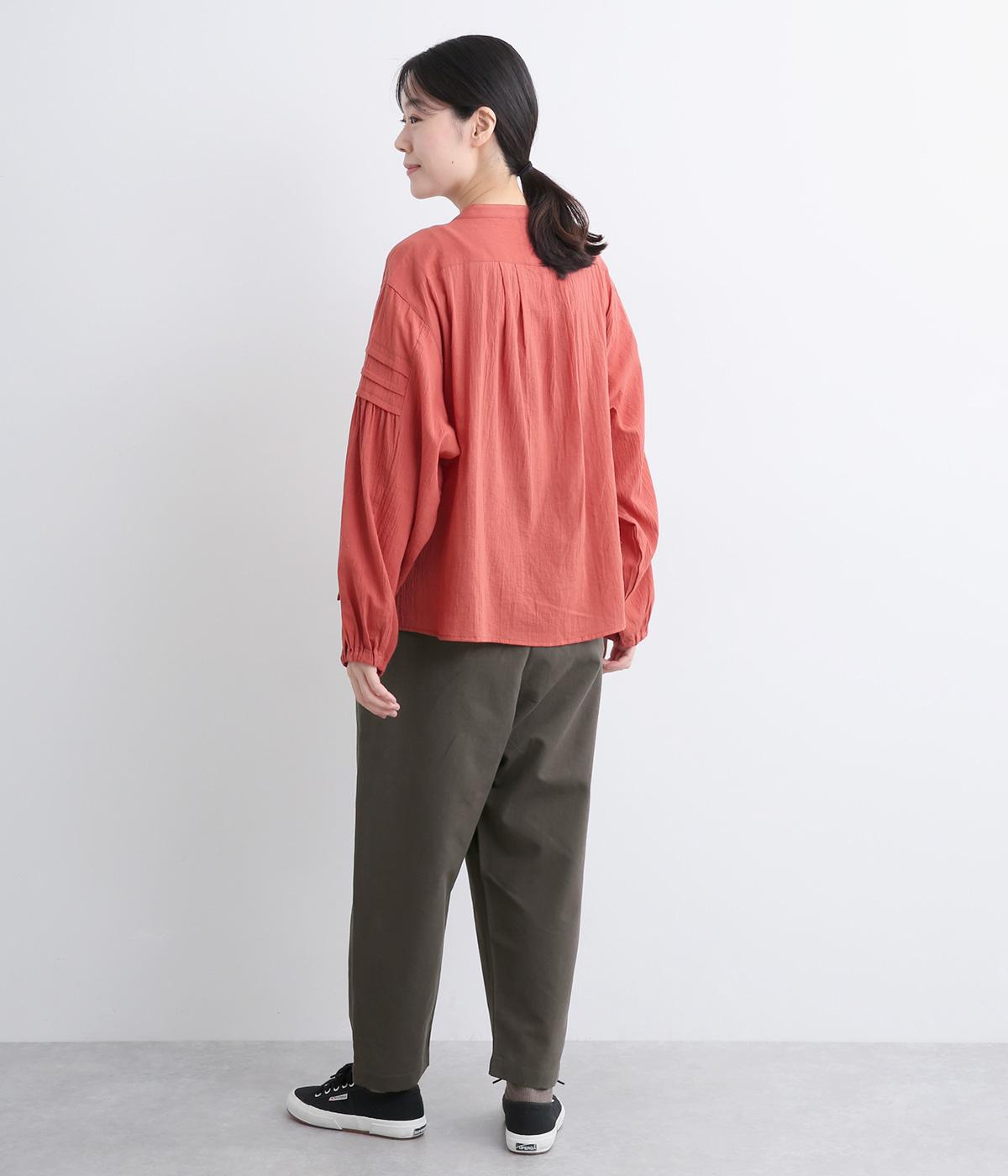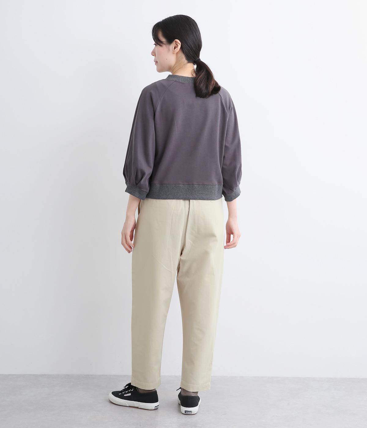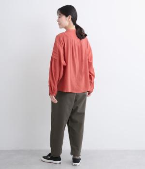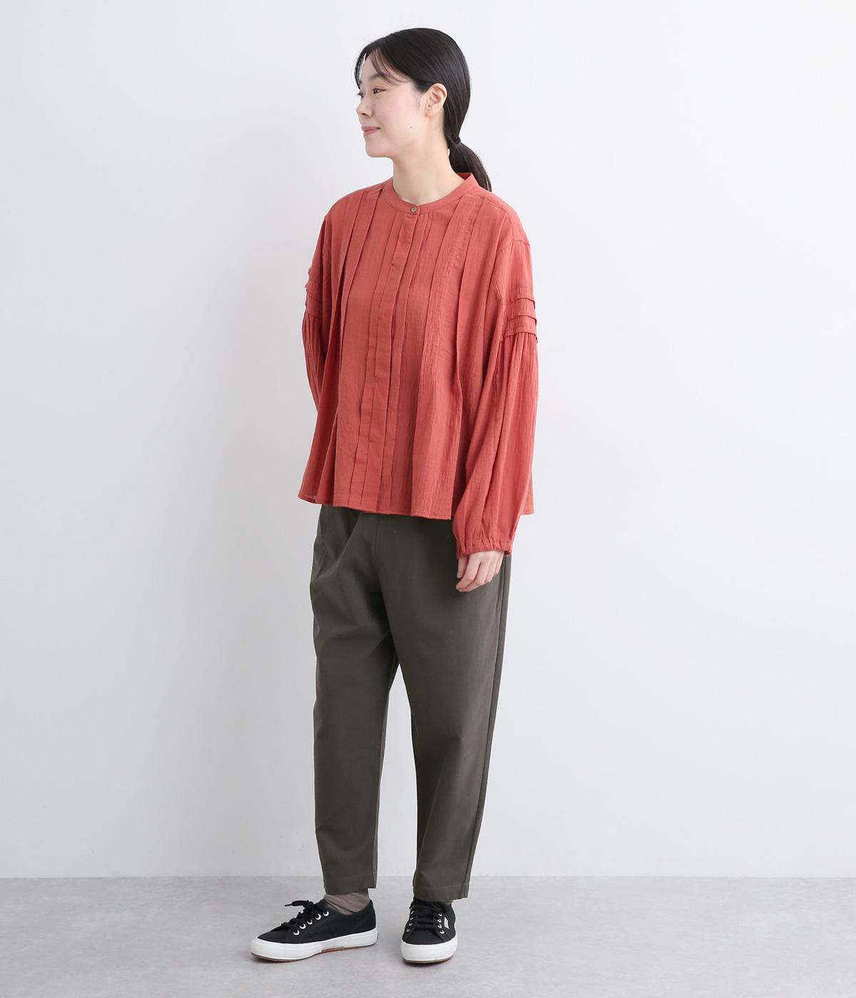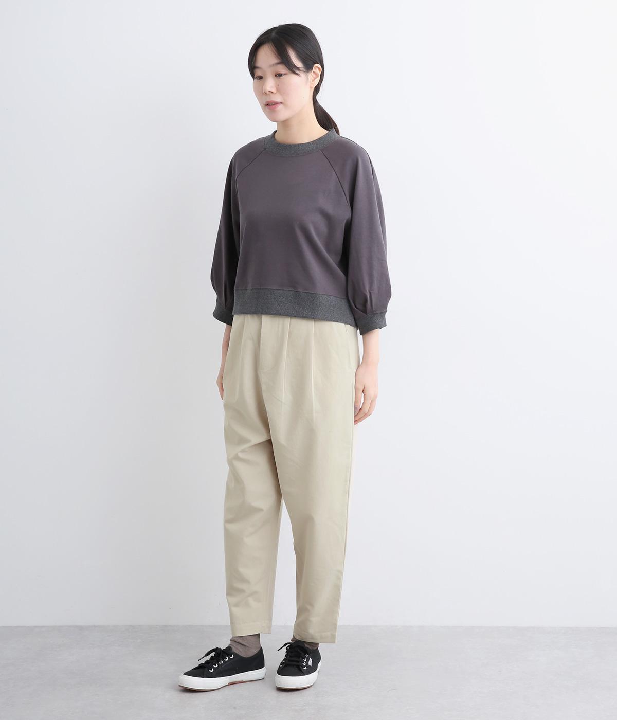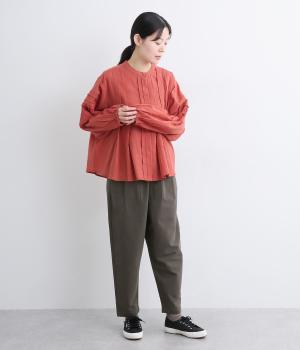 タックとテーパードシルエットですっきり見えするパンツです。フロントはボタンどめでウエストまわりをきれいに見せつつ、バックはゴム仕様で快適な履き心地に。しなやかなハリがきれいなラインを保ちます。