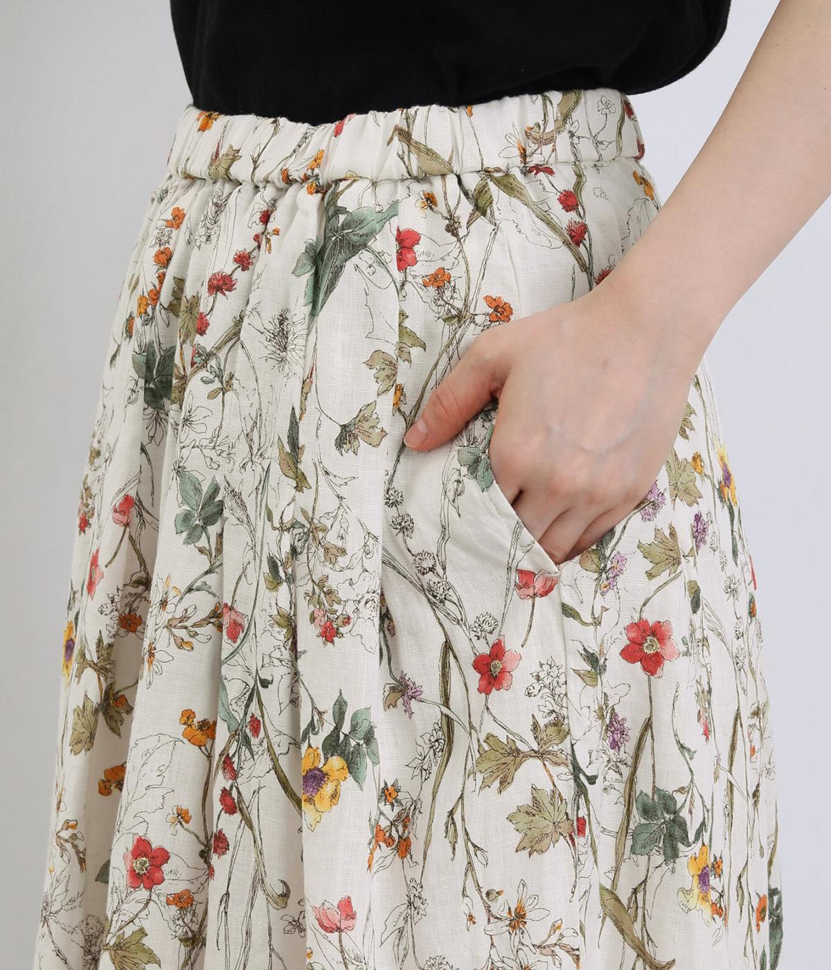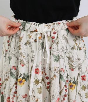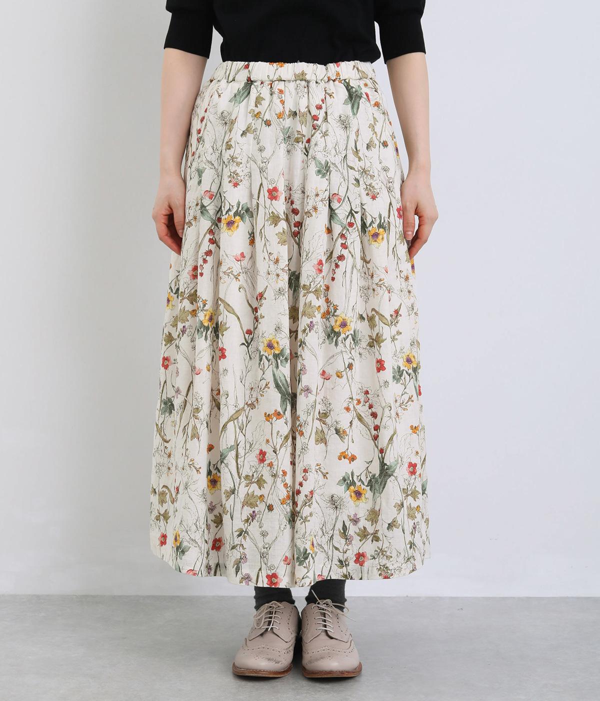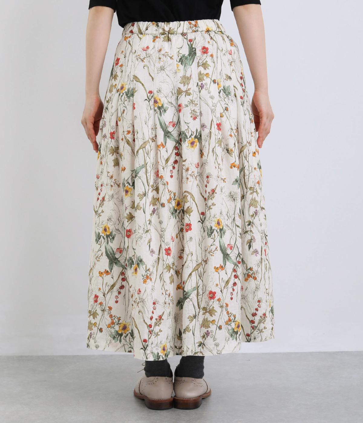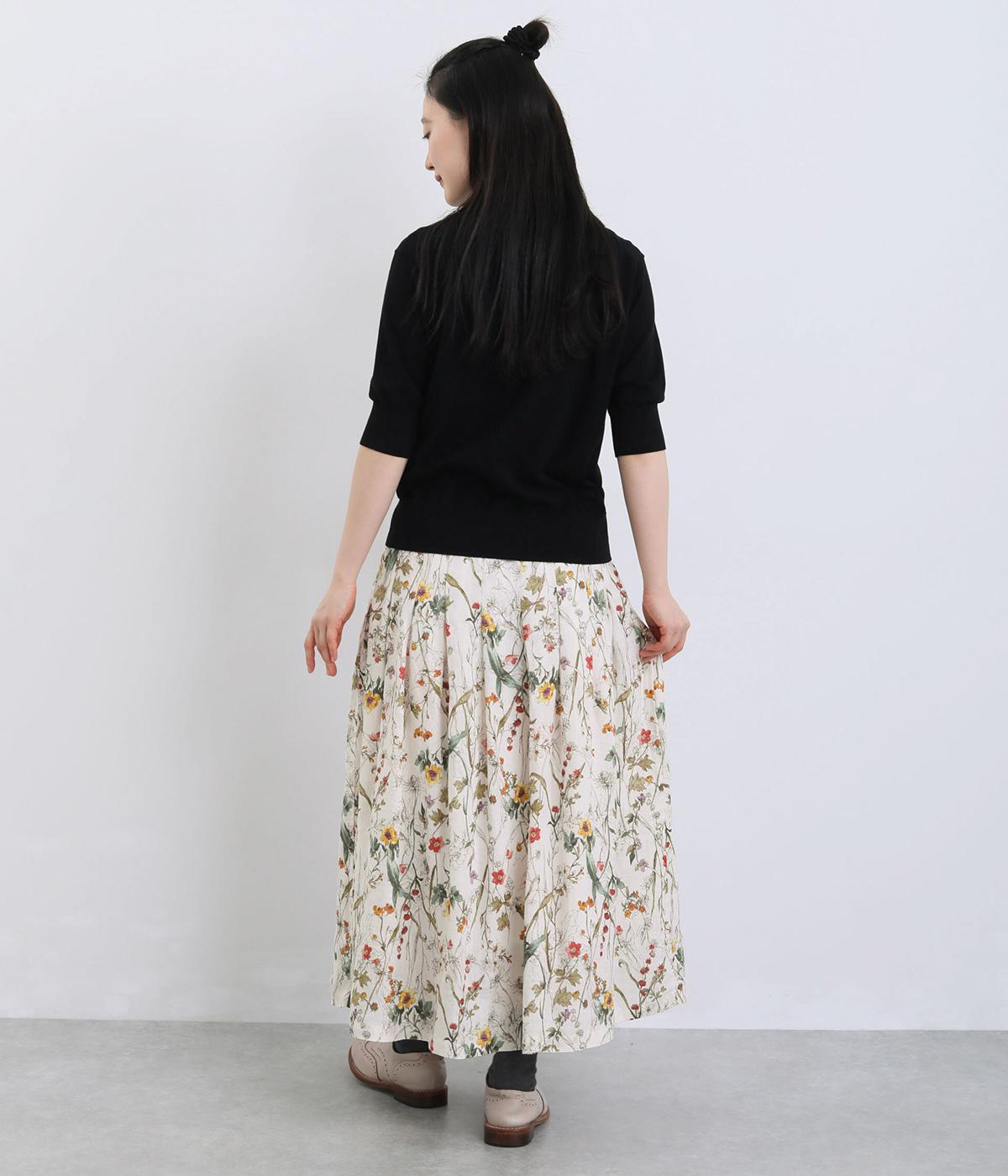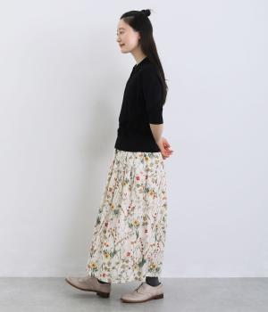 小花柄をちりばめた、水彩タッチのプリントがやさしい雰囲気を添えます。ウエストにたっぷりとタックを施し、ほどよいボリューム感のあるシルエットに仕上げました。裏地つきなので安心して着用できるのも◎。コーディネートに自然な華やかさをプラスしてくれる一枚です。