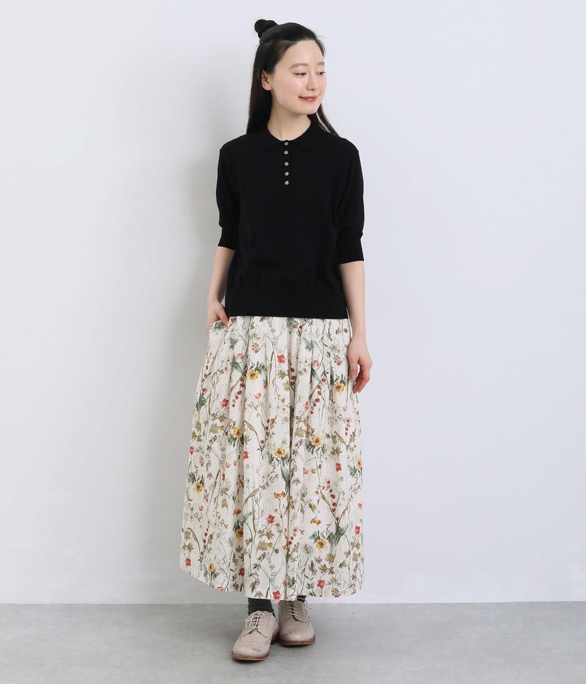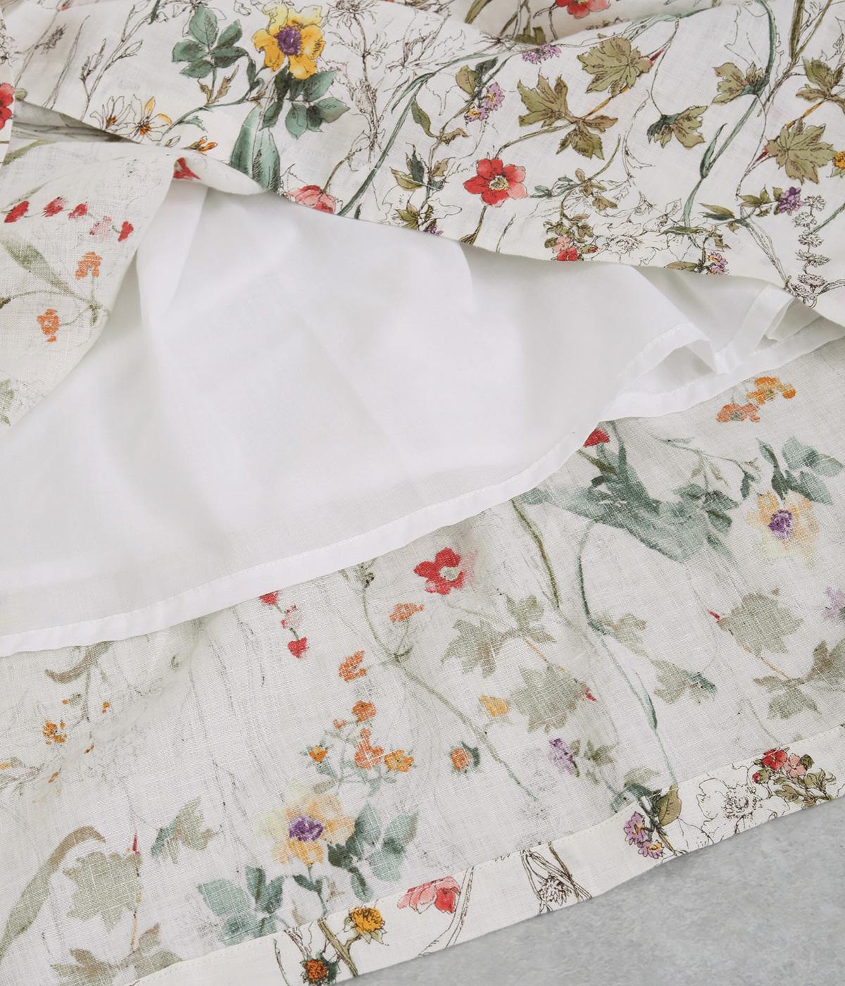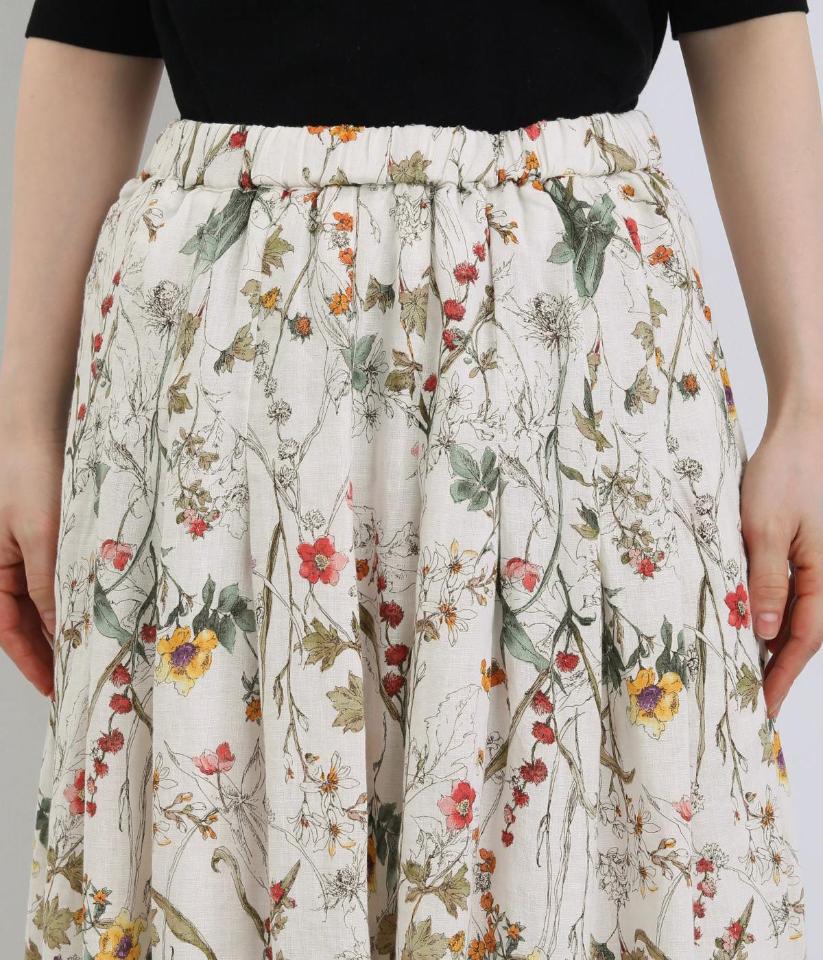小花柄をちりばめた、水彩タッチのプリントがやさしい雰囲気を添えます。ウエストにたっぷりとタックを施し、ほどよいボリューム感のあるシルエットに仕上げました。裏地つきなので安心して着用できるのも◎。コーディネートに自然な華やかさをプラスしてくれる一枚です。