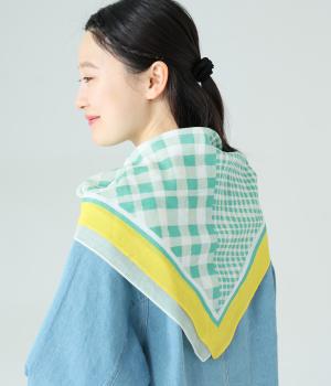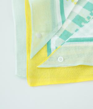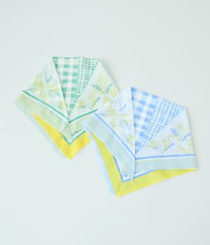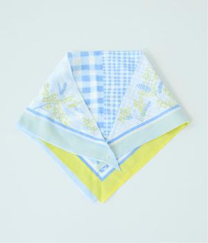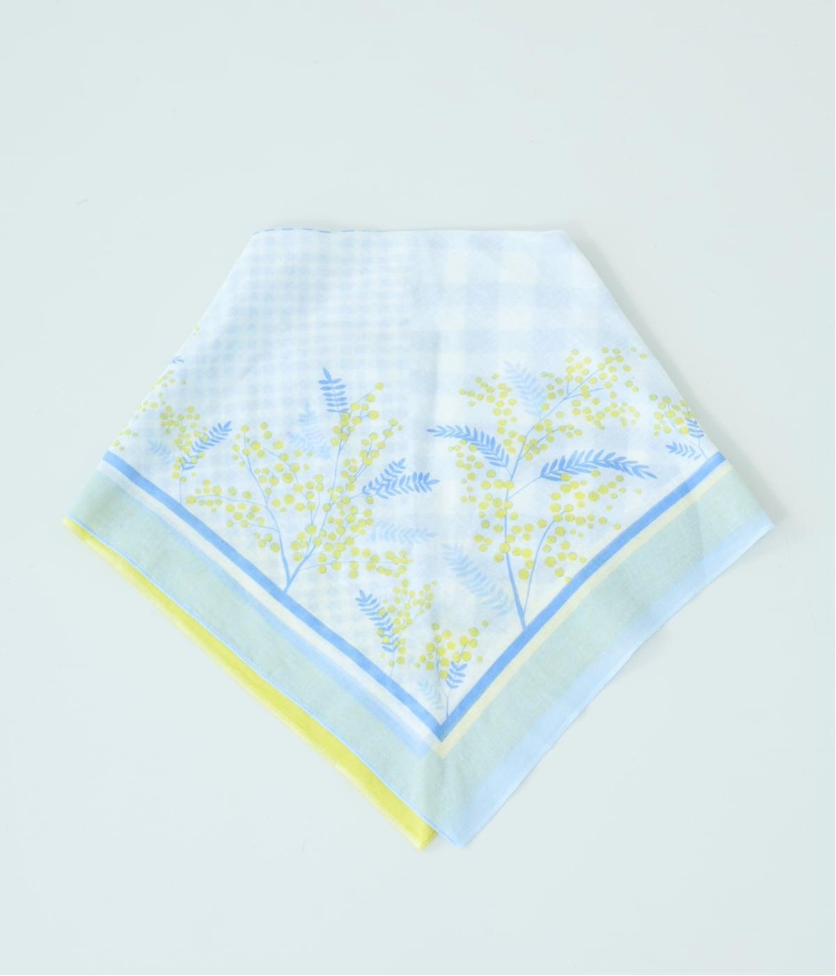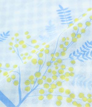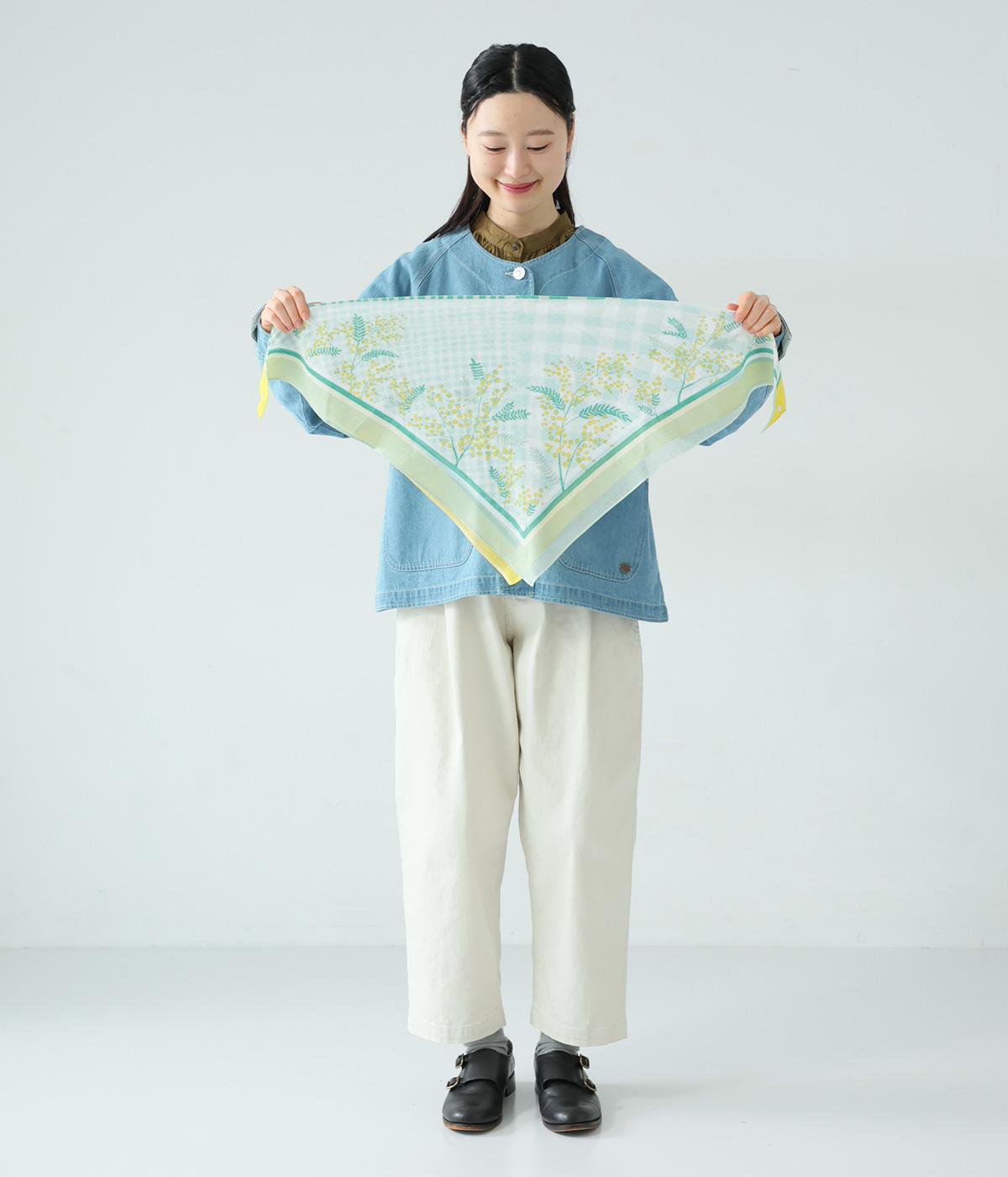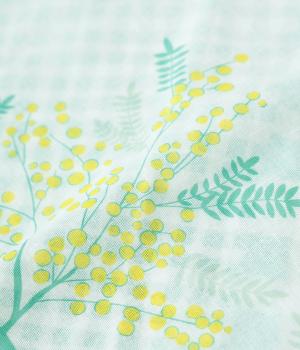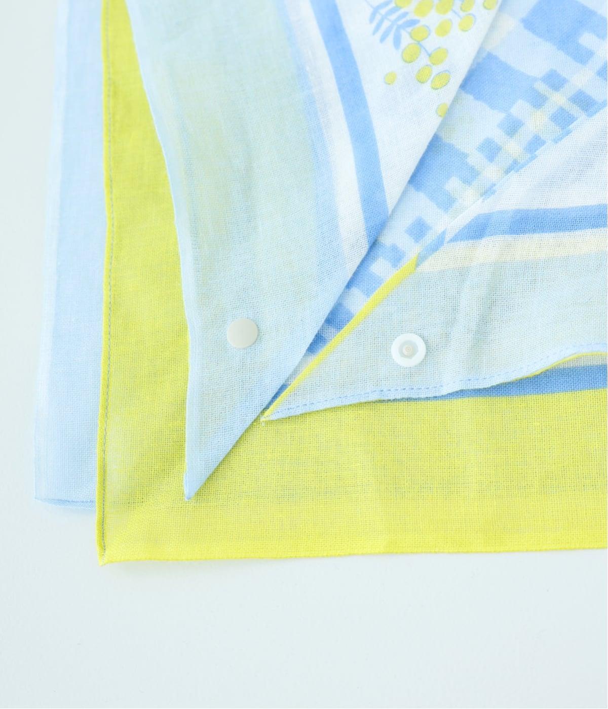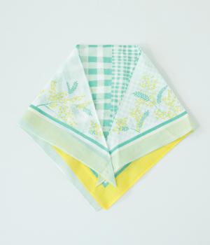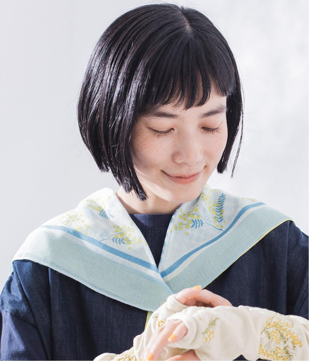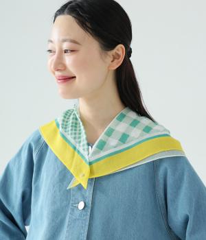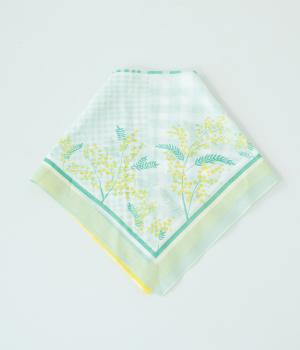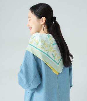 ミモザ柄が首もとにやさしい彩りを添えるスカーフ。ボタン式のワンタッチで着脱でき、巻き方に迷わず手軽にアレンジが楽しめます。紫外線から首もとをガードし、風に飛ばされにくいのもうれしいポイントです。