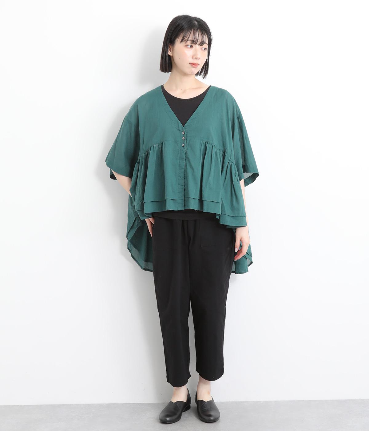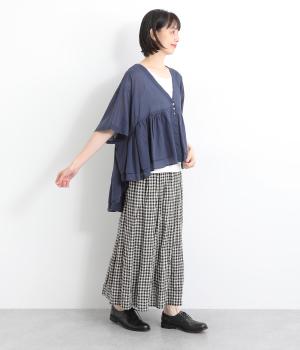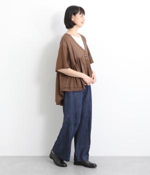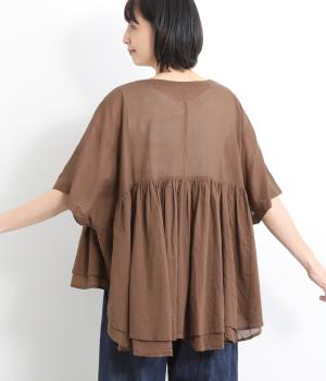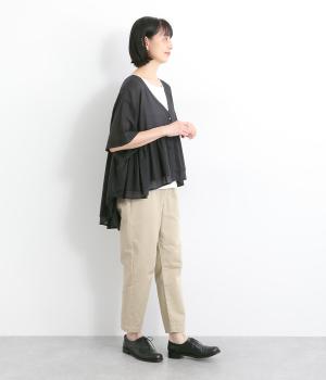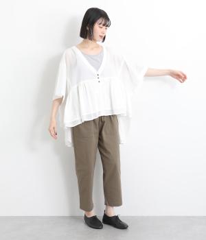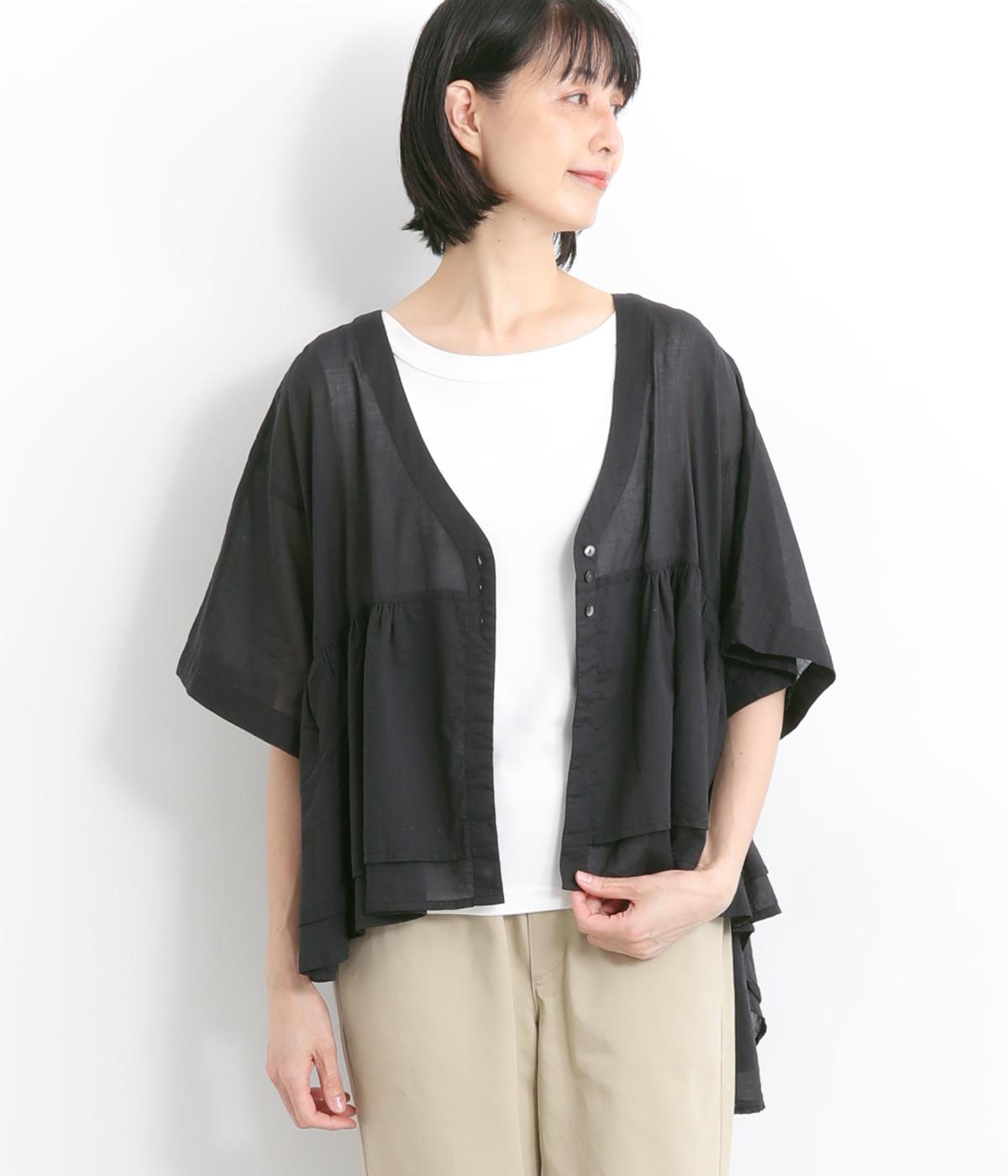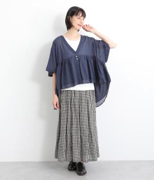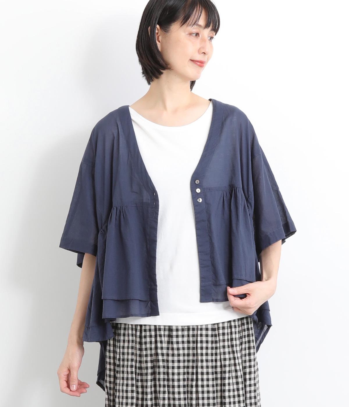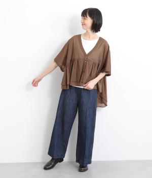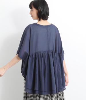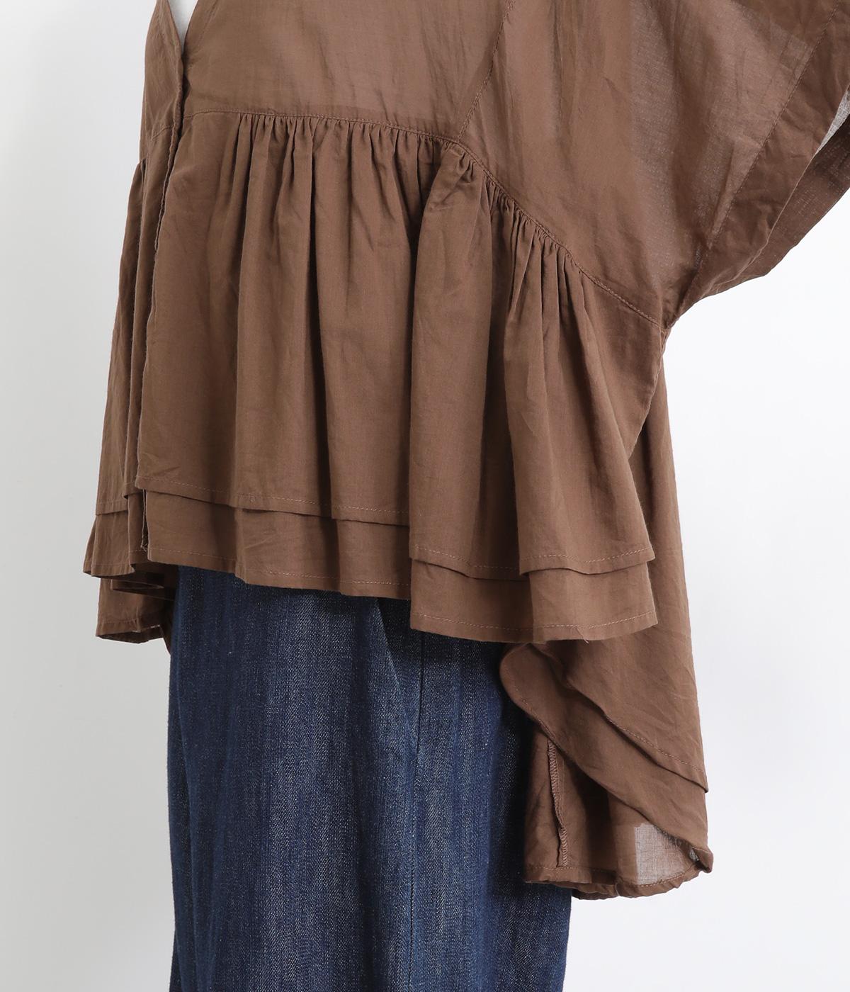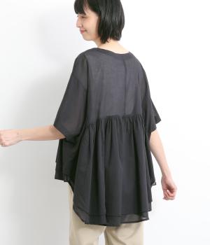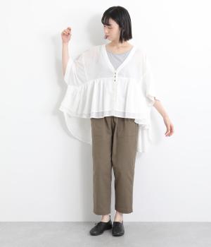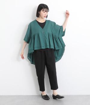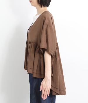 ギャザーをたっぷり入れたフレア感と、前後で丈感に変化を出した動きのあるシルエットが特徴的。シンプルな装いに羽織るだけでコーディネートをぐっと華やかに魅せてくれます。合わせるインナーによってロングシーズン着まわせます。