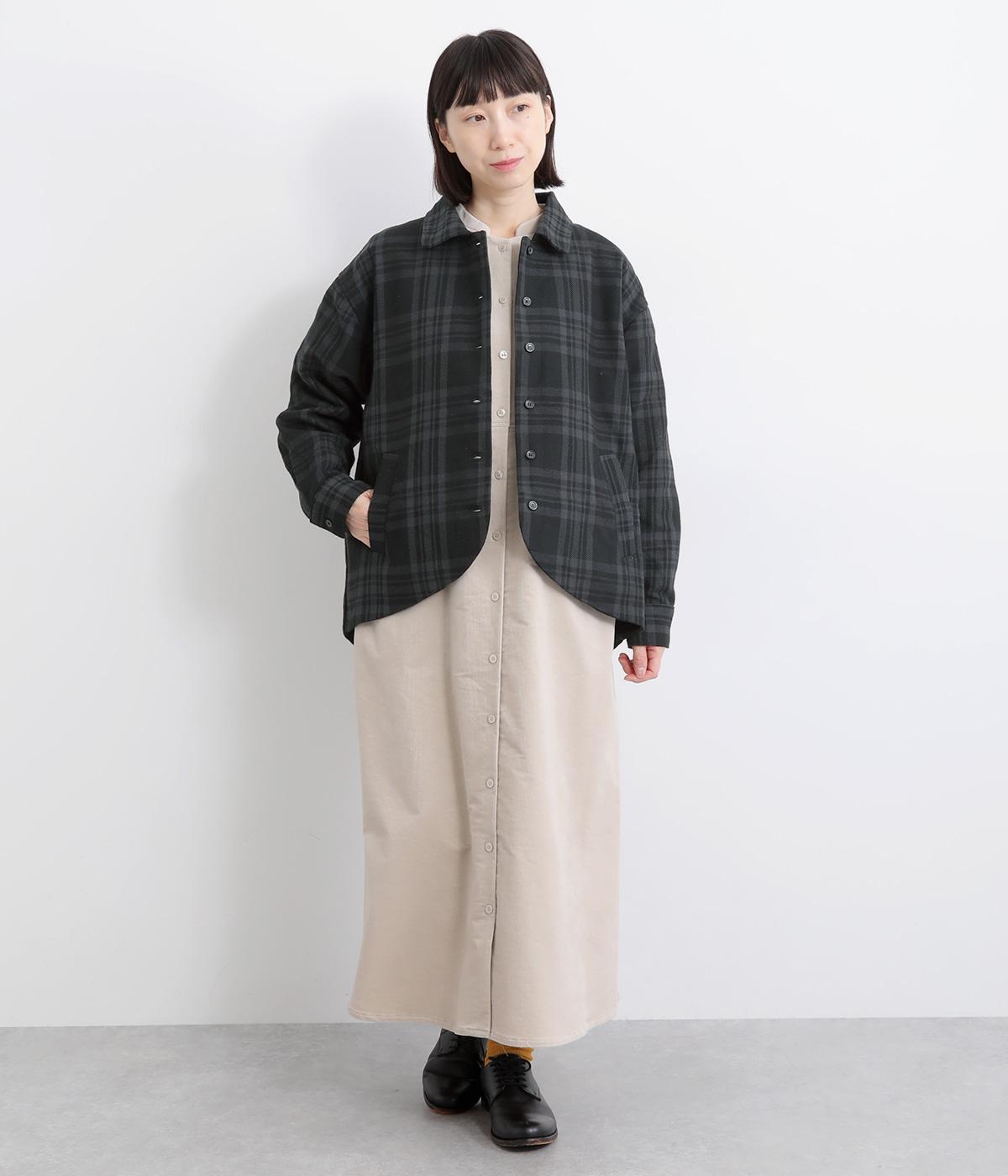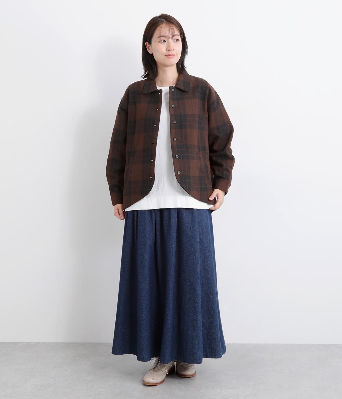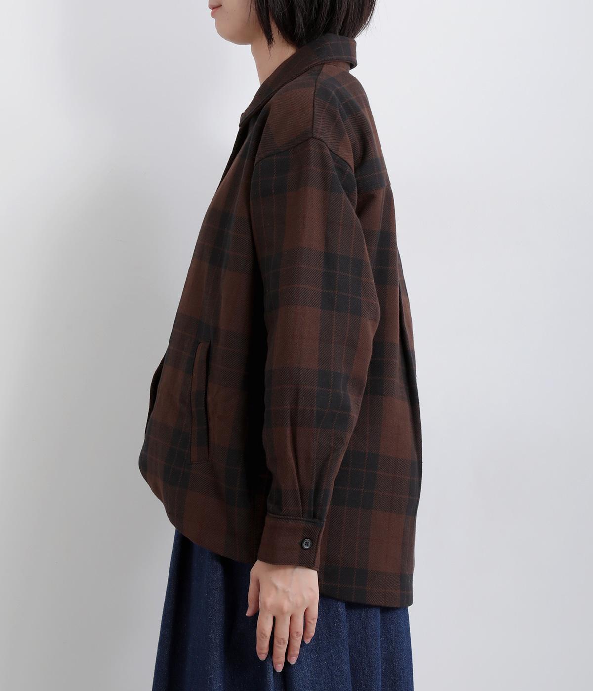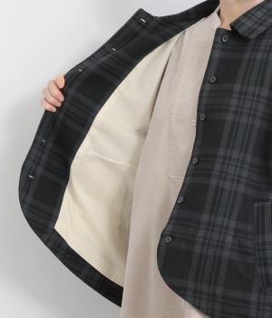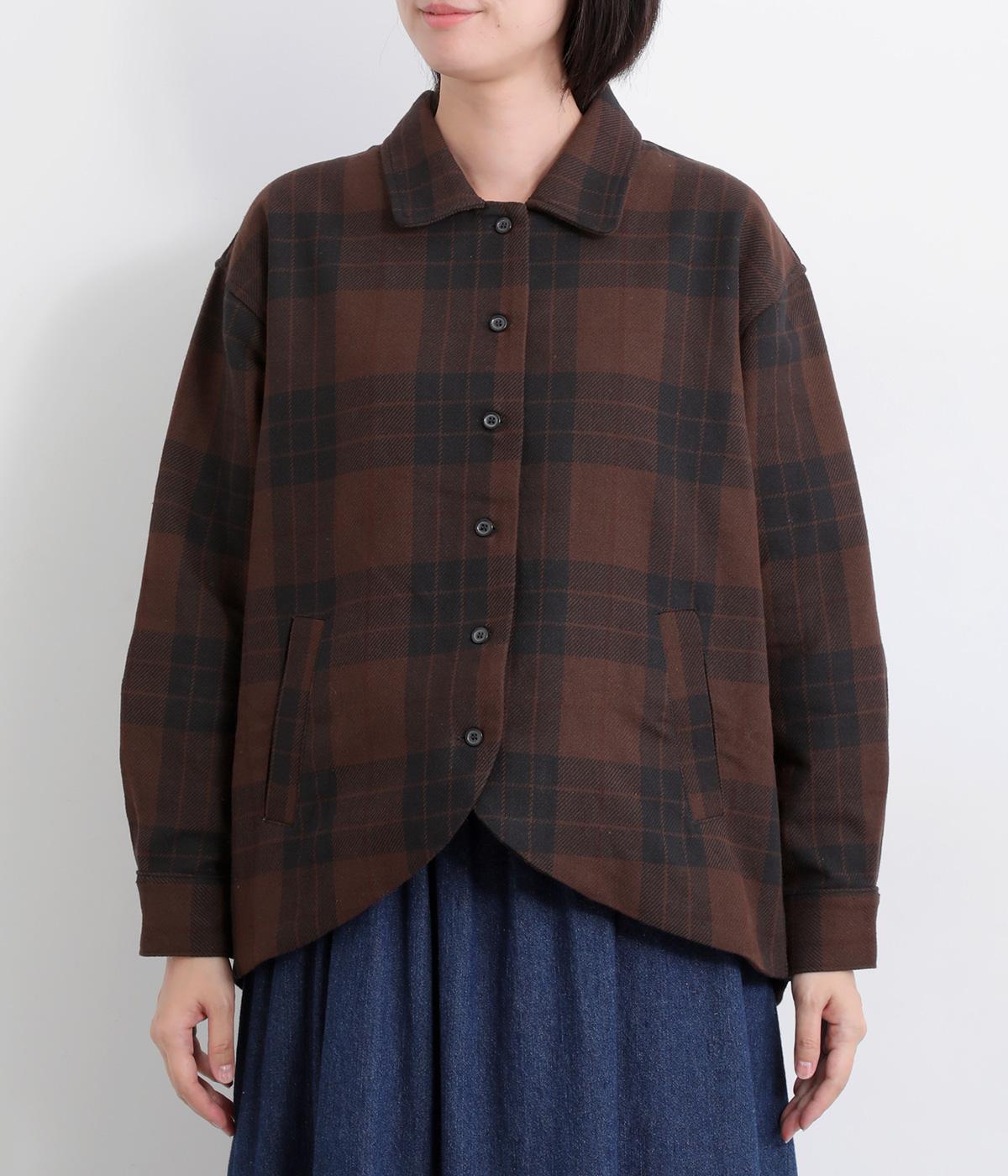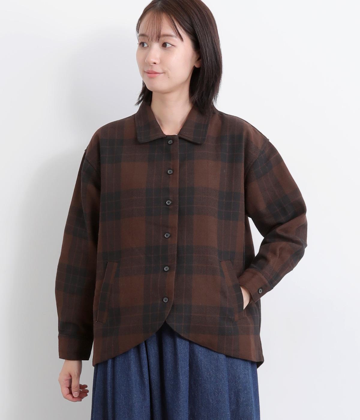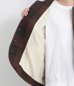 クラシカルな雰囲気が目を惹くチェックジャケットは前立てから裾に向けて流れるようなヘムラインが特徴的。後ろ身頃は長めにしているので横姿もきれいに見えます。肌寒い季節の変わり目のライトアウターとしても活躍。