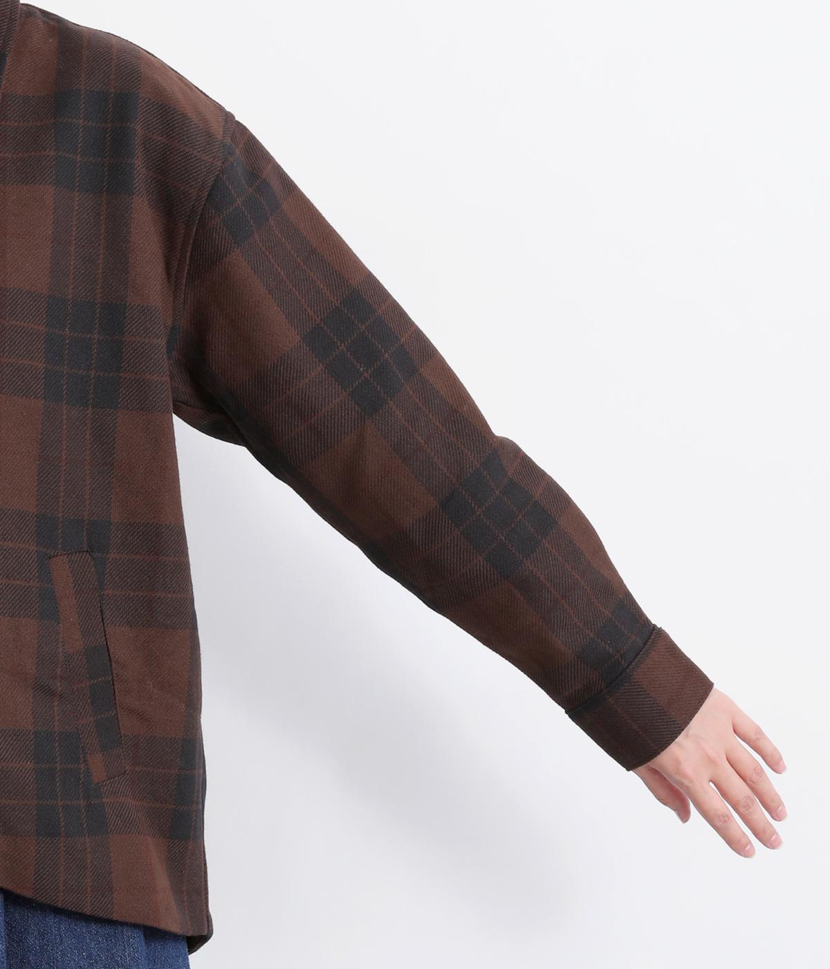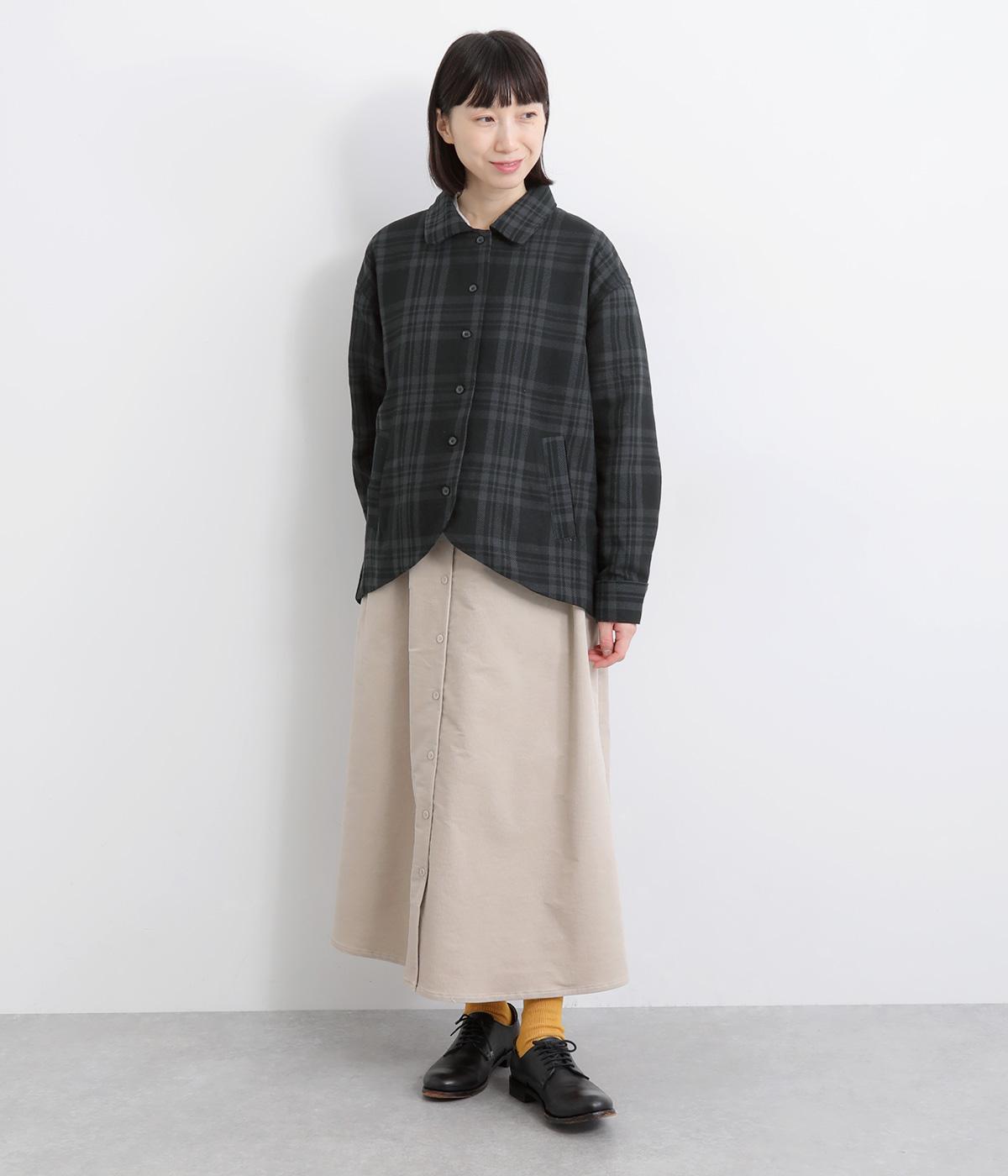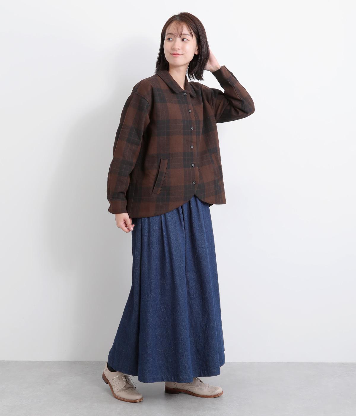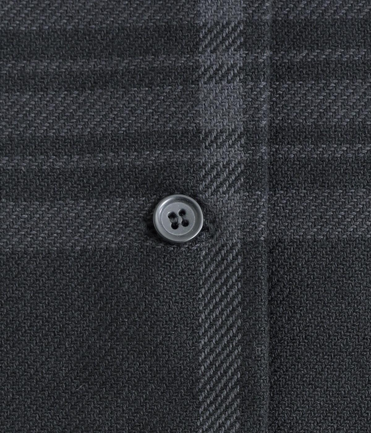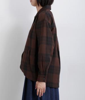 クラシカルな雰囲気が目を惹くチェックジャケットは前立てから裾に向けて流れるようなヘムラインが特徴的。後ろ身頃は長めにしているので横姿もきれいに見えます。肌寒い季節の変わり目のライトアウターとしても活躍。
