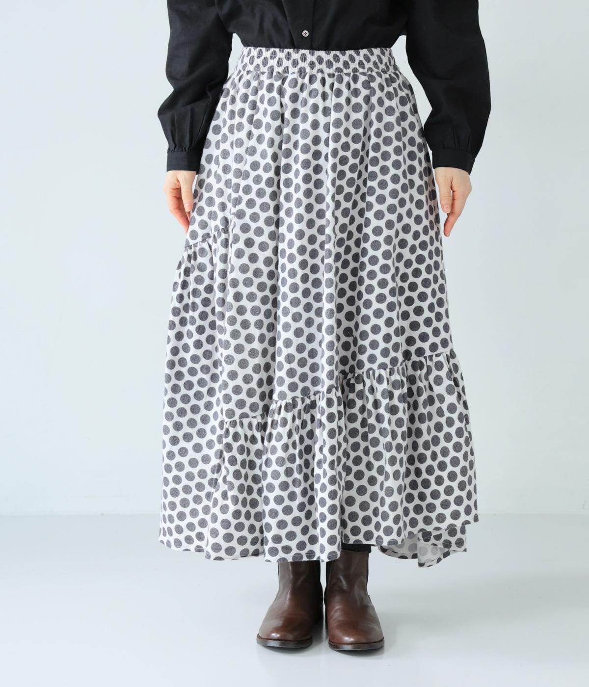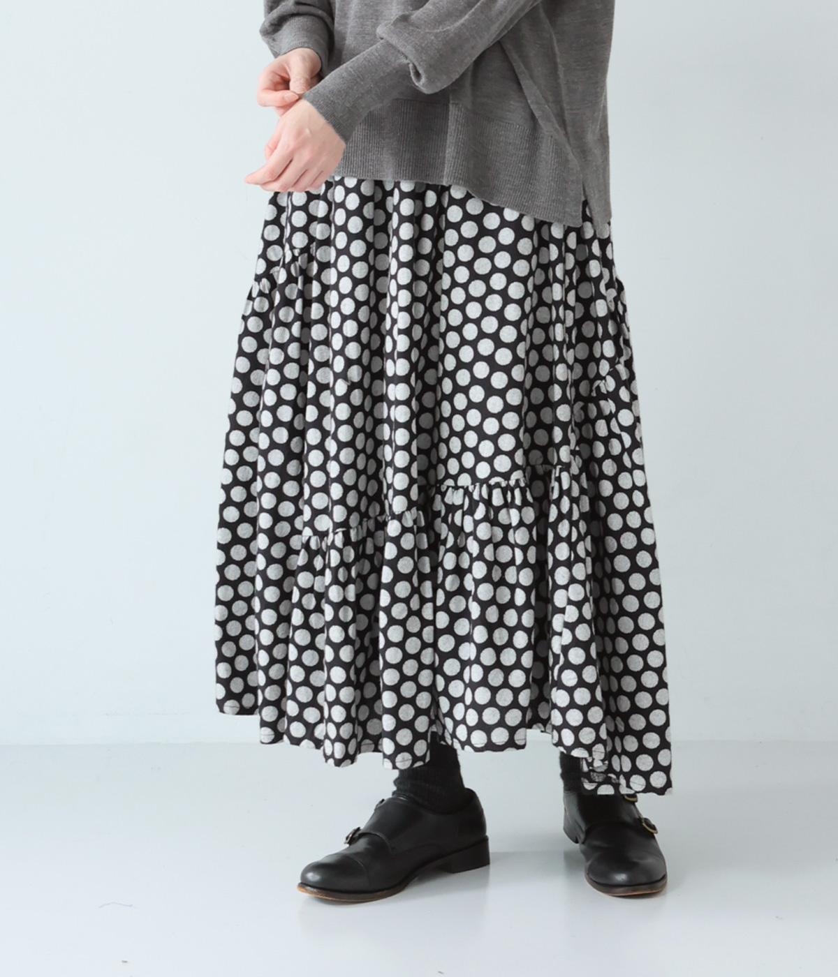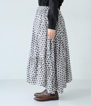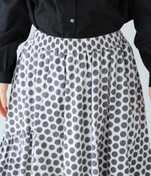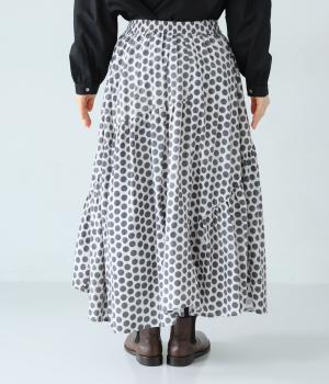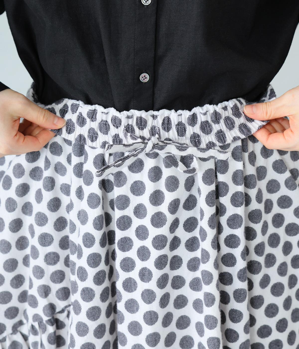 ランダムな切り替えにたっぷりとギャザーを施したティアードスカート。ボリュームがかわいらしく、シンプルなシャツやニットと合わせるだけでスタイリングが完成します。ウエストは総ゴム仕様で、リラックスしたはき心地。内側のヒモでフィット感の調節も可能です。
