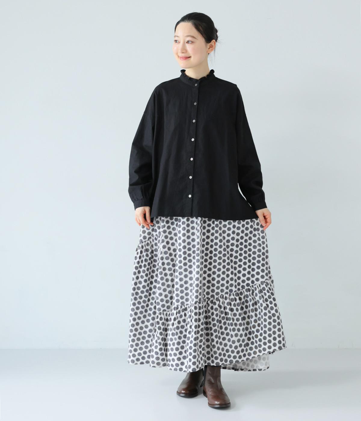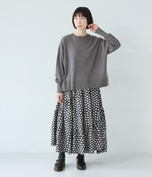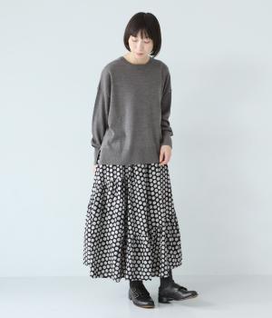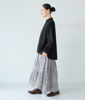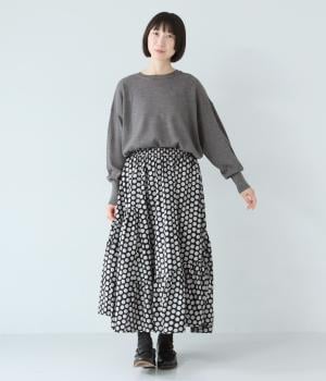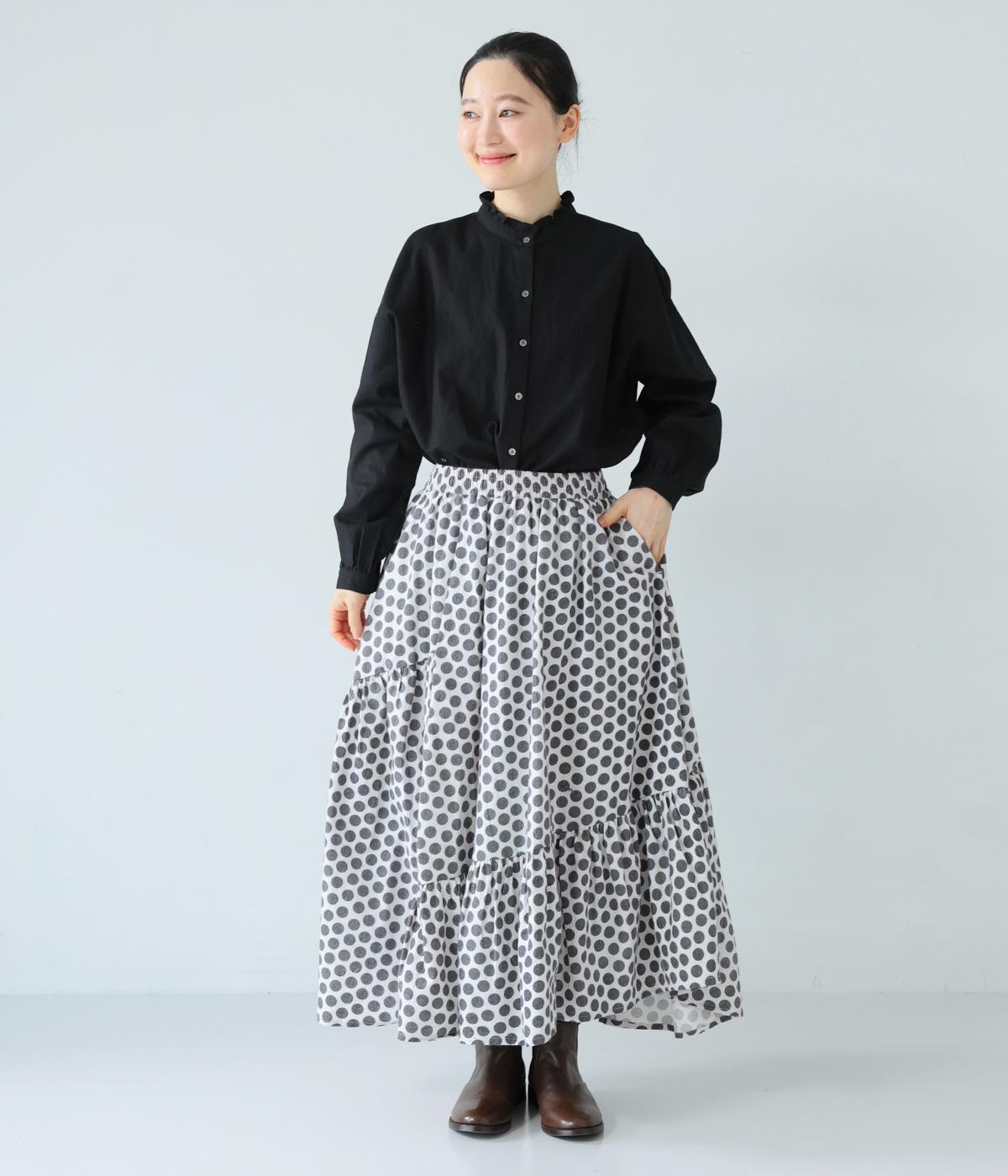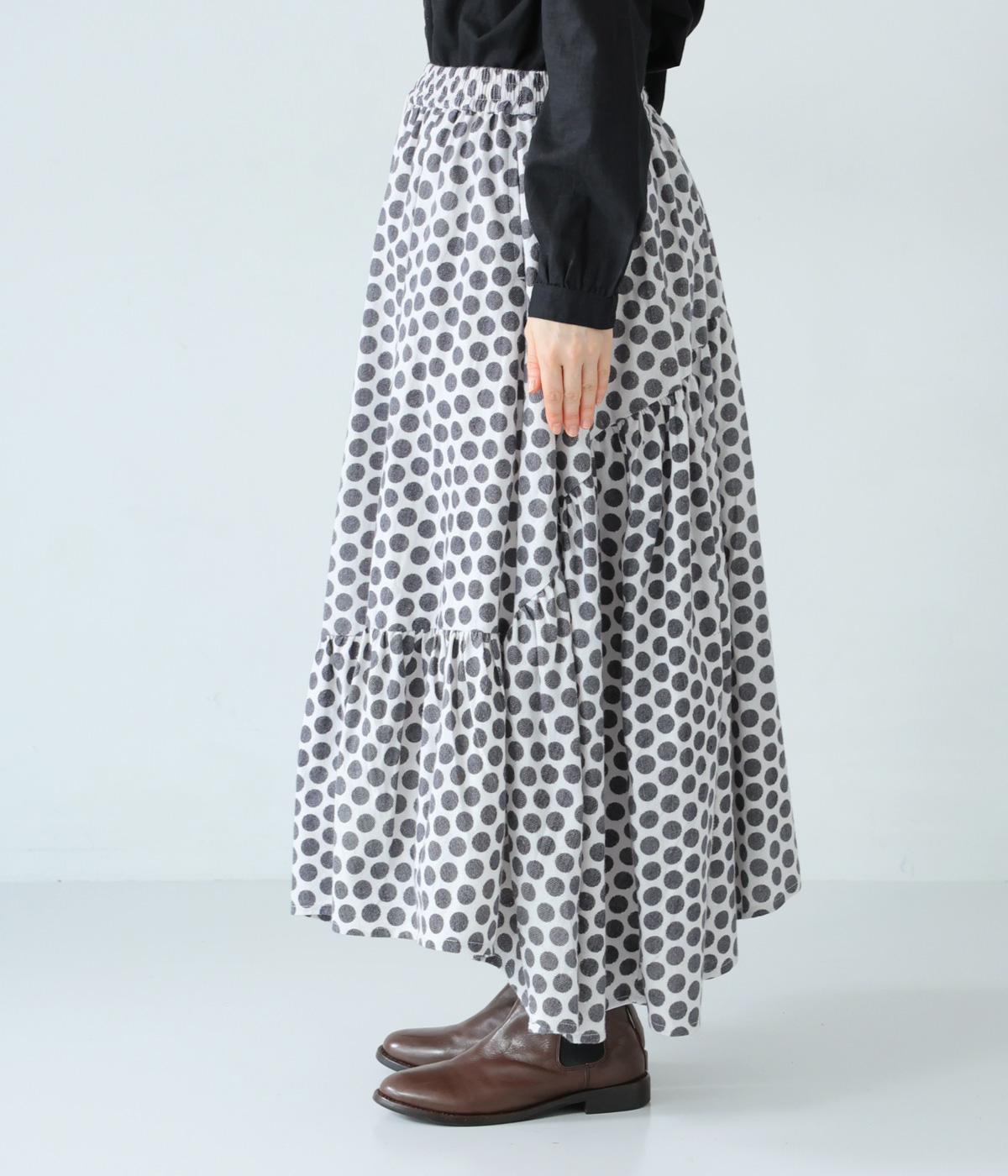 ランダムな切り替えにたっぷりとギャザーを施したティアードスカート。ボリュームがかわいらしく、シンプルなシャツやニットと合わせるだけでスタイリングが完成します。ウエストは総ゴム仕様で、リラックスしたはき心地。内側のヒモでフィット感の調節も可能です。