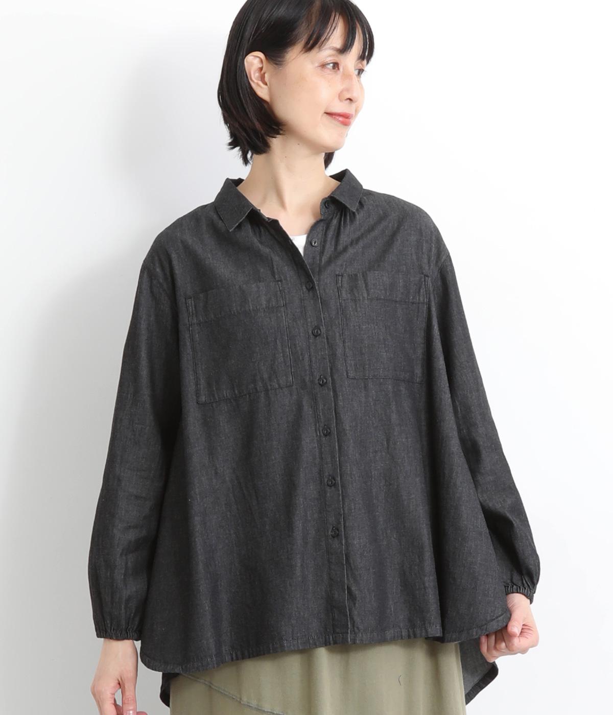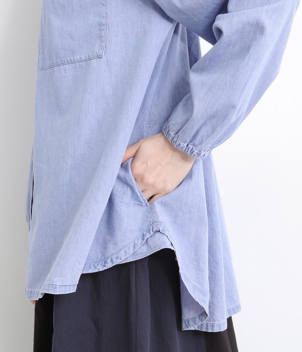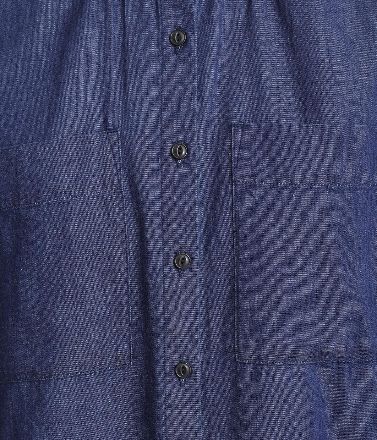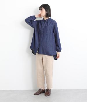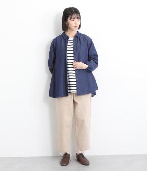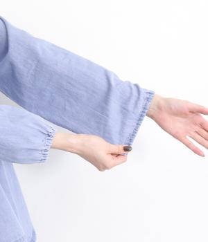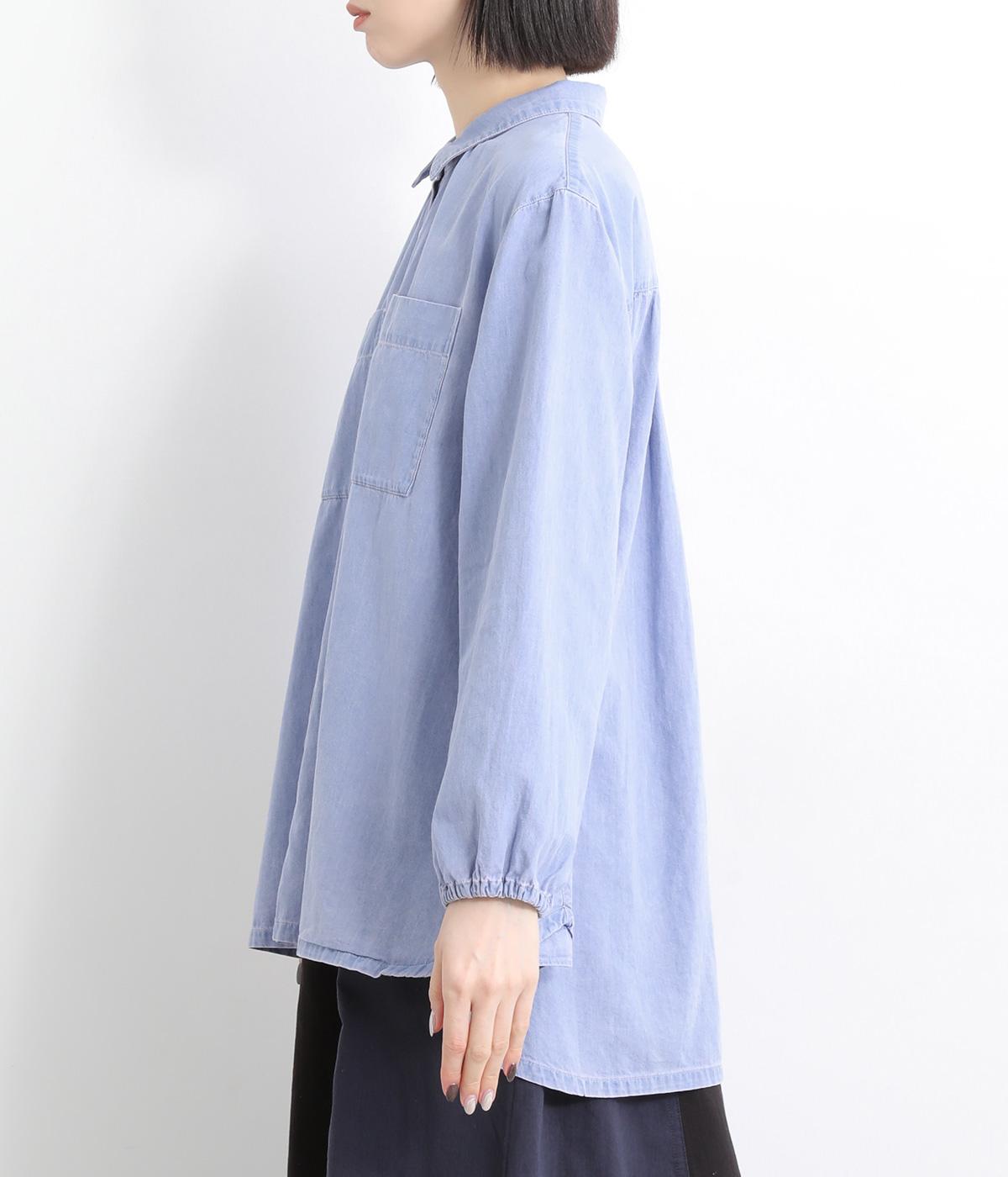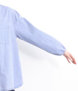 フレア感のあるシルエットや丸みのある袖でカジュアル感をおさえ、幅広いテイストに着こなせる一枚。袖口はゴムを入れているのでたくし上げもしやすく、手仕事のときにも便利です。大きめの胸ポケットもワンポイントに。