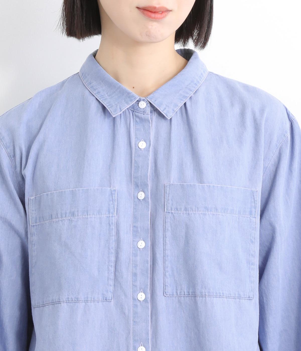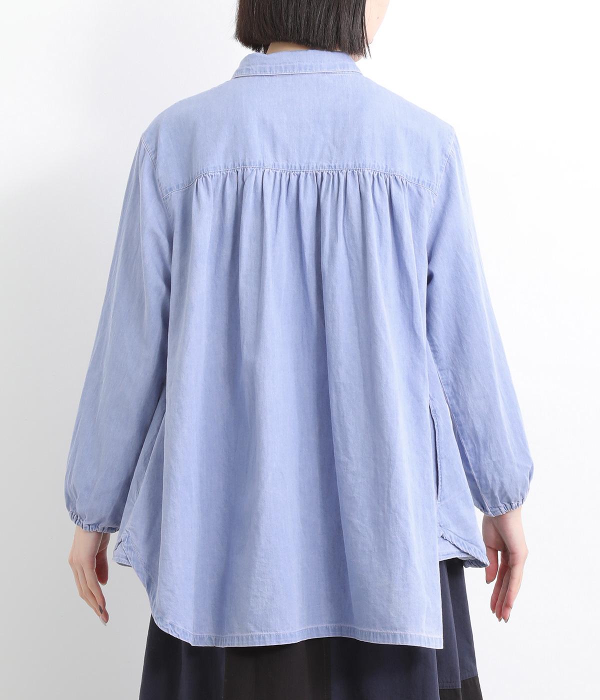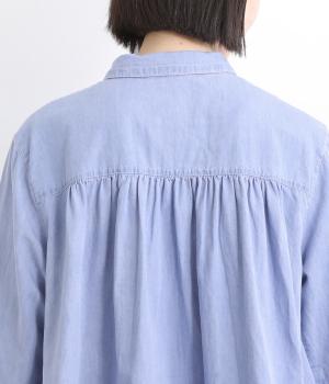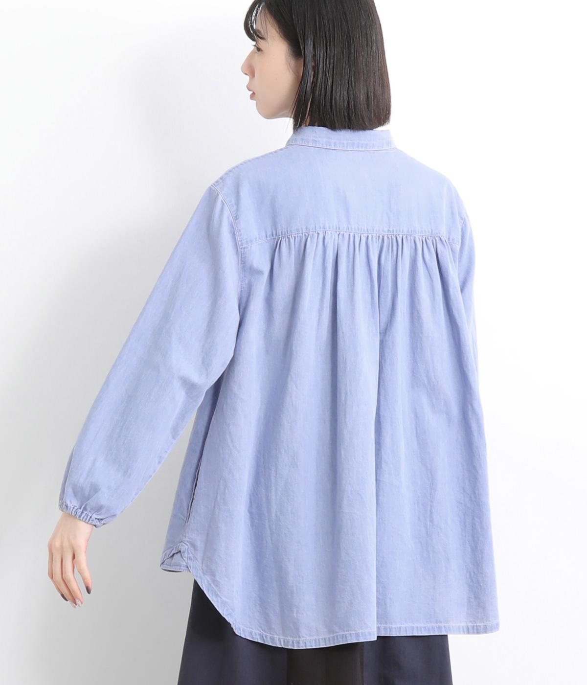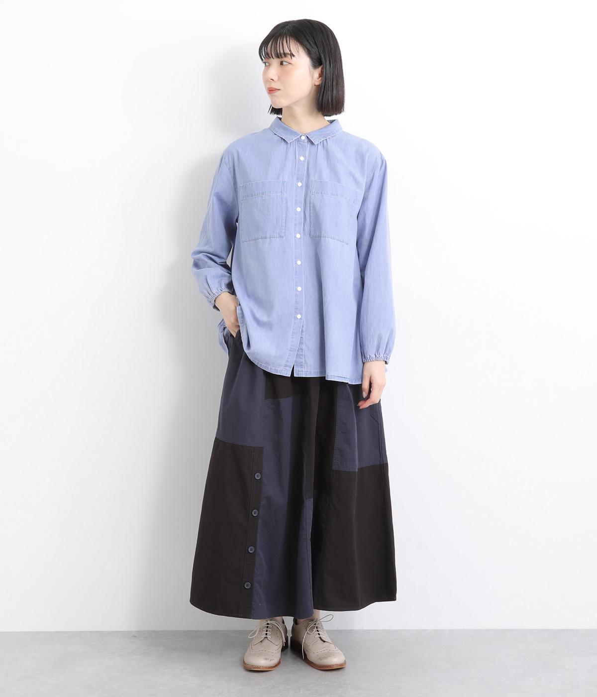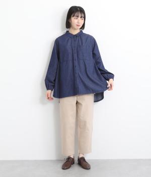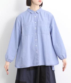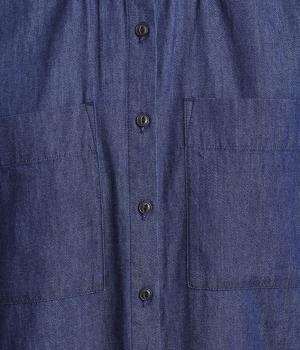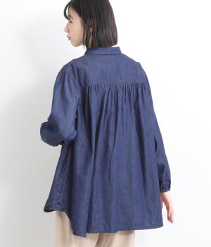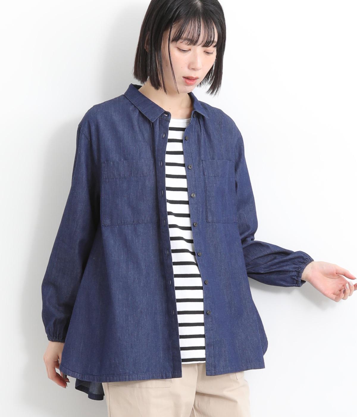フレア感のあるシルエットや丸みのある袖でカジュアル感をおさえ、幅広いテイストに着こなせる一枚。袖口はゴムを入れているのでたくし上げもしやすく、手仕事のときにも便利です。大きめの胸ポケットもワンポイントに。