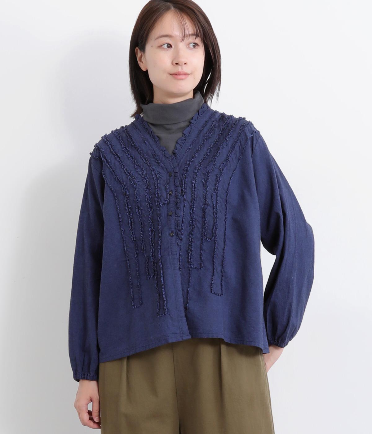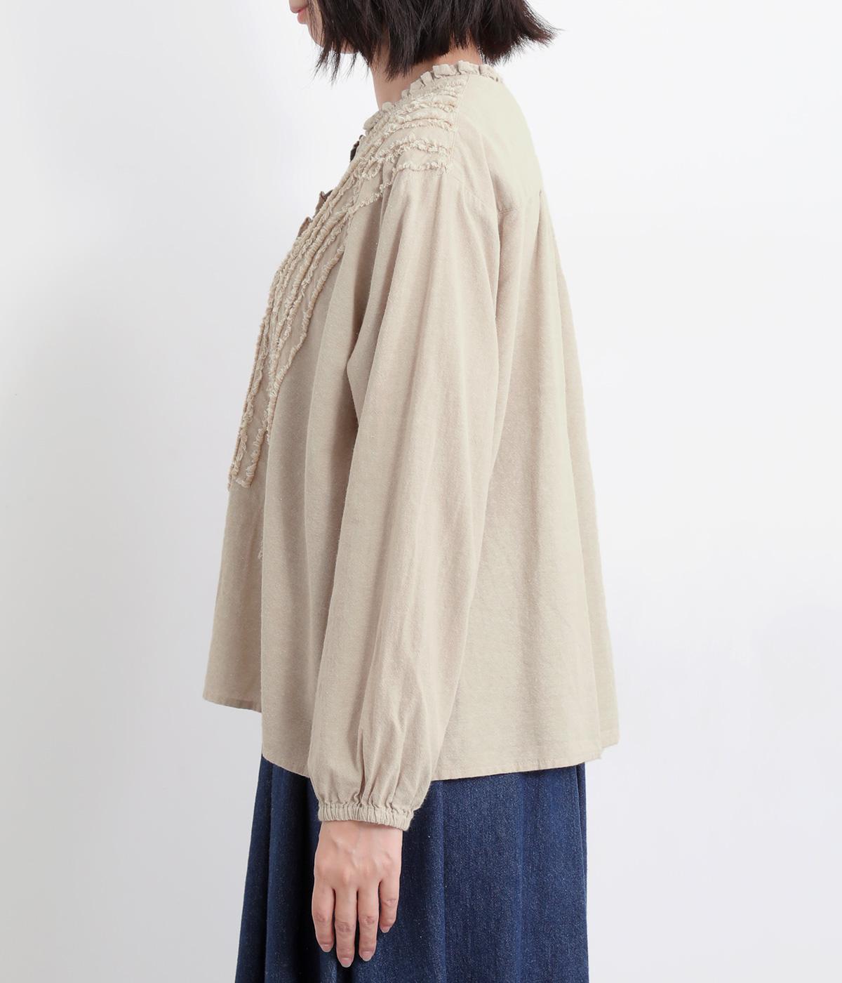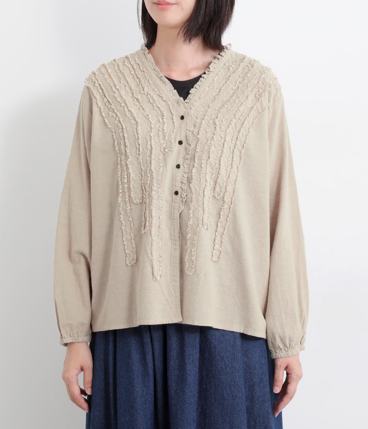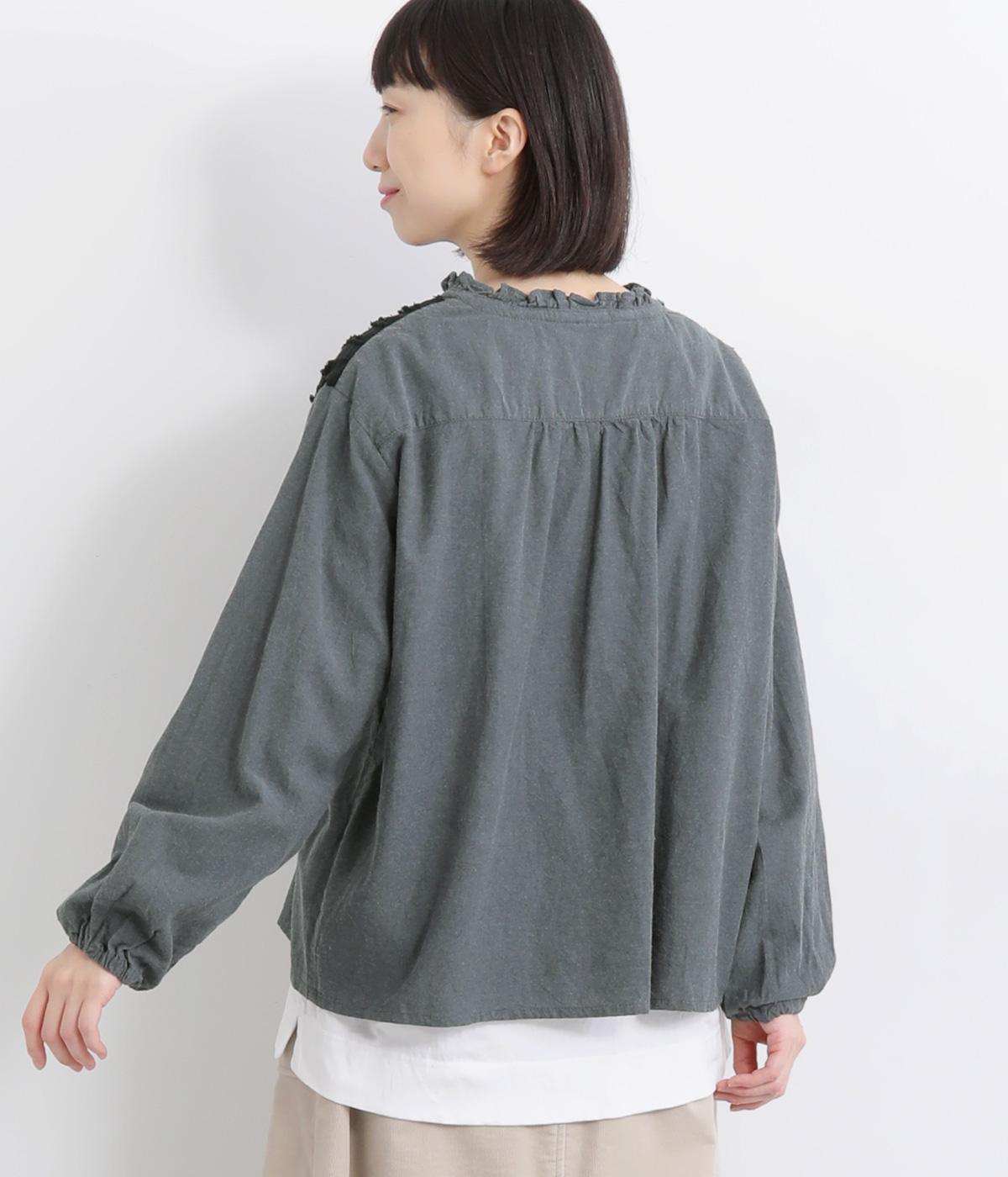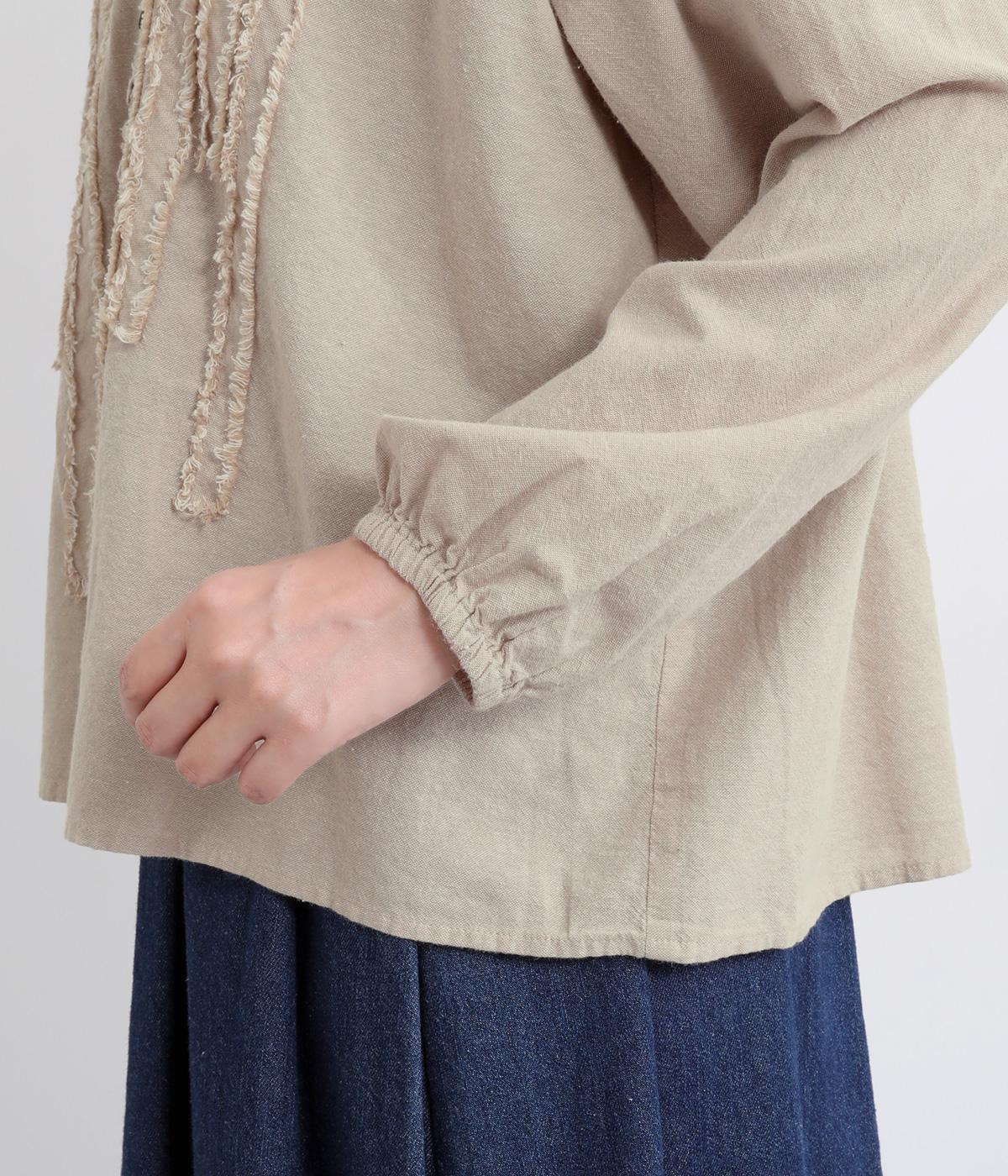 たっぷりとしたフリンジや前立てのフリルが特徴的なデザイン。甘いディテールも、ナチュラル素材でほどよく中和され、デイリーに着まわしやすく仕上がっています。袖口はゴムが入っているので、手作業のときなどたくし上げもイージー。