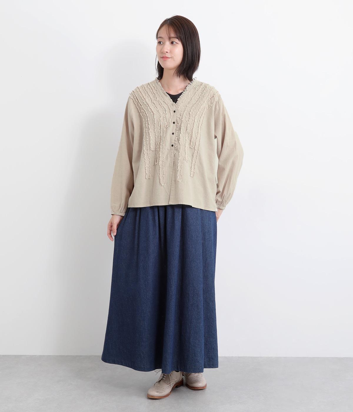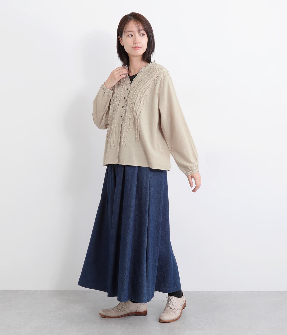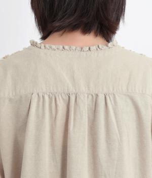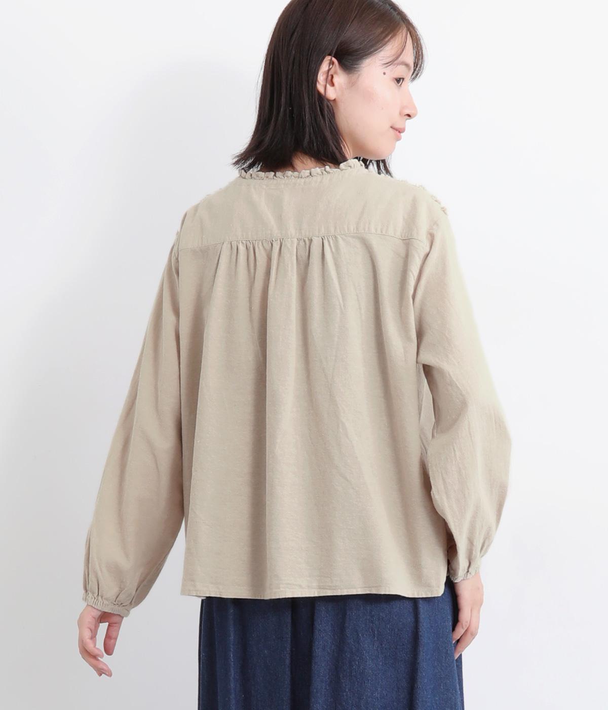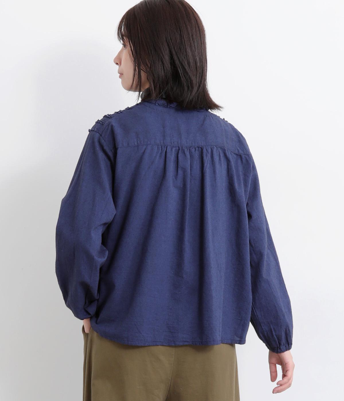 たっぷりとしたフリンジや前立てのフリルが特徴的なデザイン。甘いディテールも、ナチュラル素材でほどよく中和され、デイリーに着まわしやすく仕上がっています。袖口はゴムが入っているので、手作業のときなどたくし上げもイージー。