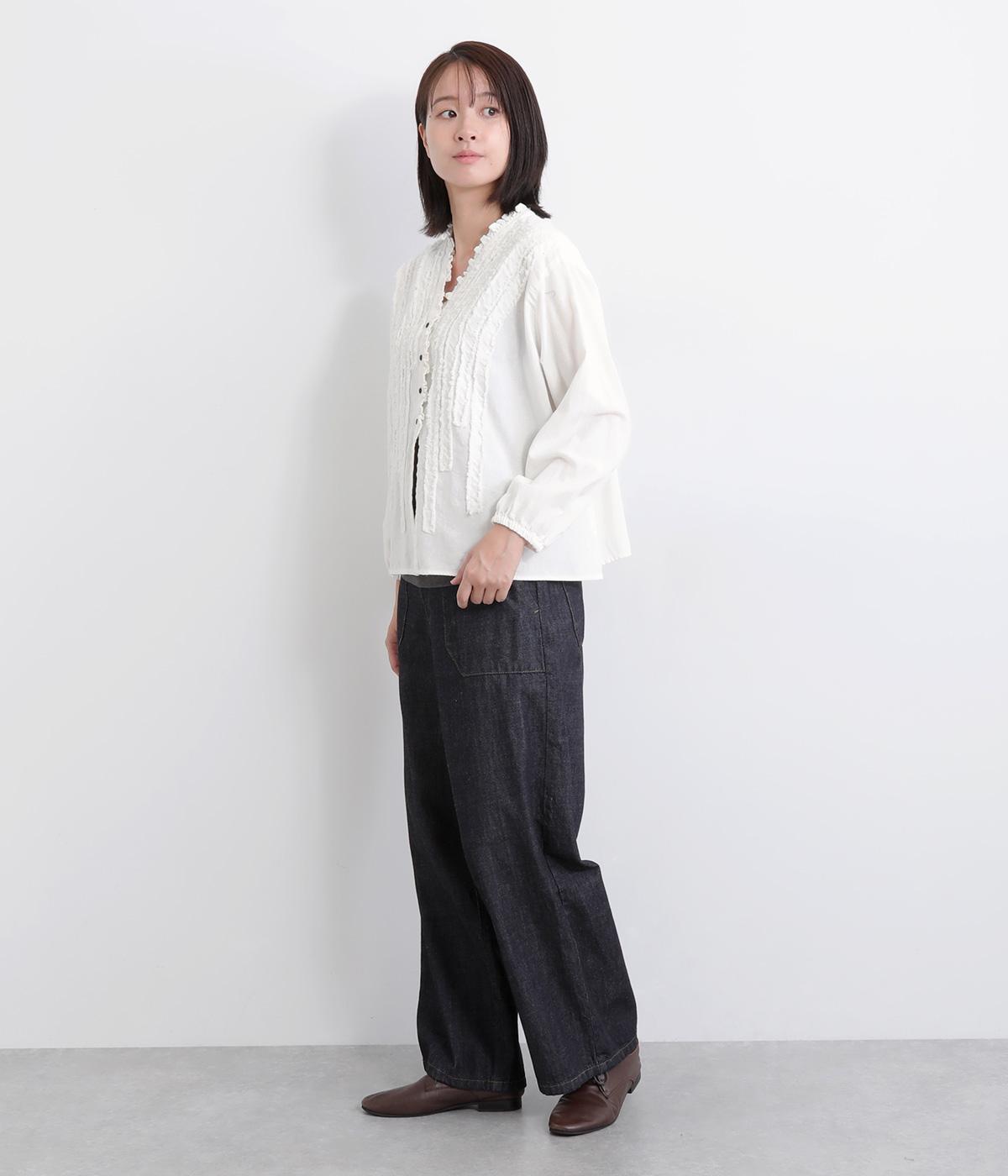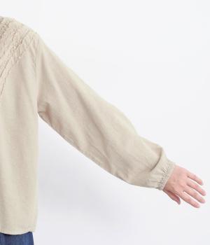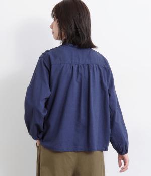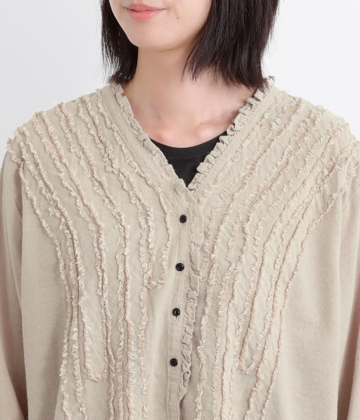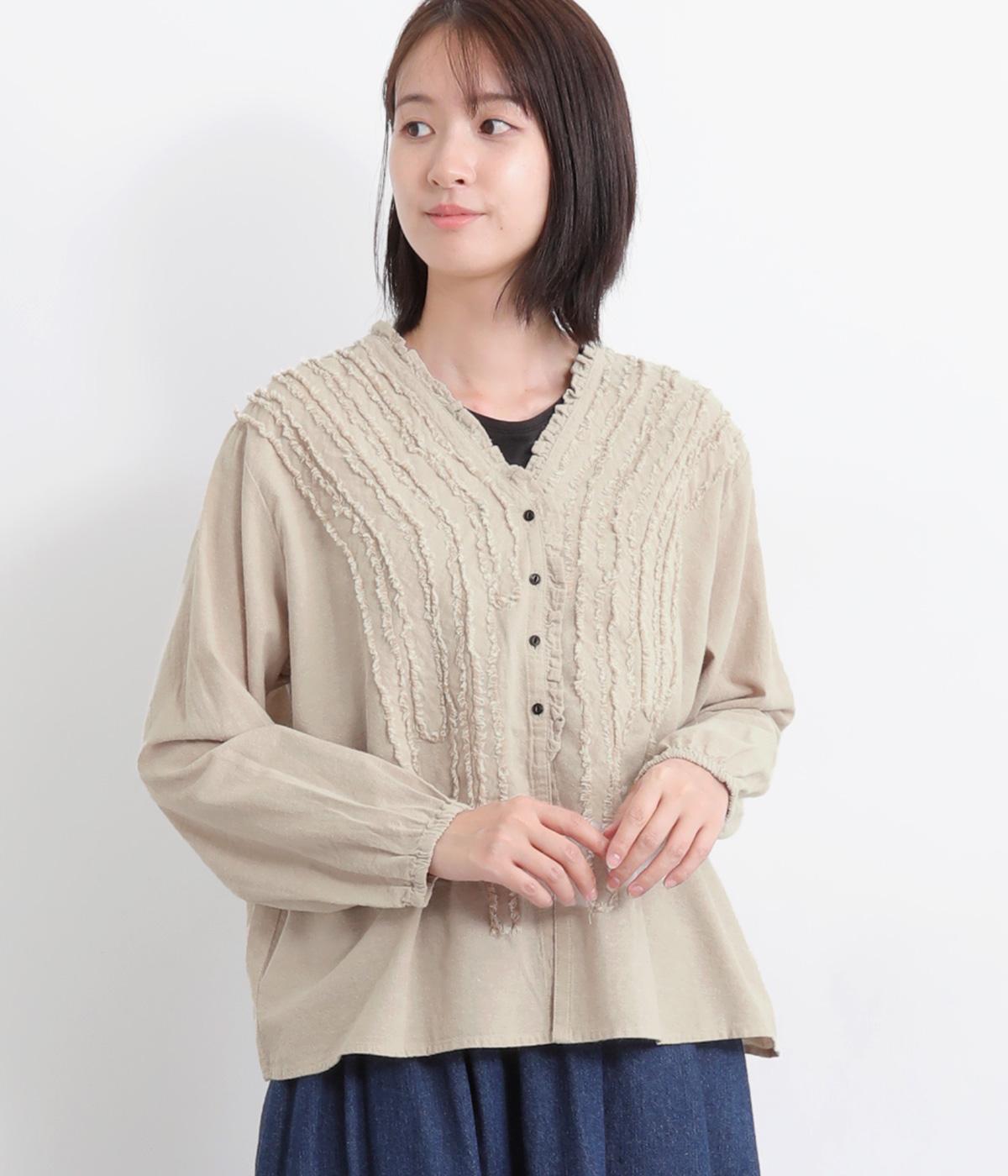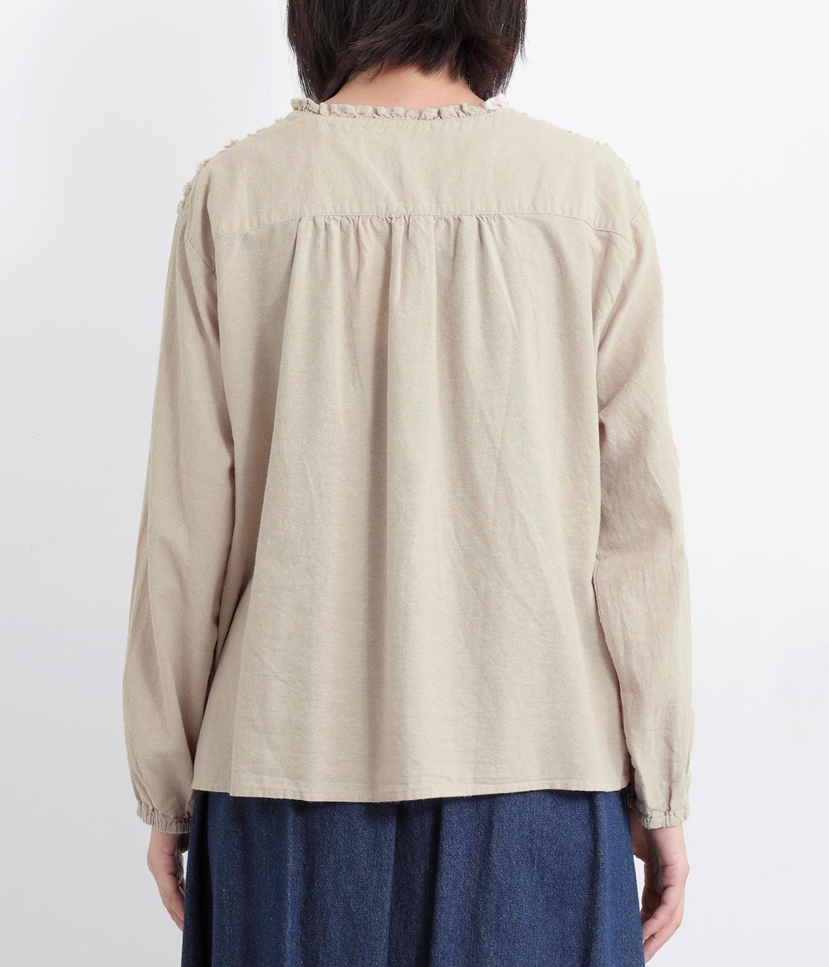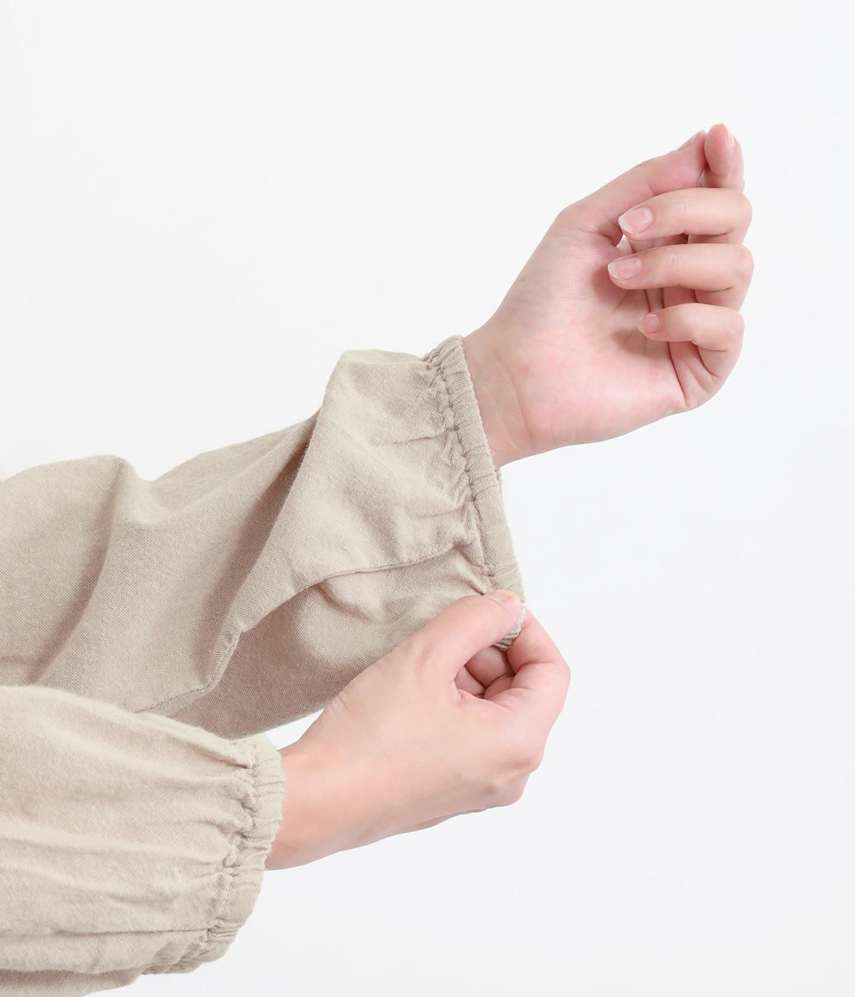 たっぷりとしたフリンジや前立てのフリルが特徴的なデザイン。甘いディテールも、ナチュラル素材でほどよく中和され、デイリーに着まわしやすく仕上がっています。袖口はゴムが入っているので、手作業のときなどたくし上げもイージー。