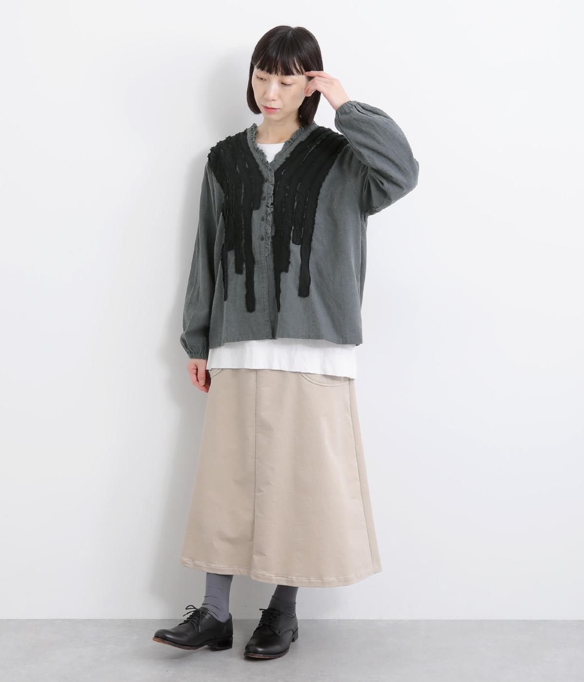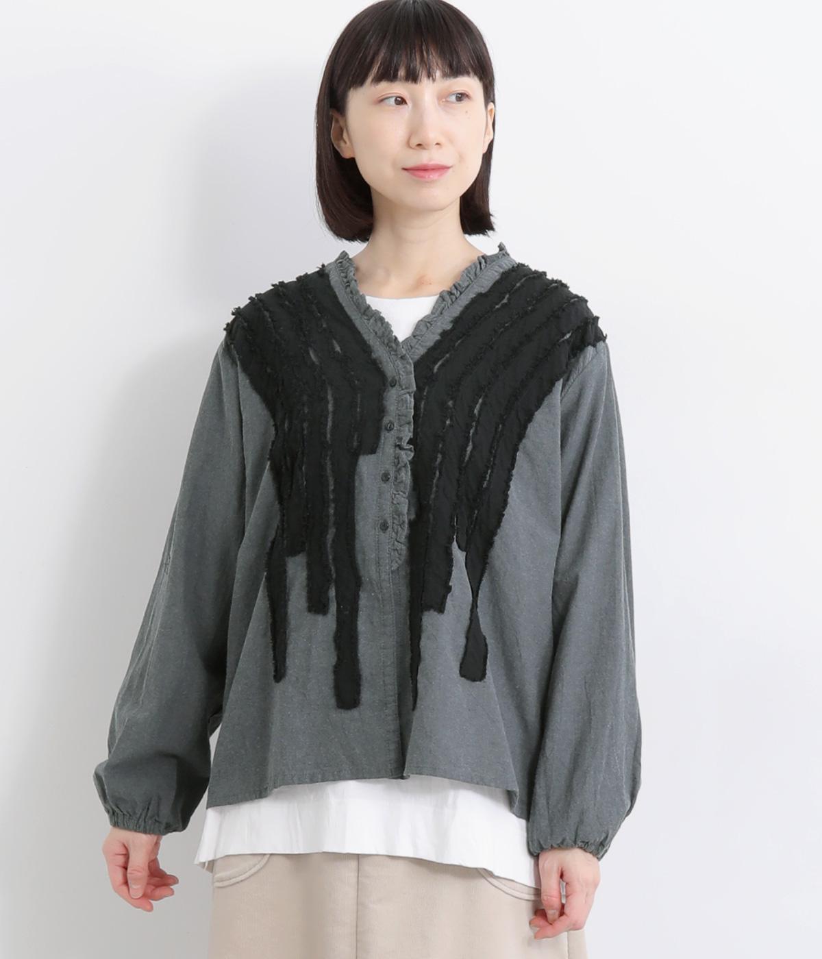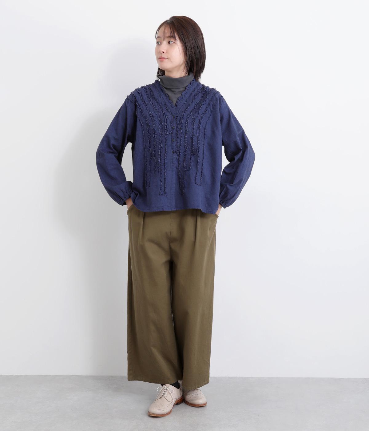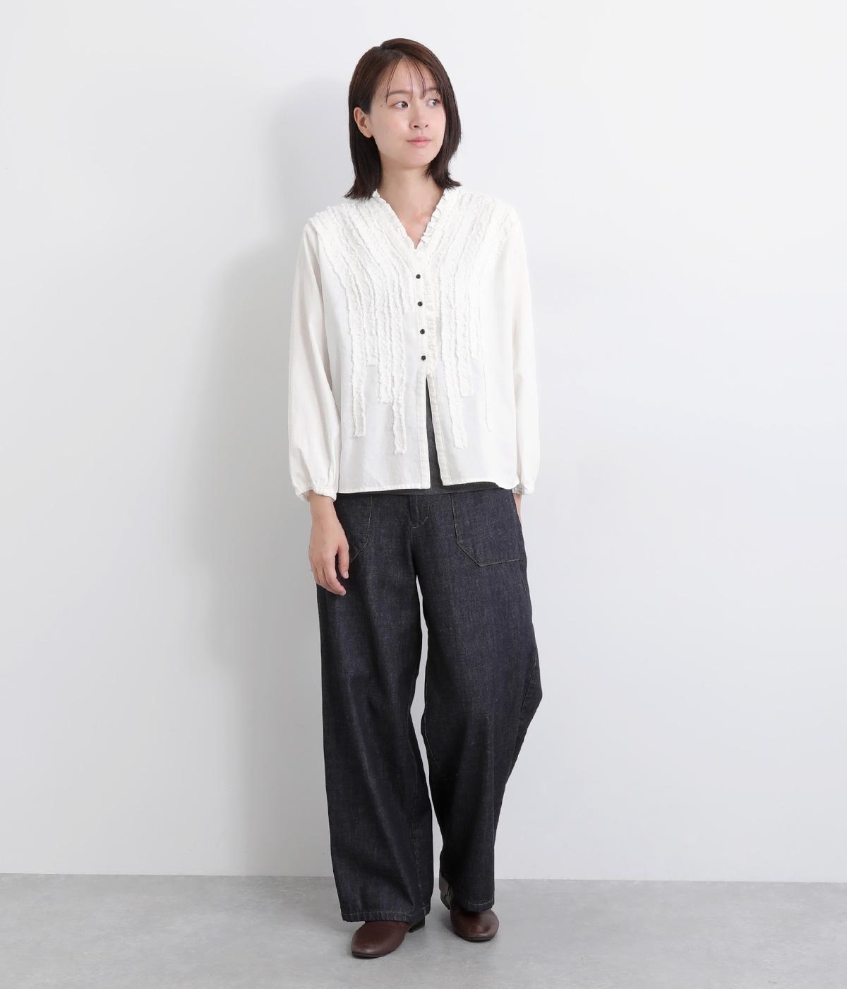 たっぷりとしたフリンジや前立てのフリルが特徴的なデザイン。甘いディテールも、ナチュラル素材でほどよく中和され、デイリーに着まわしやすく仕上がっています。袖口はゴムが入っているので、手作業のときなどたくし上げもイージー。