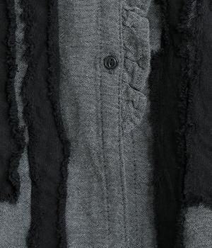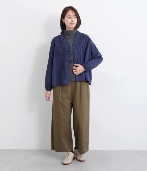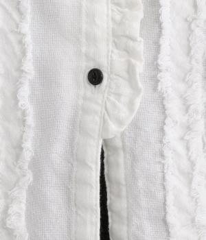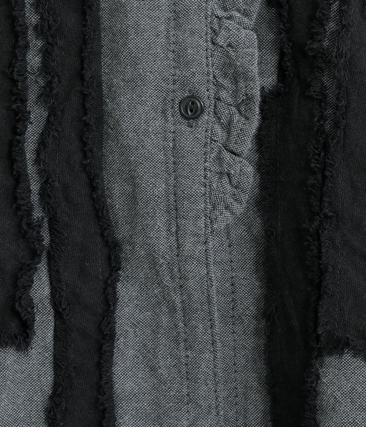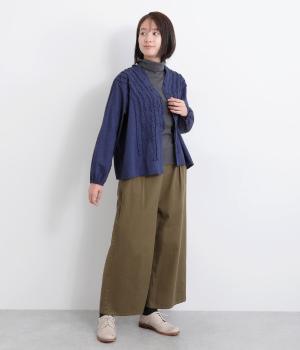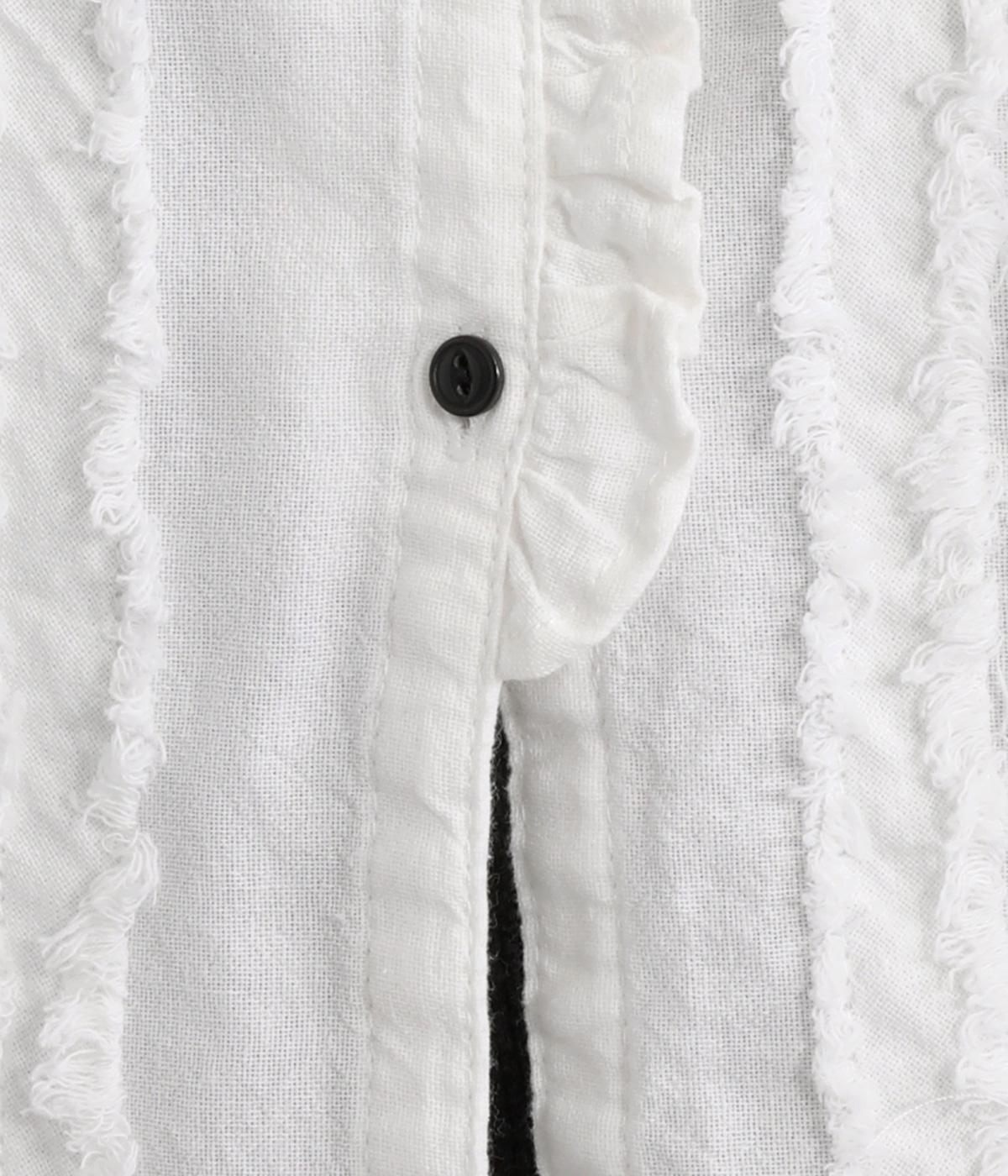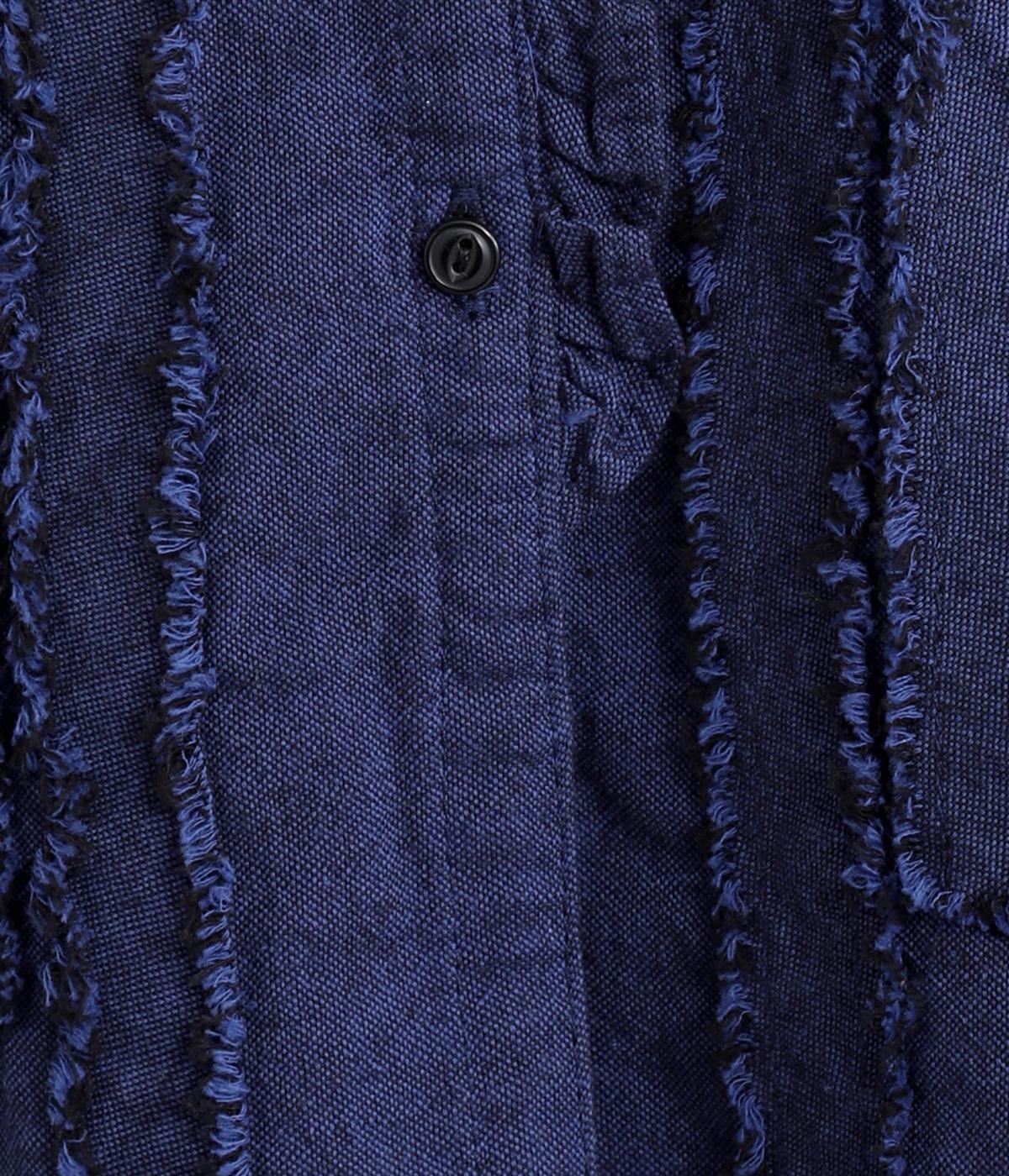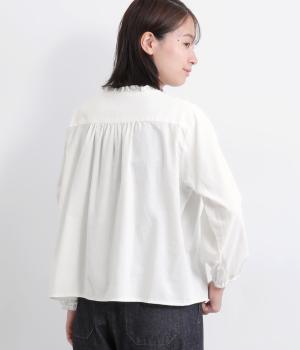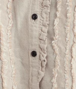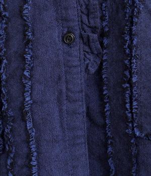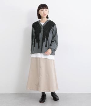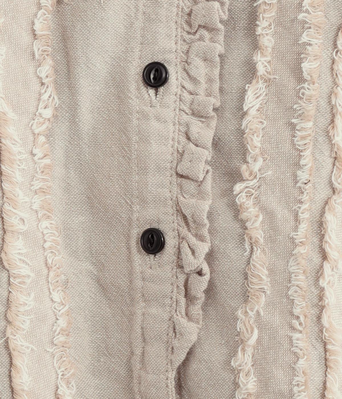 たっぷりとしたフリンジや前立てのフリルが特徴的なデザイン。甘いディテールも、ナチュラル素材でほどよく中和され、デイリーに着まわしやすく仕上がっています。袖口はゴムが入っているので、手作業のときなどたくし上げもイージー。