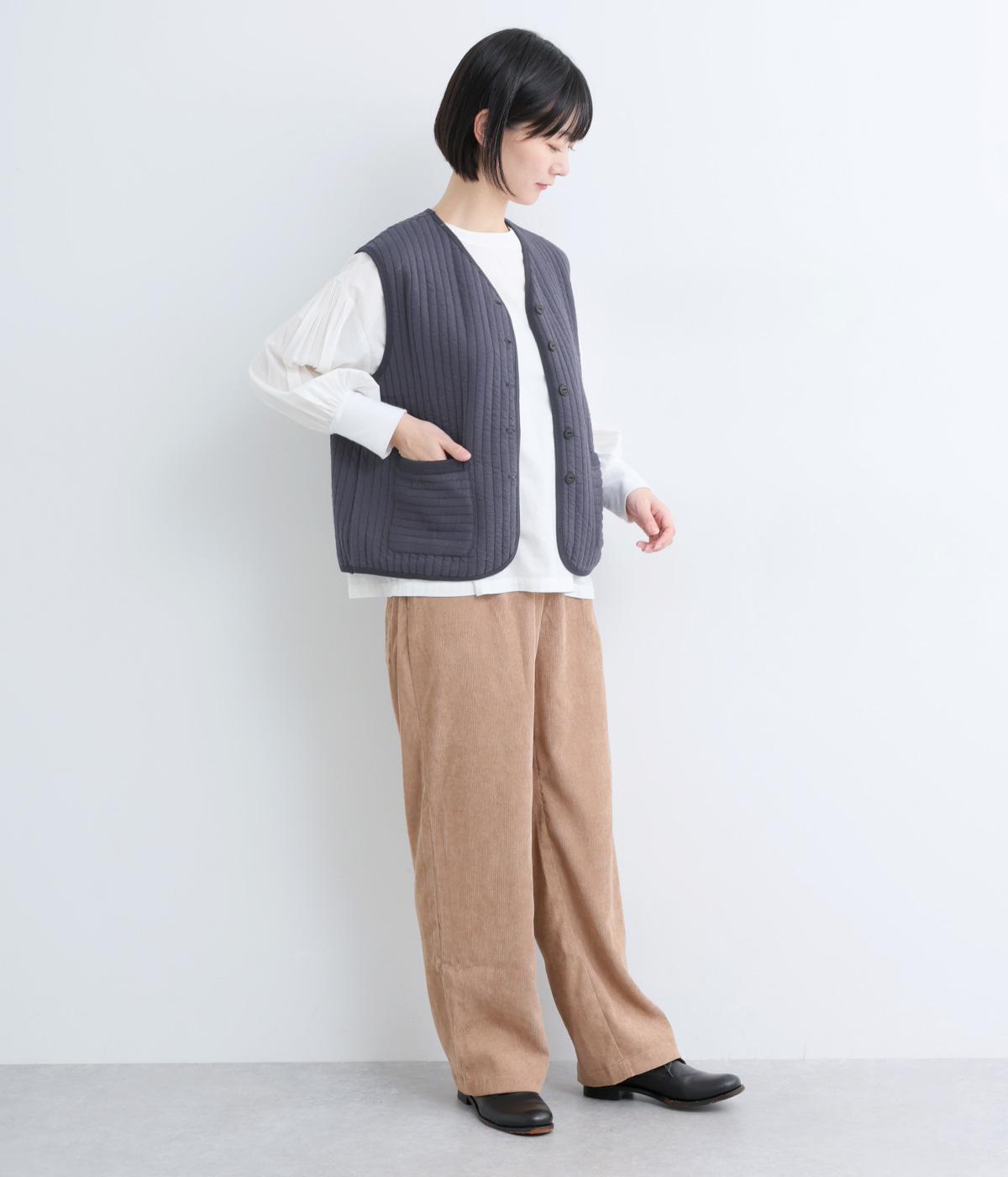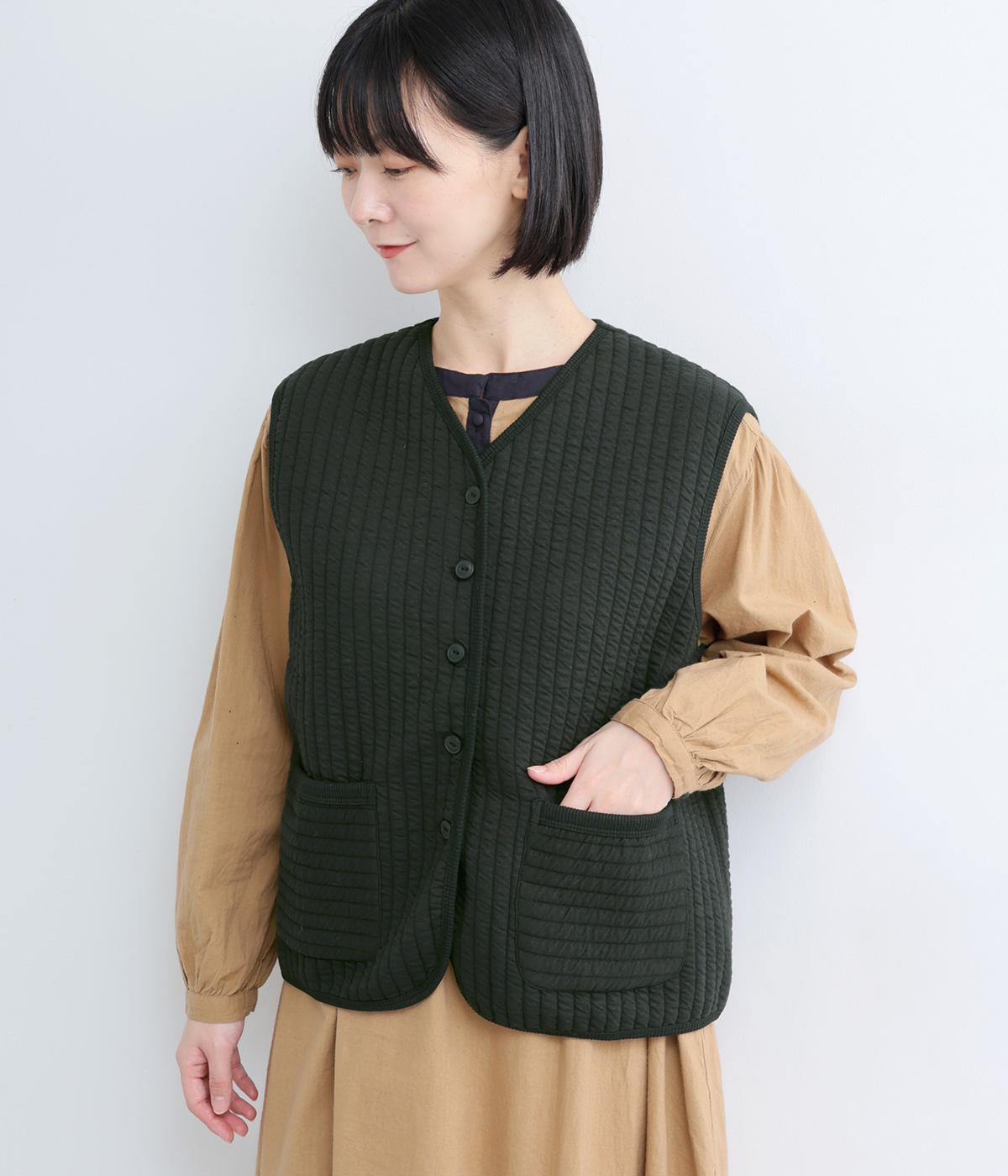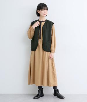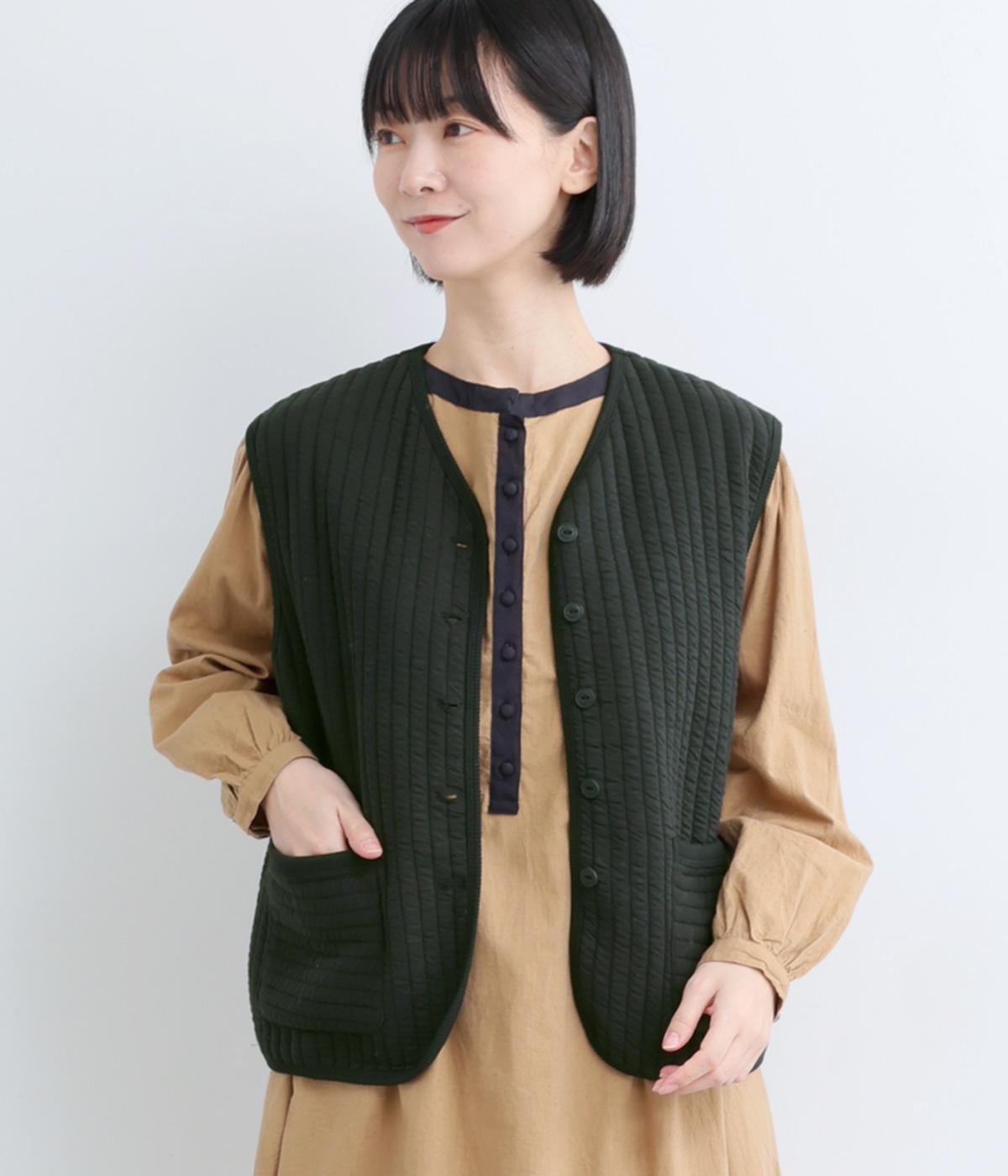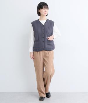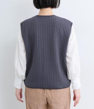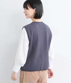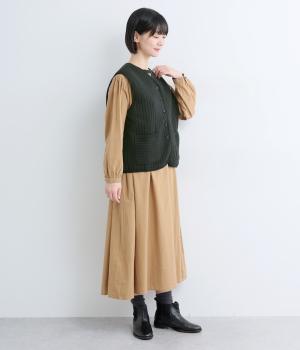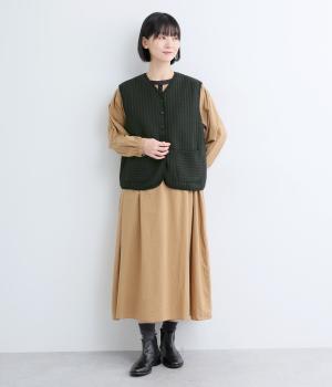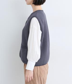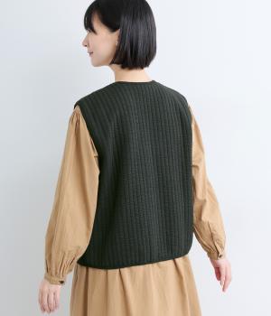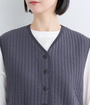 キルティング生地でほっこりとあたたかみのあるベストをつくりました。同色のリブトリミングでさり気なくメリハリをつけつつ、シンプルなデザインで着まわし力も◎。カットソー合わせはもちろん、ワンピースをカジュアルダウンさせるのもおすすめ。