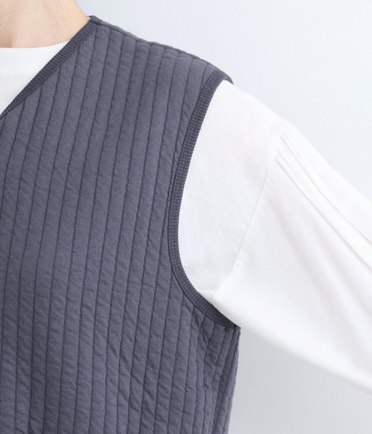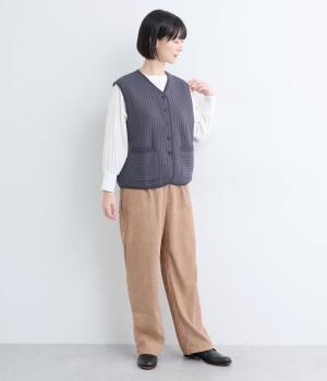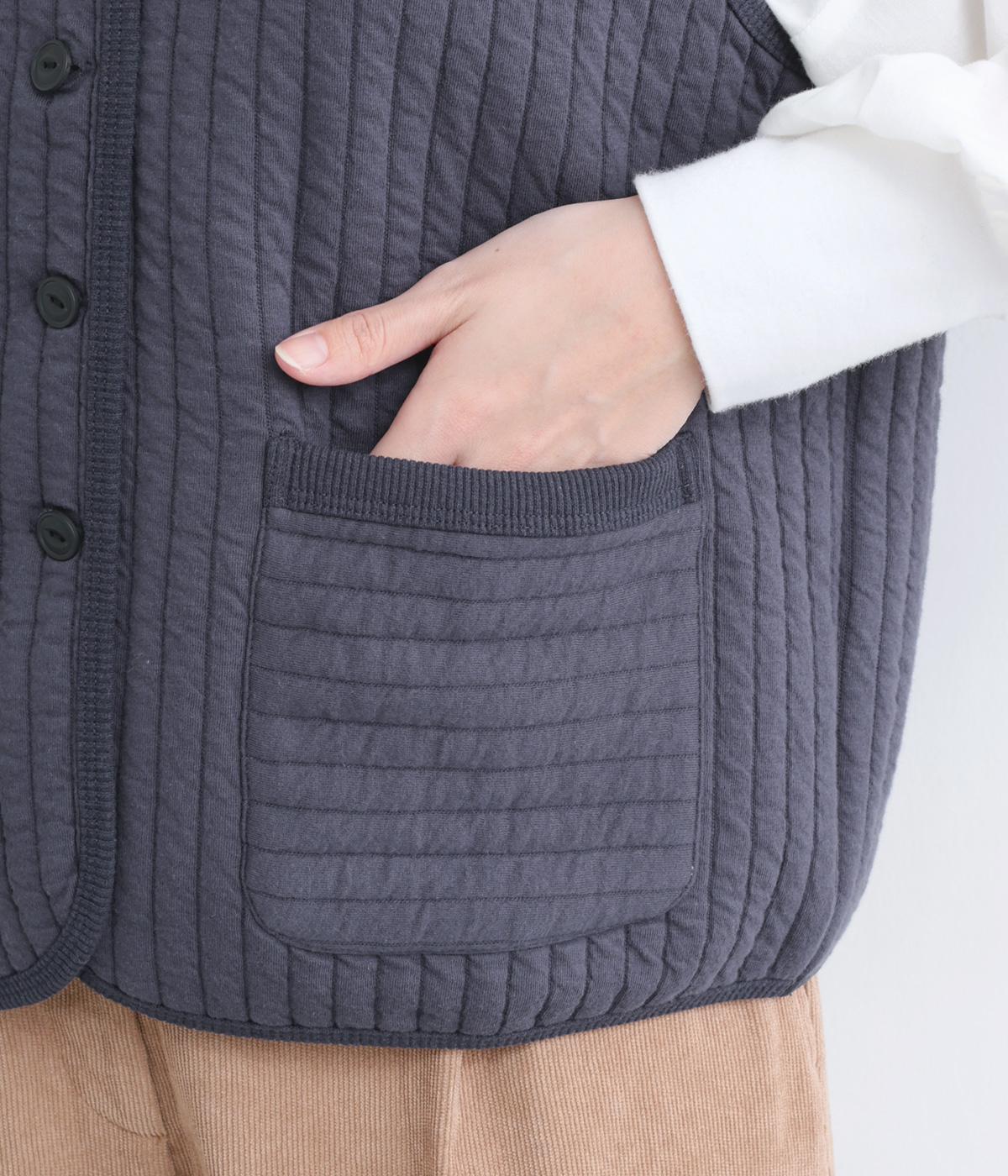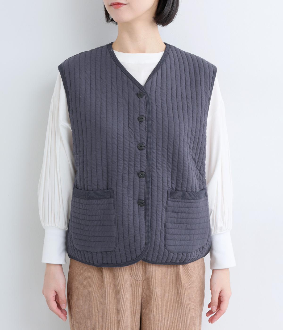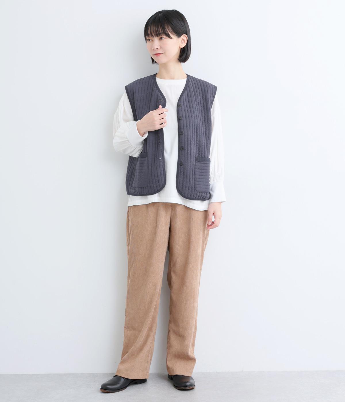 キルティング生地でほっこりとあたたかみのあるベストをつくりました。同色のリブトリミングでさり気なくメリハリをつけつつ、シンプルなデザインで着まわし力も◎。カットソー合わせはもちろん、ワンピースをカジュアルダウンさせるのもおすすめ。