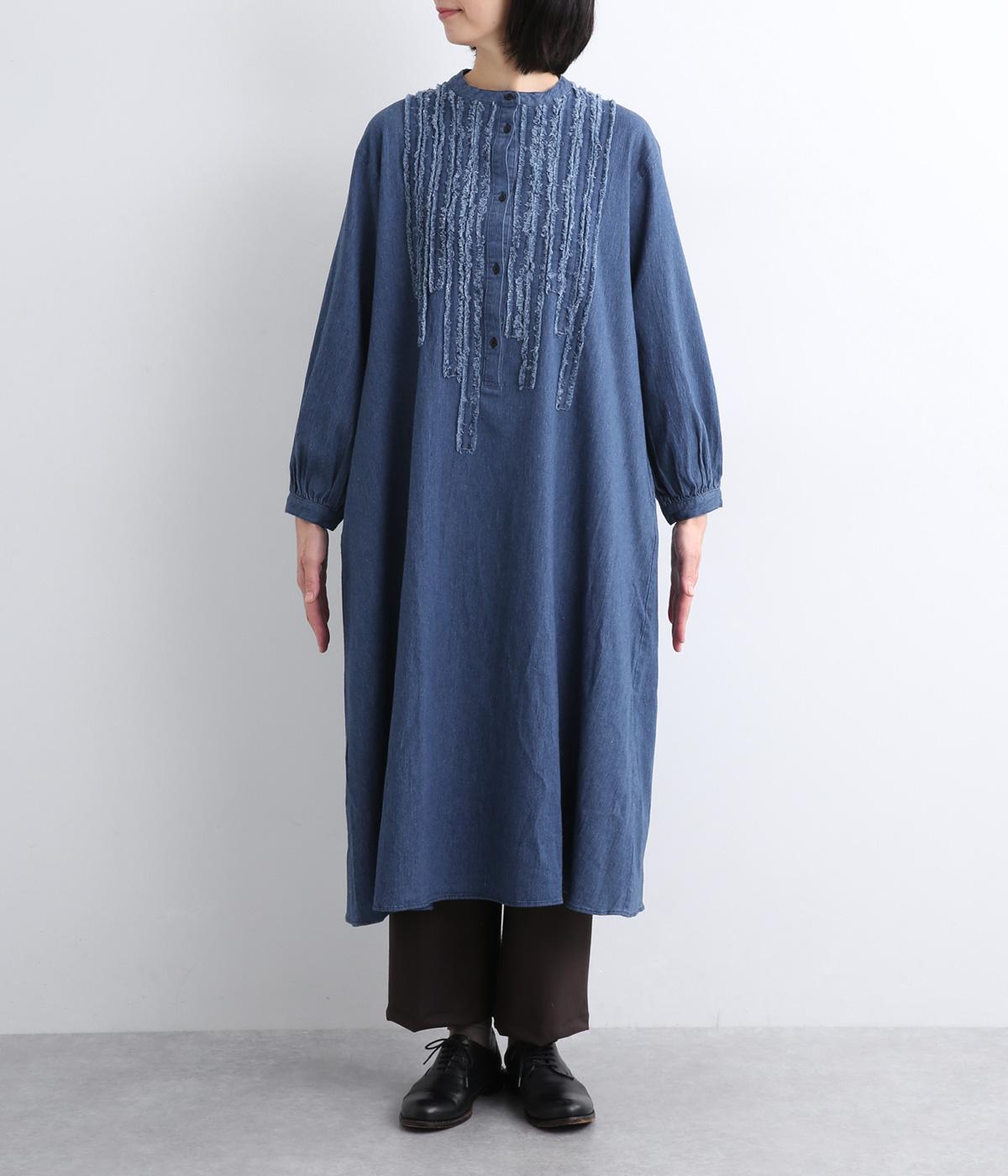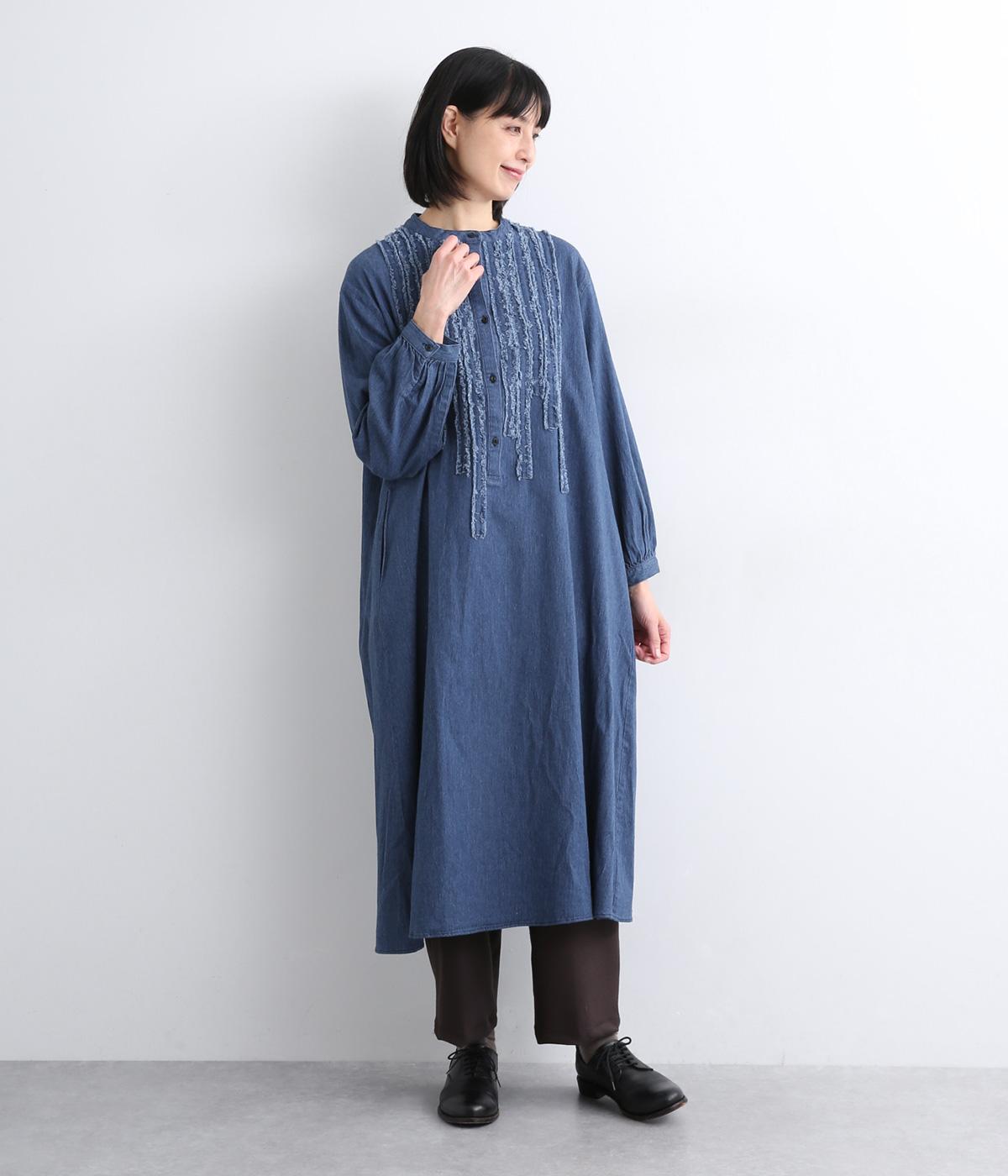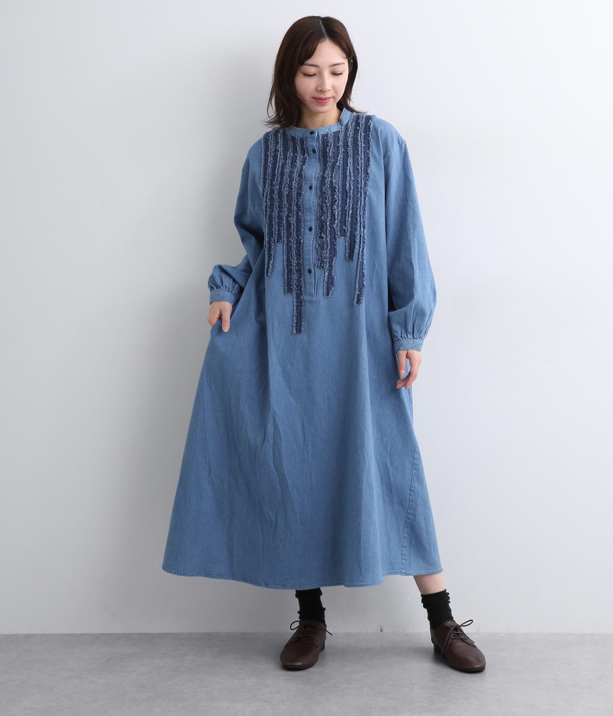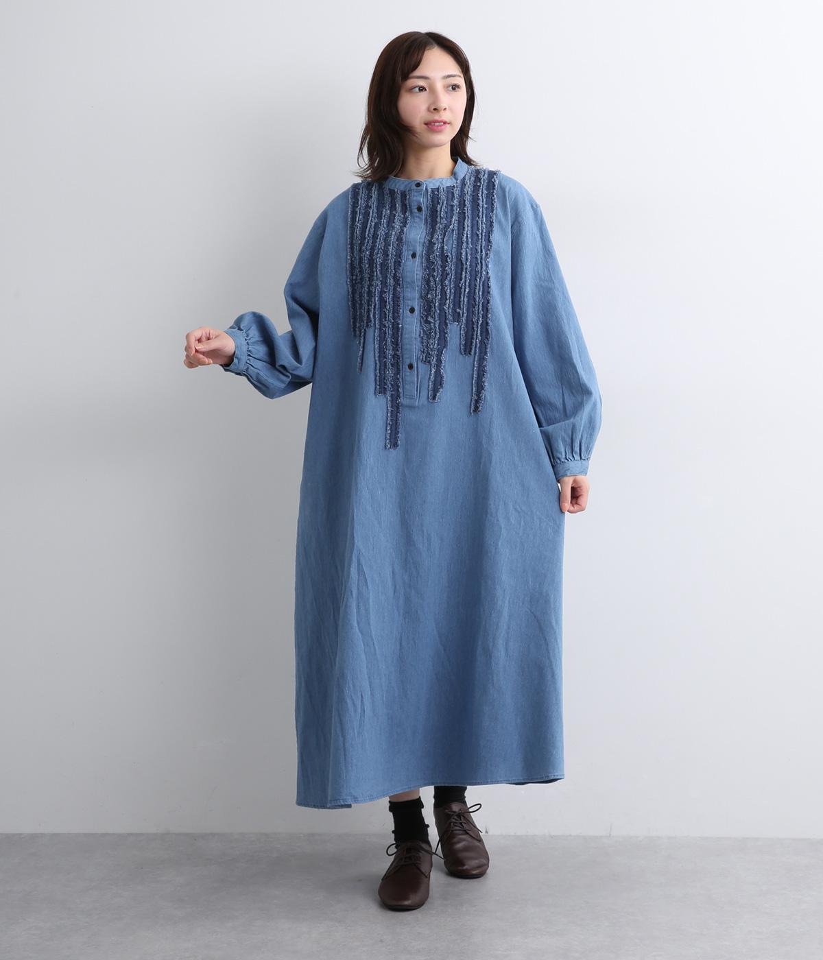 前身頃にあしらったフリンジのラインが特徴的なデニムワンピース。個性的ながらもカジュアルなデニム素材でほどよく中和され、デイリーに取り入れやすいアイテムに仕上がりました。一枚でサマ見えします。