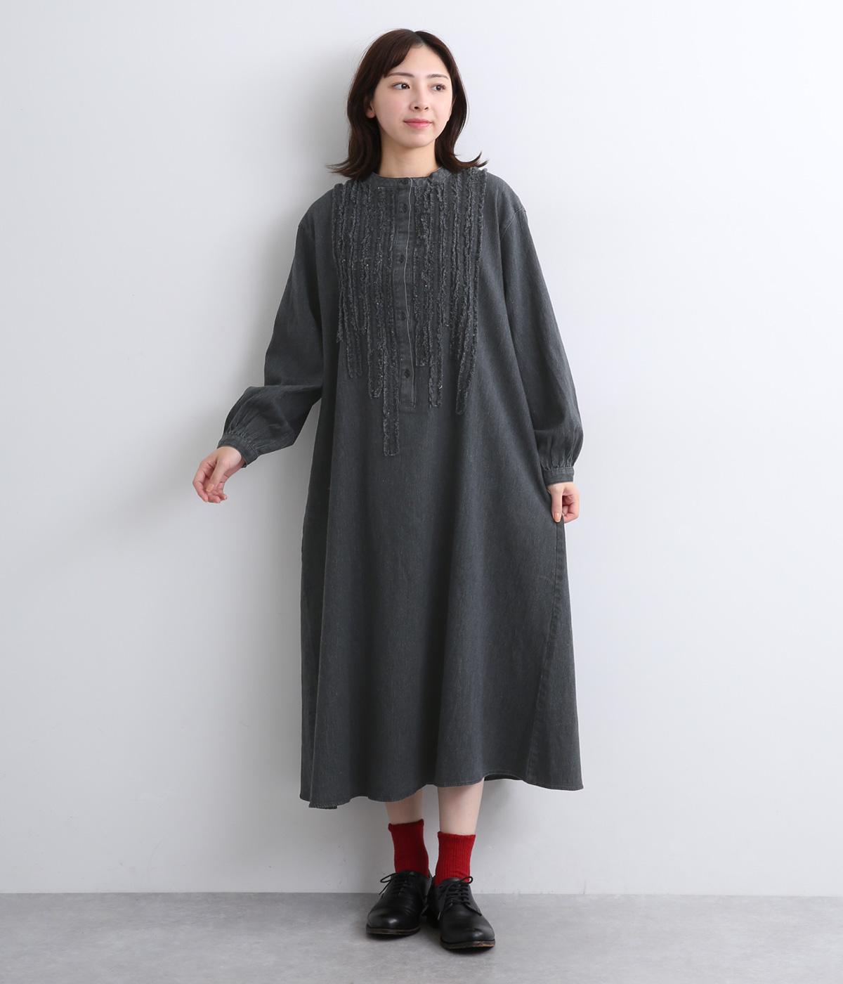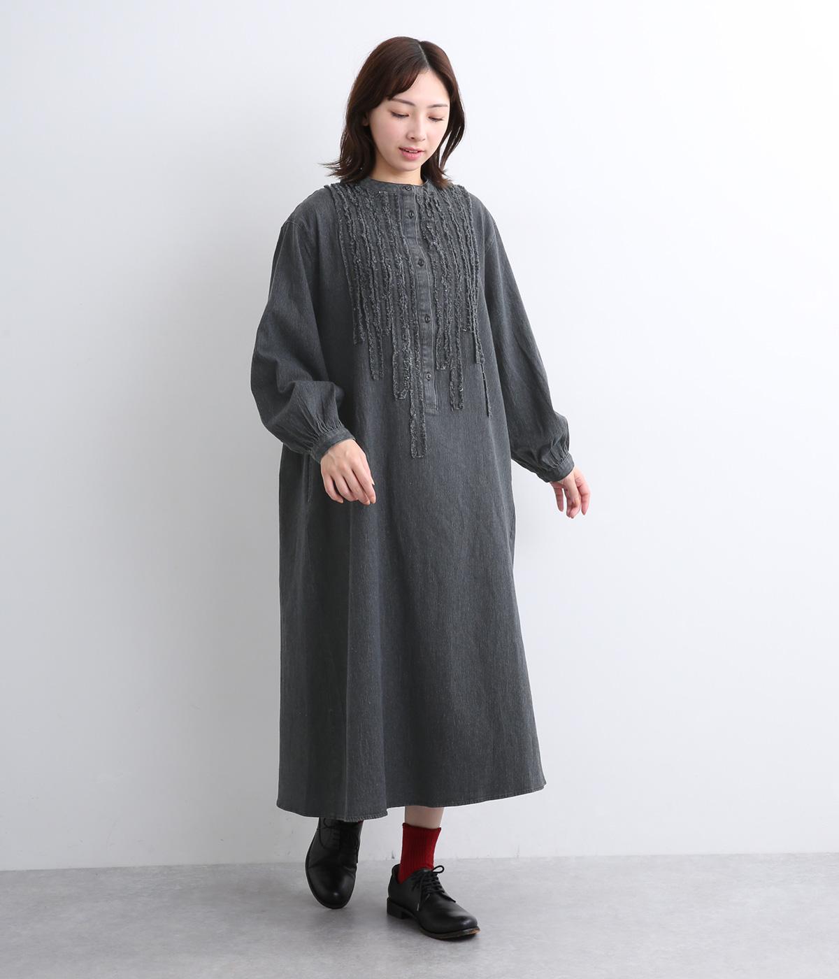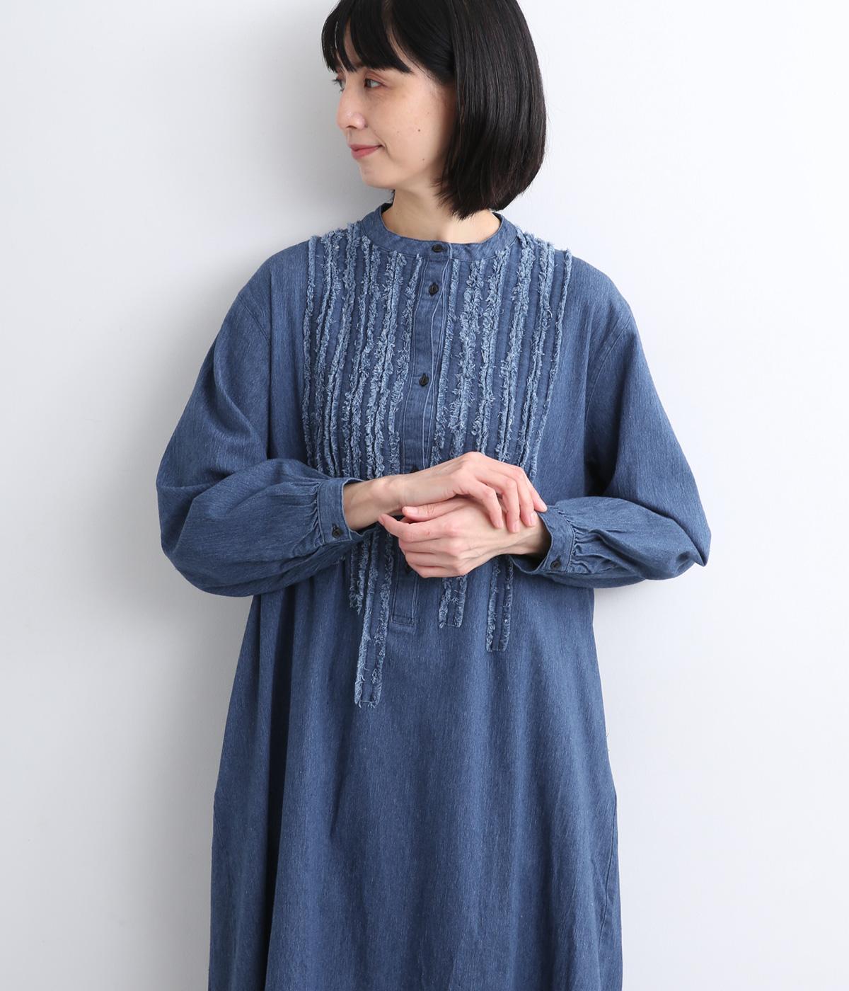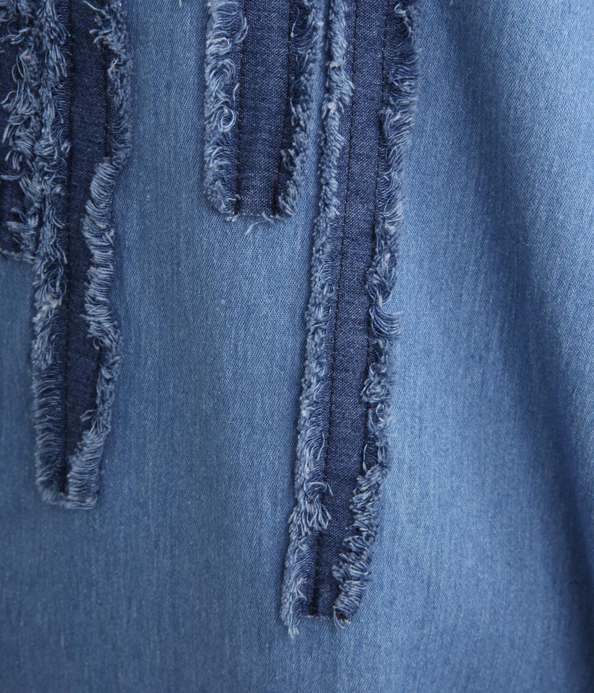 前身頃にあしらったフリンジのラインが特徴的なデニムワンピース。個性的ながらもカジュアルなデニム素材でほどよく中和され、デイリーに取り入れやすいアイテムに仕上がりました。一枚でサマ見えします。