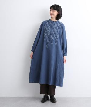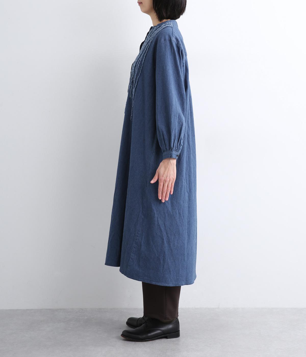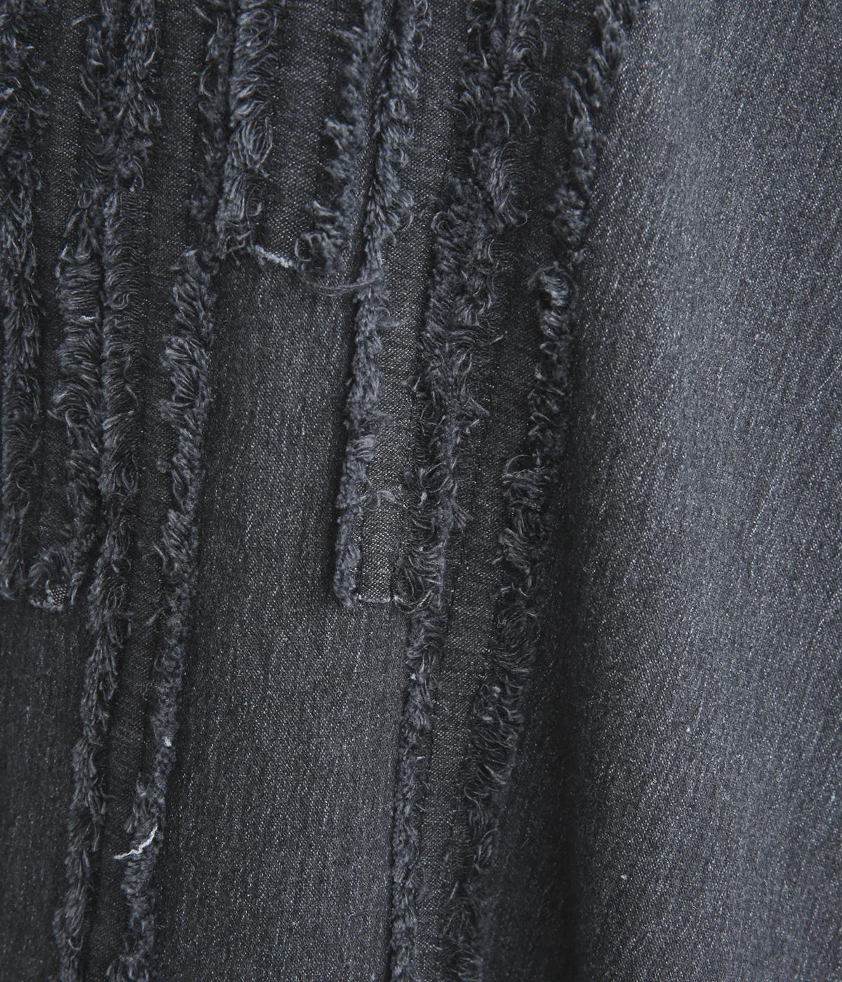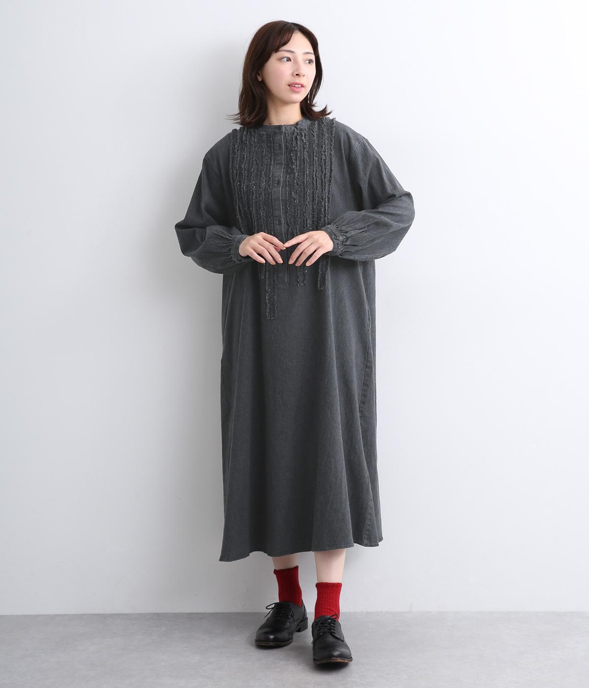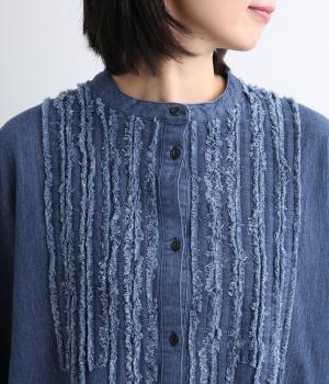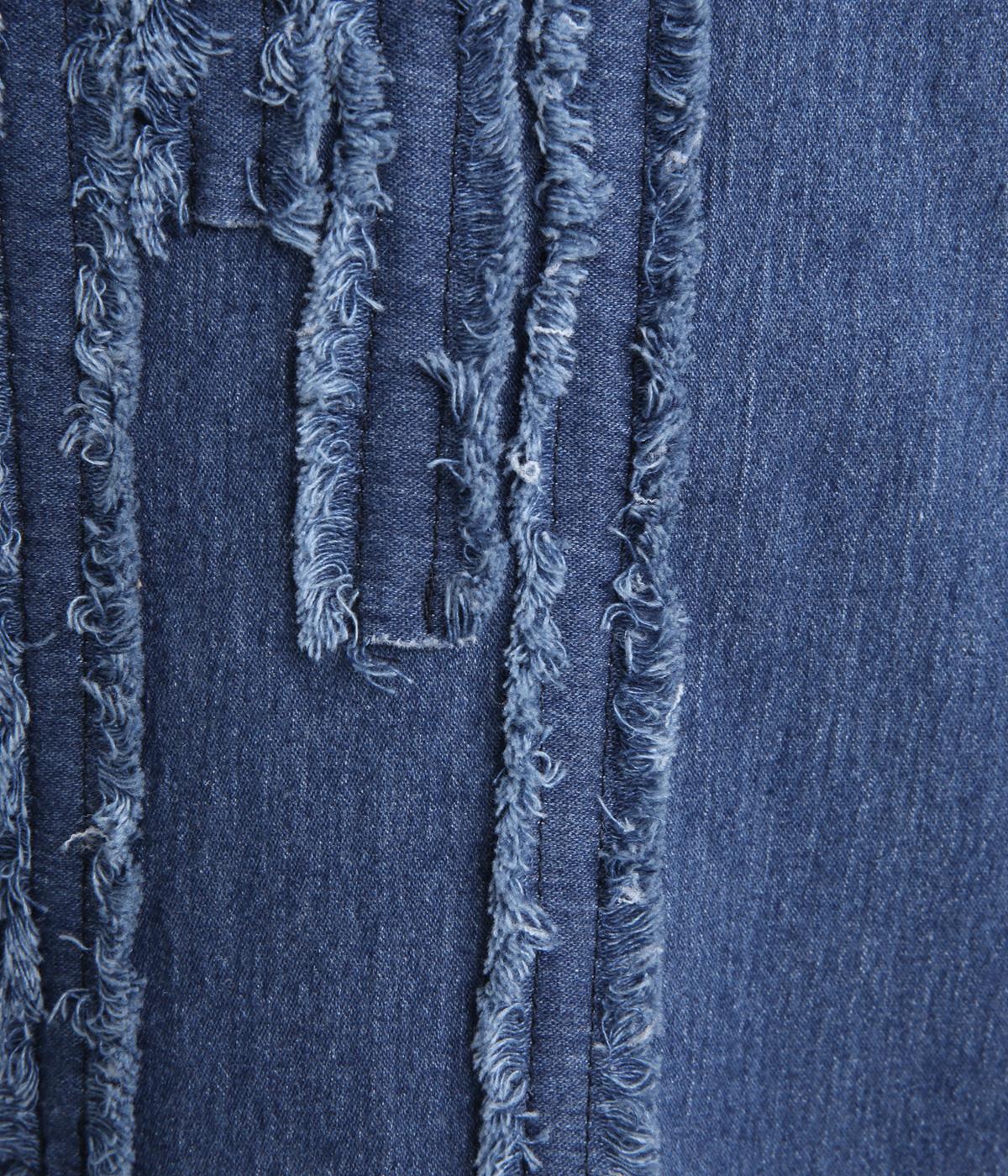 前身頃にあしらったフリンジのラインが特徴的なデニムワンピース。個性的ながらもカジュアルなデニム素材でほどよく中和され、デイリーに取り入れやすいアイテムに仕上がりました。一枚でサマ見えします。