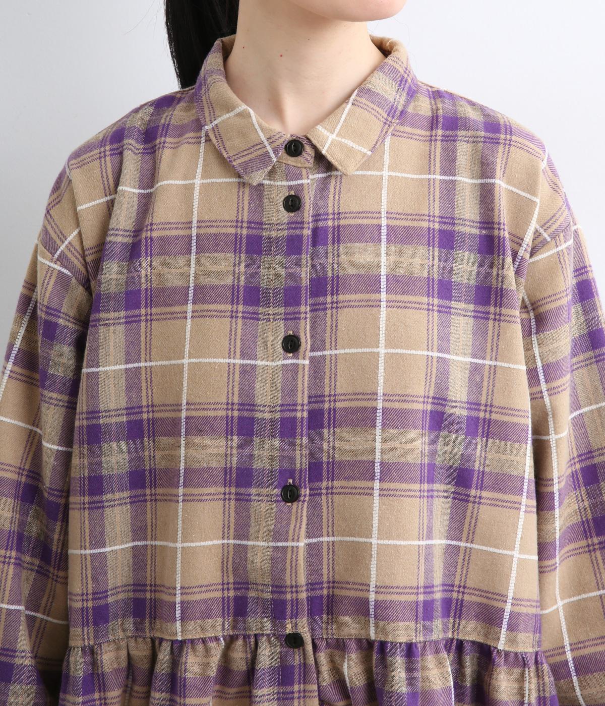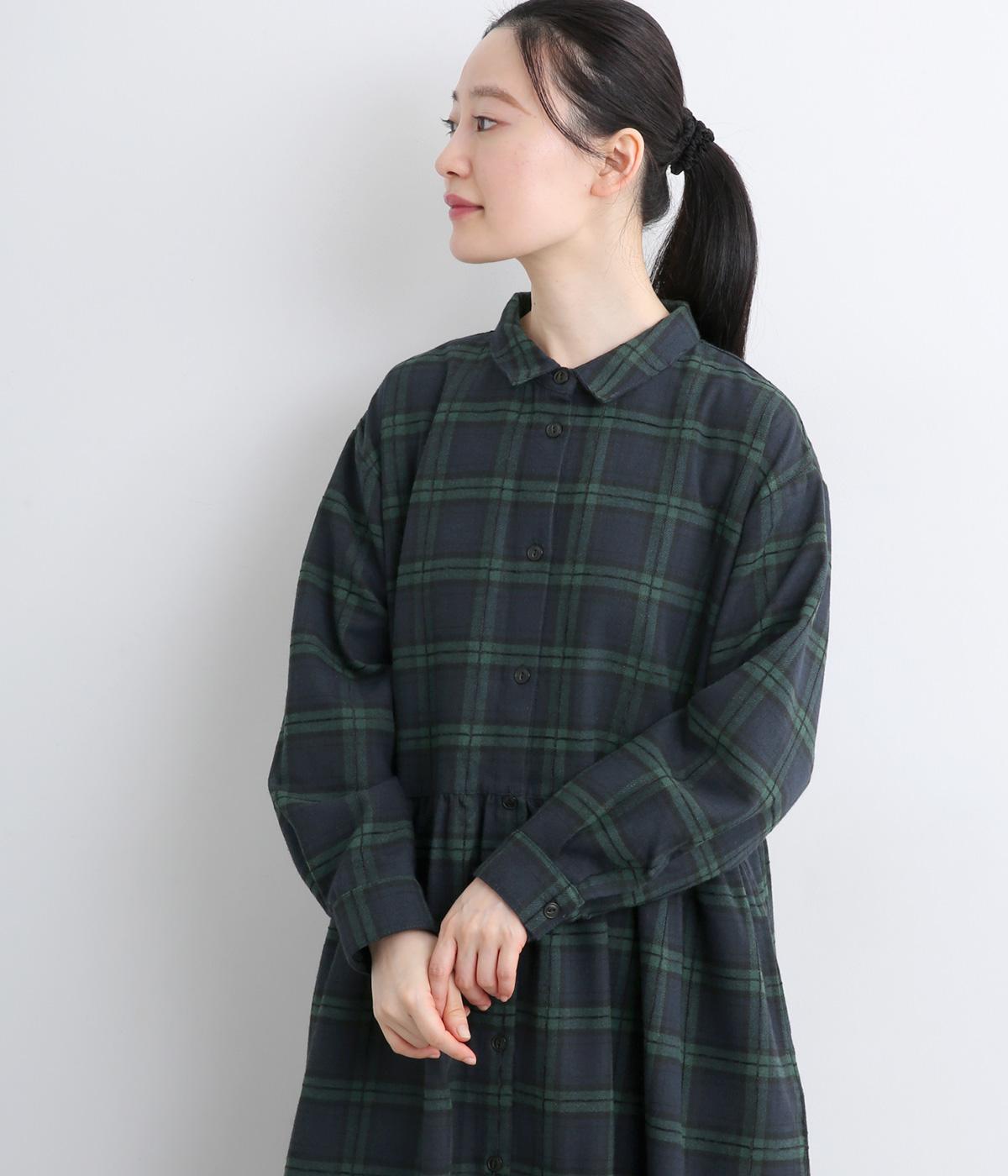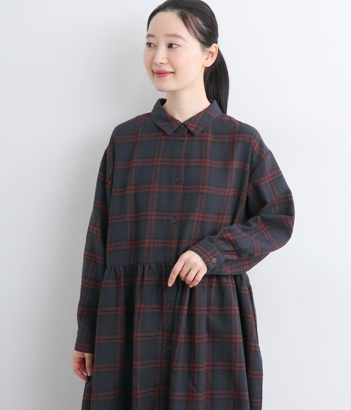 格子のラインを立体的な刺しゅうで仕立てたチェック柄のワンピースです。ウエストの切り替えにほどこしたギャザーがふんわりしたシルエットをつくり、女性らしさを演出します。ゆったりした身幅でリラックスした着心地です。
