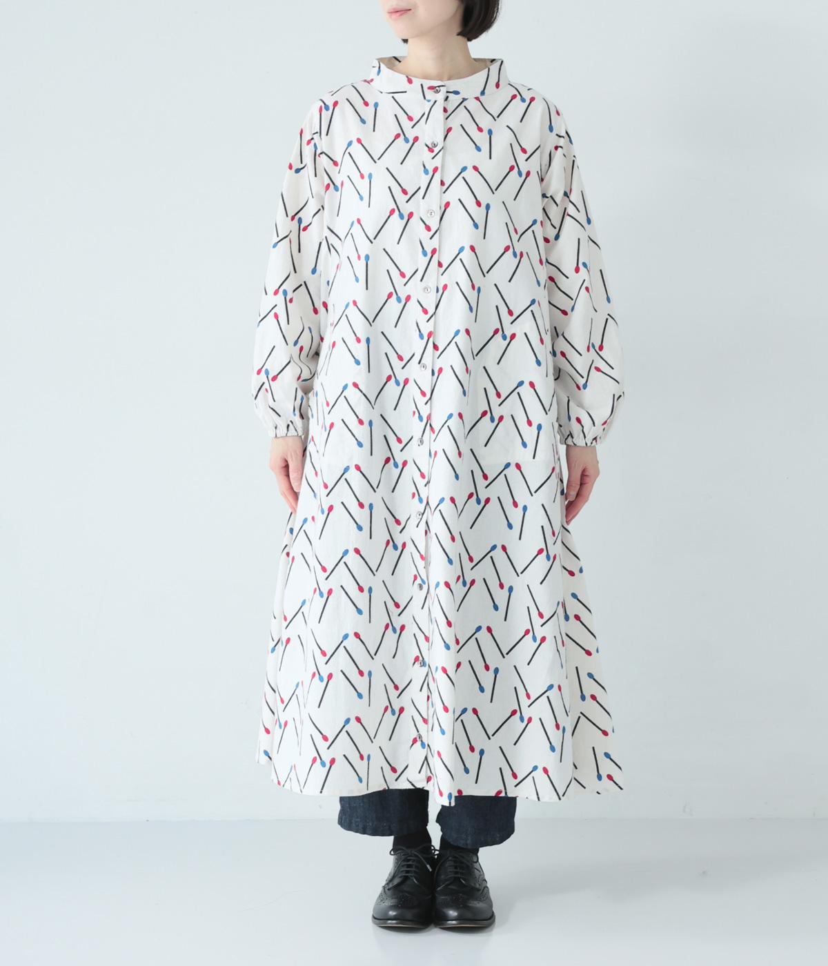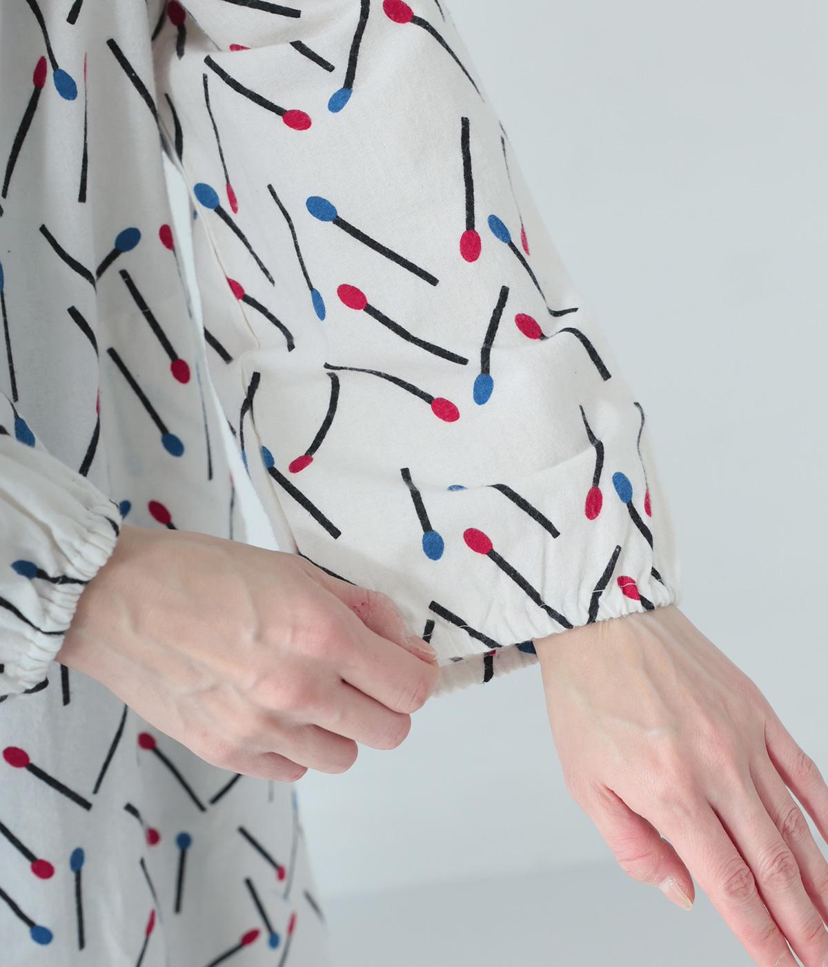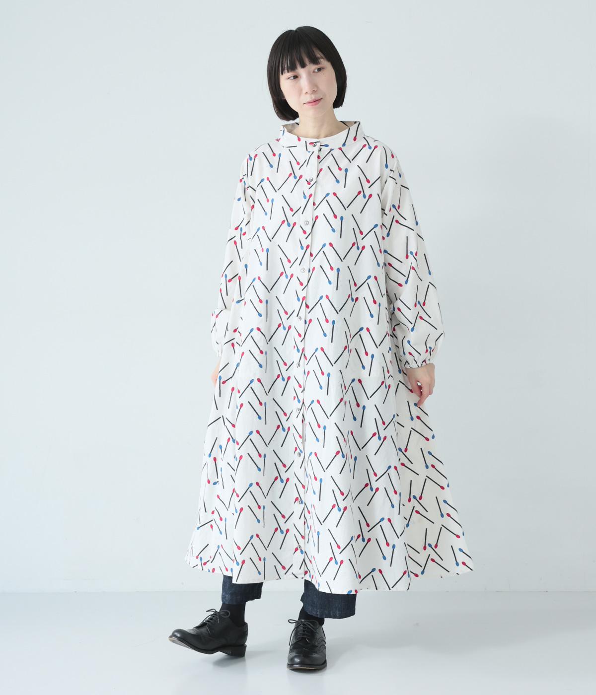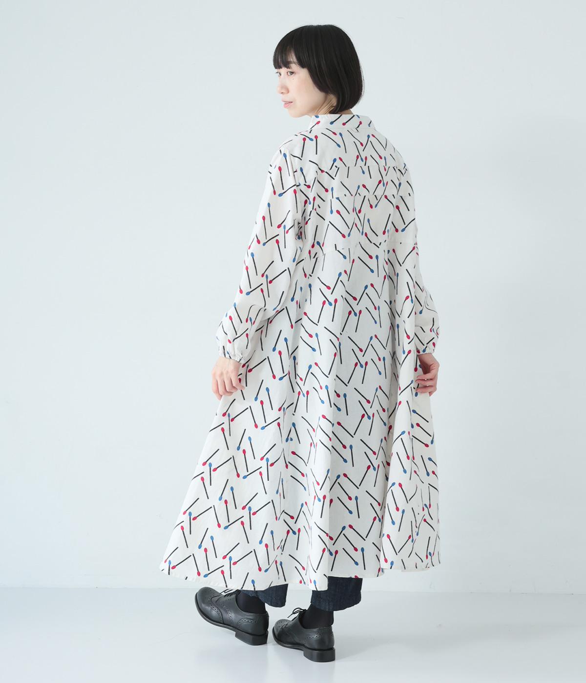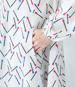 マッチをモチーフにした総柄がかわいいワンピース。バンドカラーで上品な印象に仕上げています。袖口にはゴムが入っているので、さっとたくし上げたアレンジも◎。裾にかけてふわりと広がるシルエットが美しく、羽織りものとしても活躍してくれます。