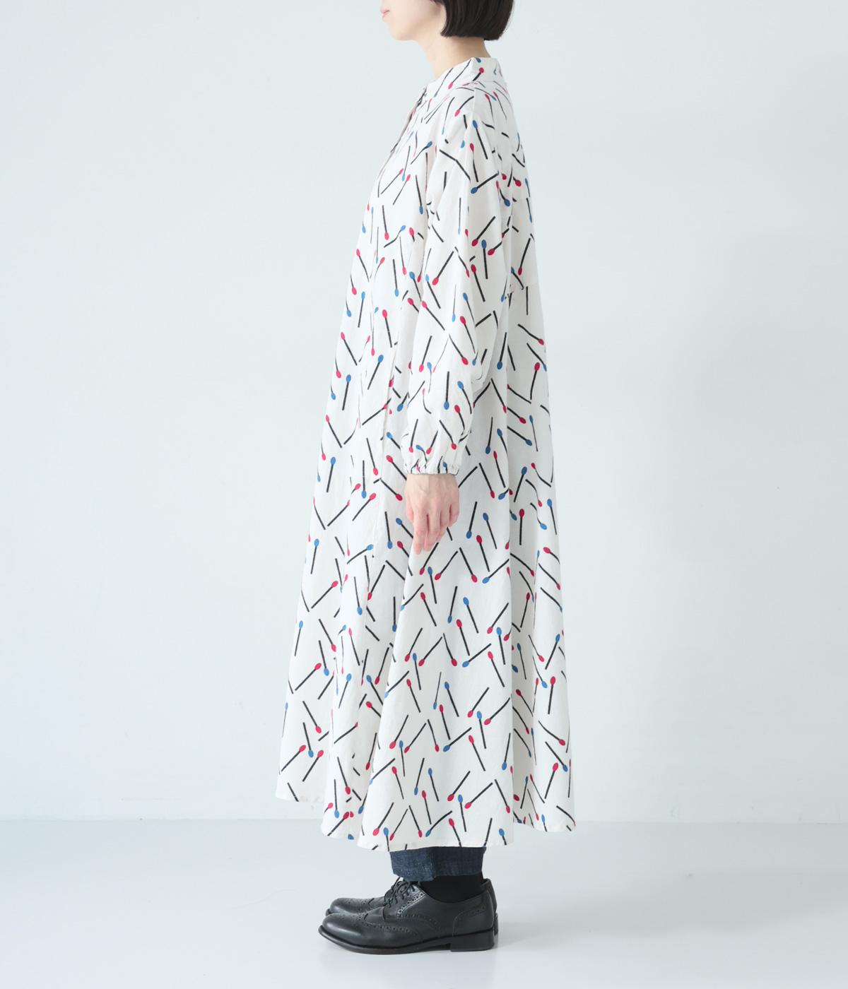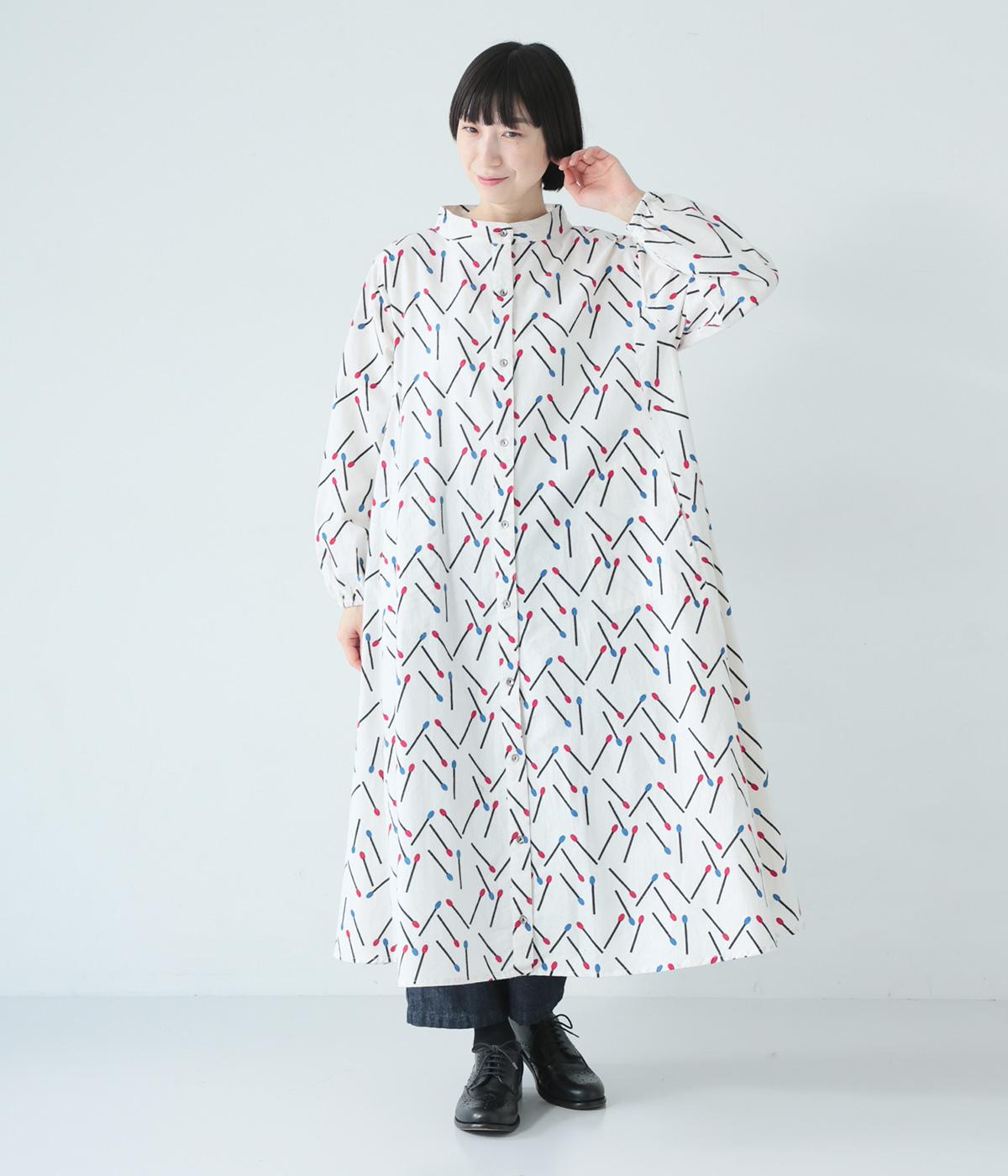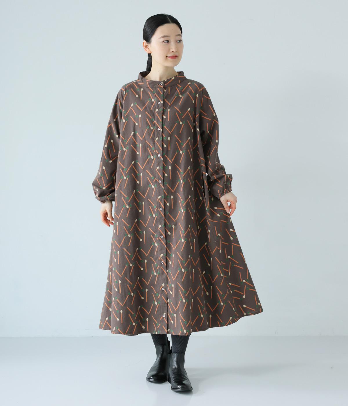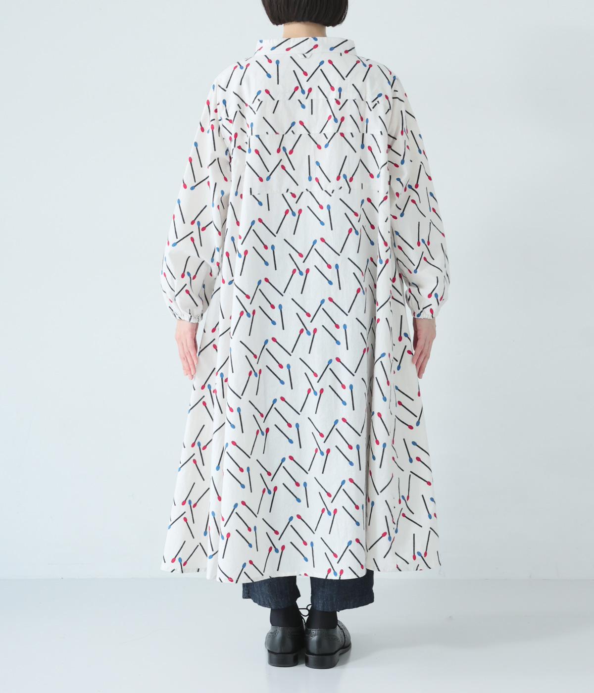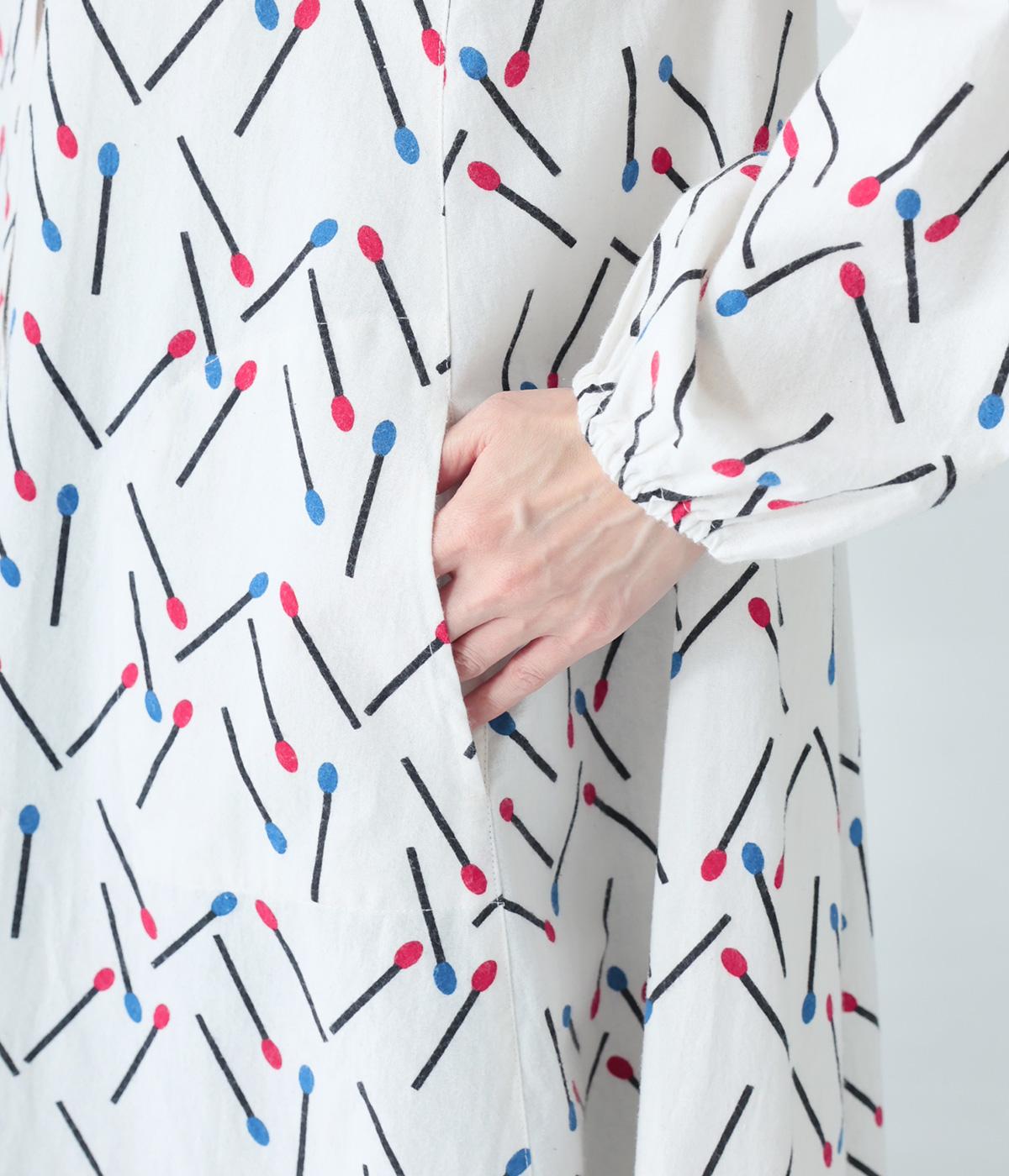 マッチをモチーフにした総柄がかわいいワンピース。バンドカラーで上品な印象に仕上げています。袖口にはゴムが入っているので、さっとたくし上げたアレンジも◎。裾にかけてふわりと広がるシルエットが美しく、羽織りものとしても活躍してくれます。