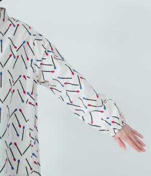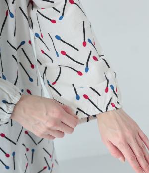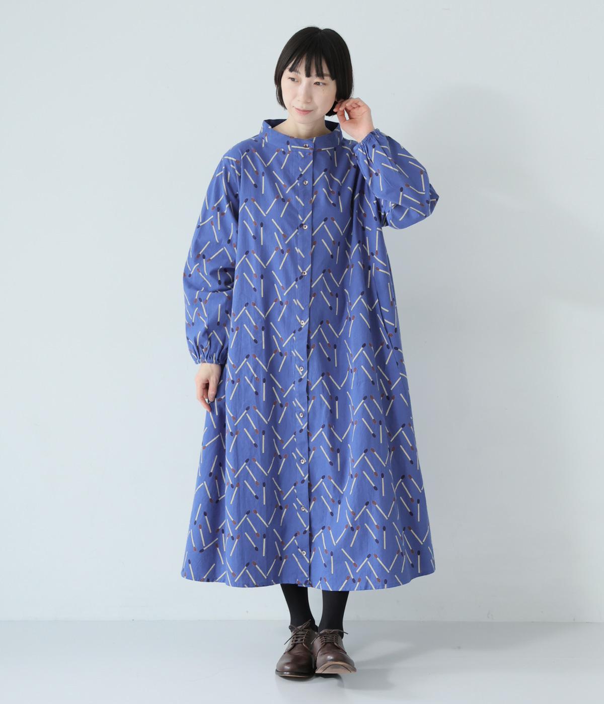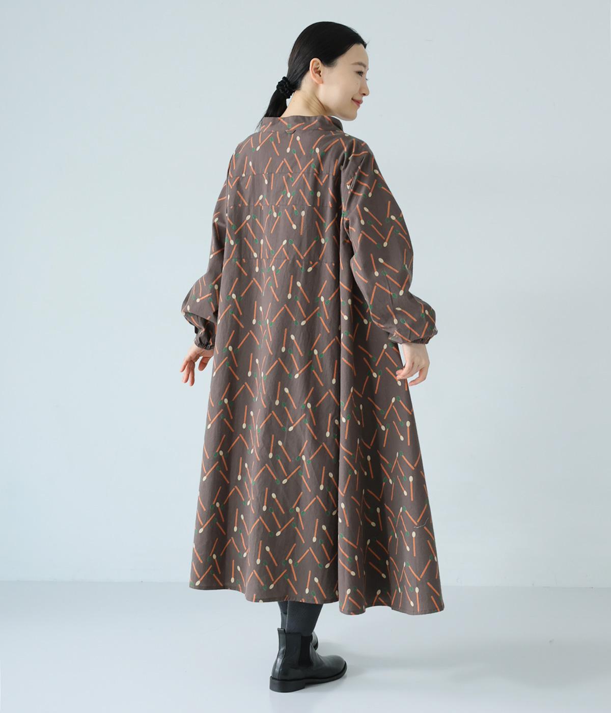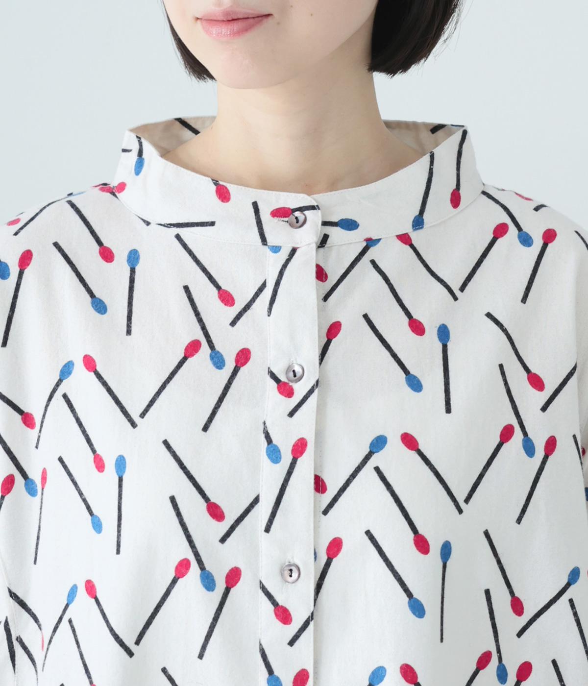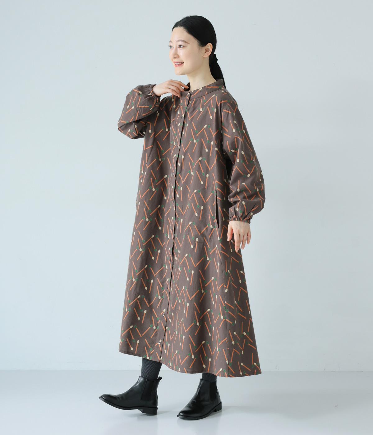 マッチをモチーフにした総柄がかわいいワンピース。バンドカラーで上品な印象に仕上げています。袖口にはゴムが入っているので、さっとたくし上げたアレンジも◎。裾にかけてふわりと広がるシルエットが美しく、羽織りものとしても活躍してくれます。