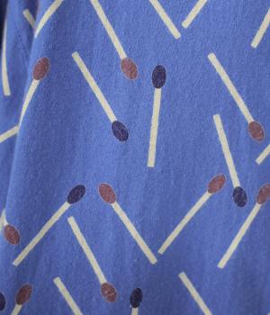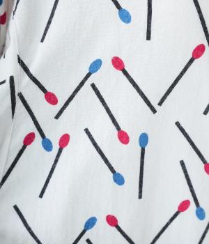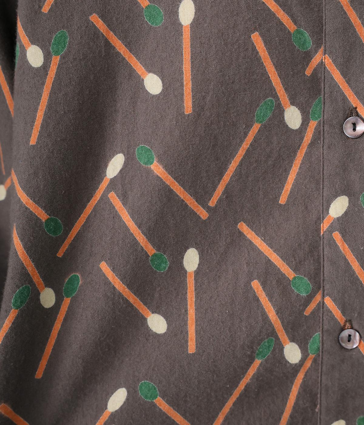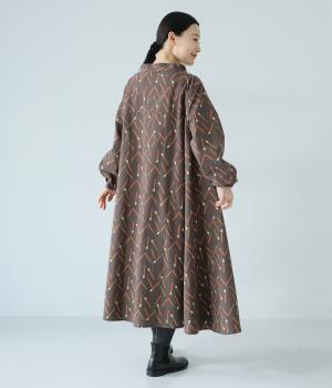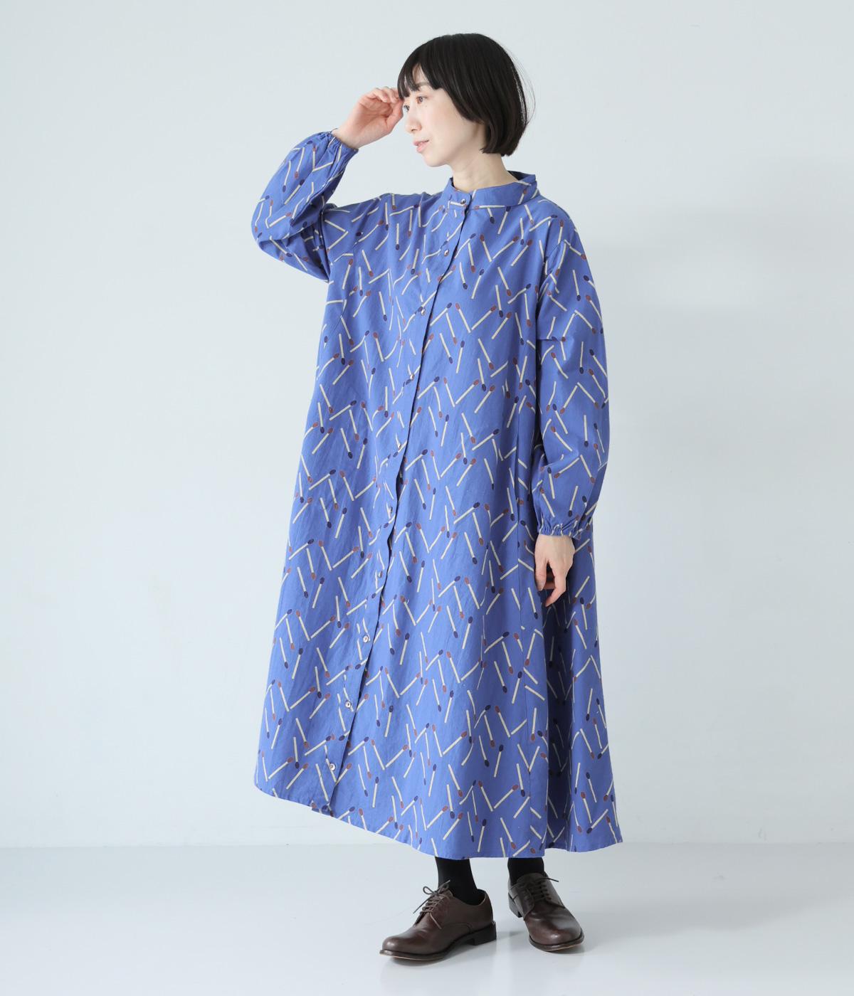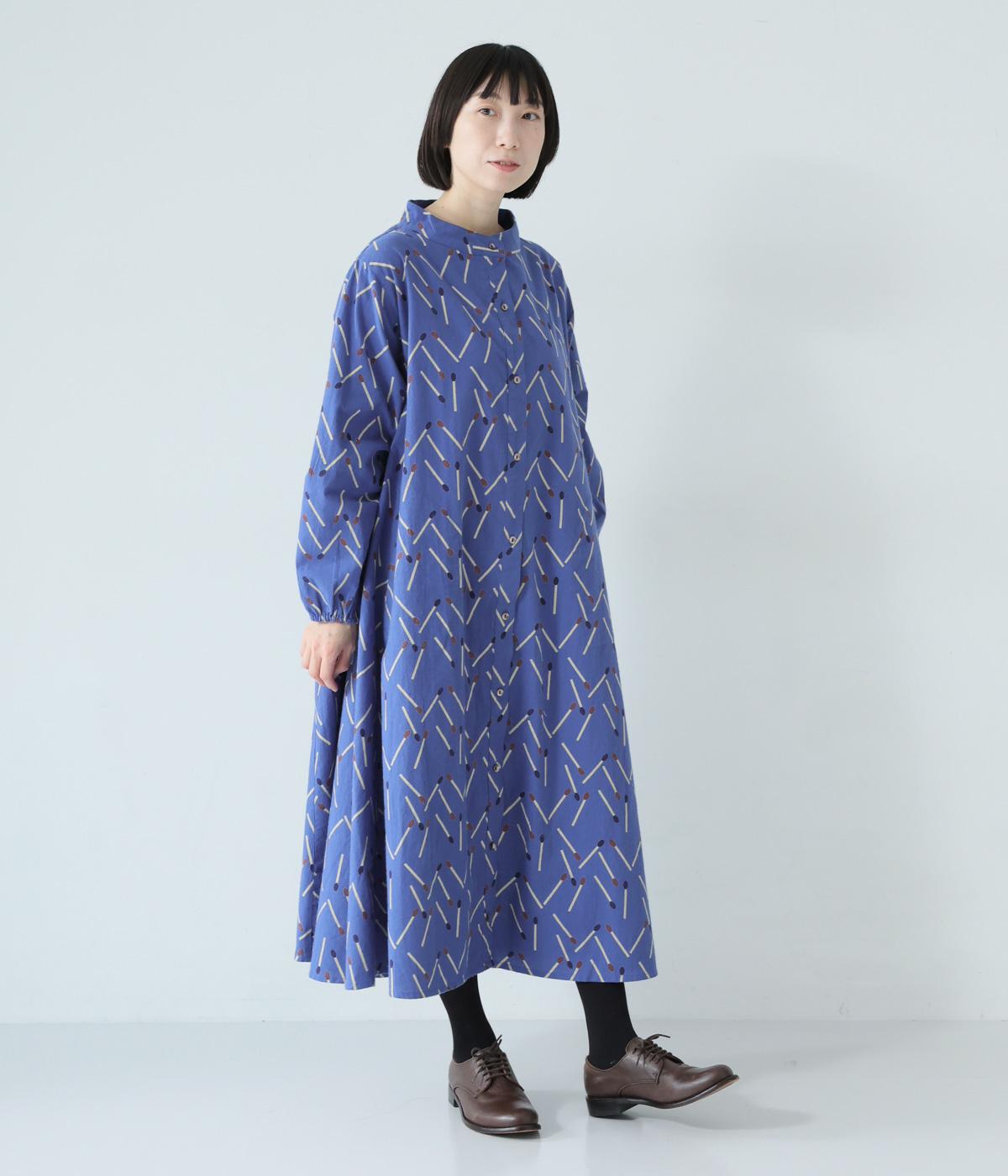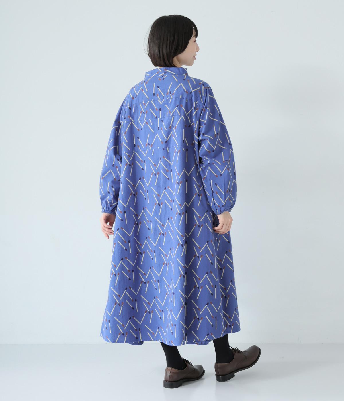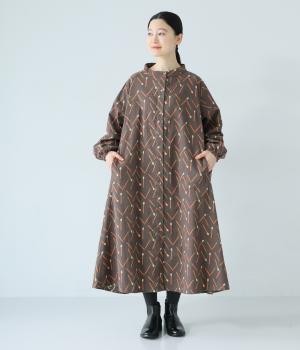 マッチをモチーフにした総柄がかわいいワンピース。バンドカラーで上品な印象に仕上げています。袖口にはゴムが入っているので、さっとたくし上げたアレンジも◎。裾にかけてふわりと広がるシルエットが美しく、羽織りものとしても活躍してくれます。