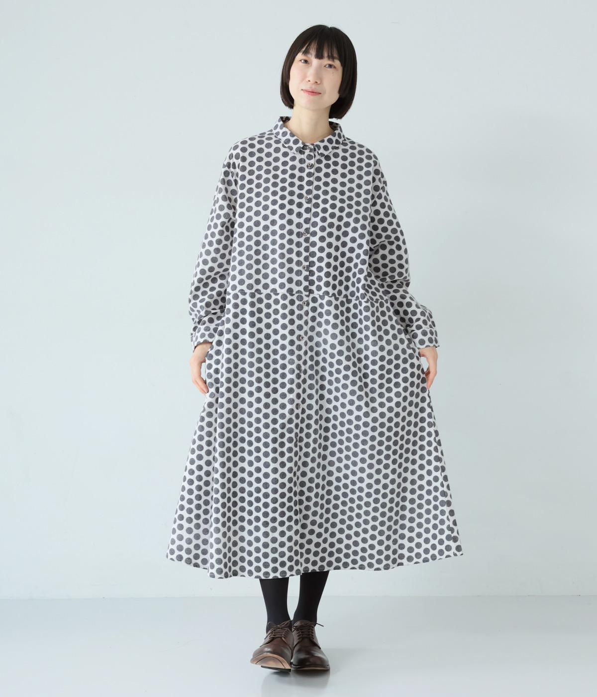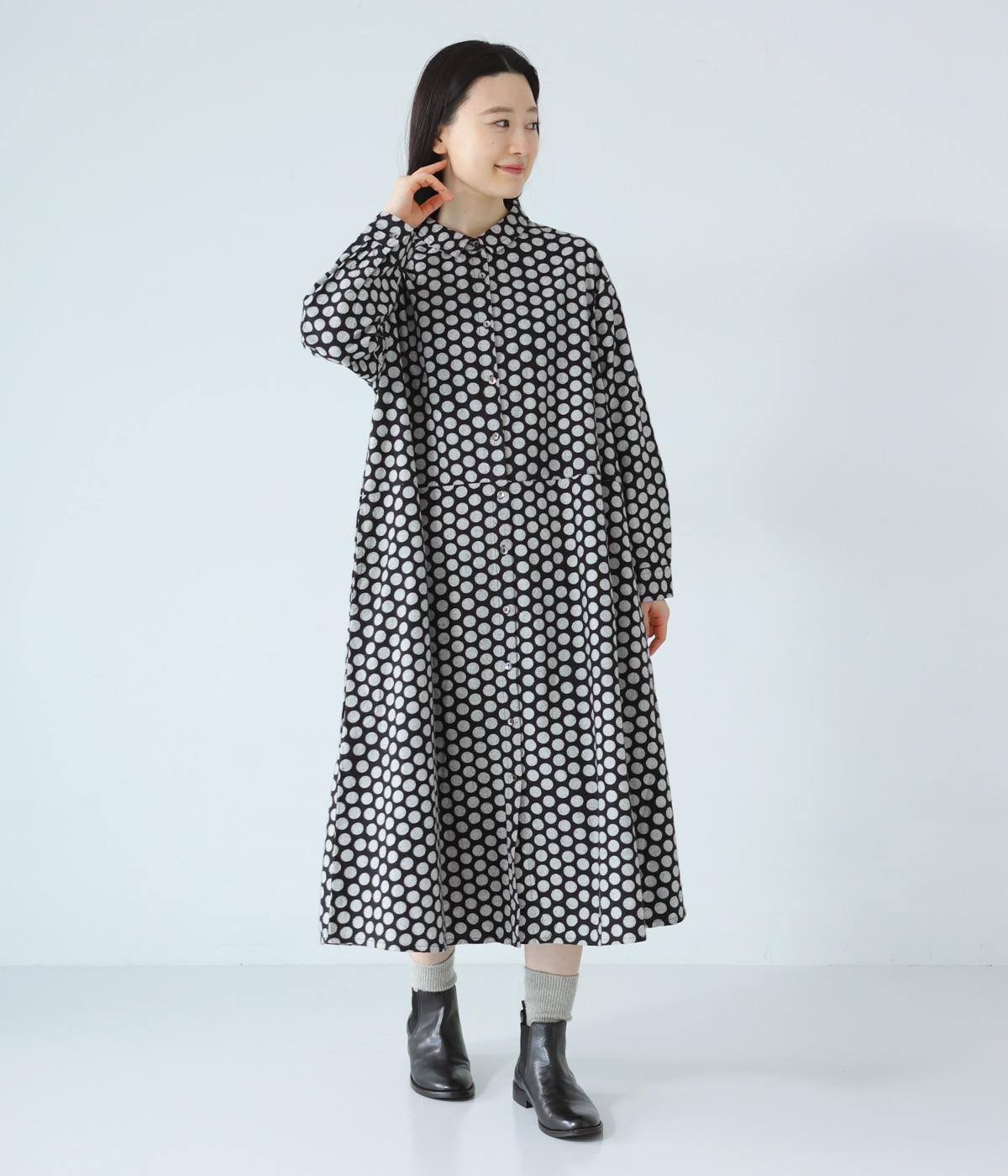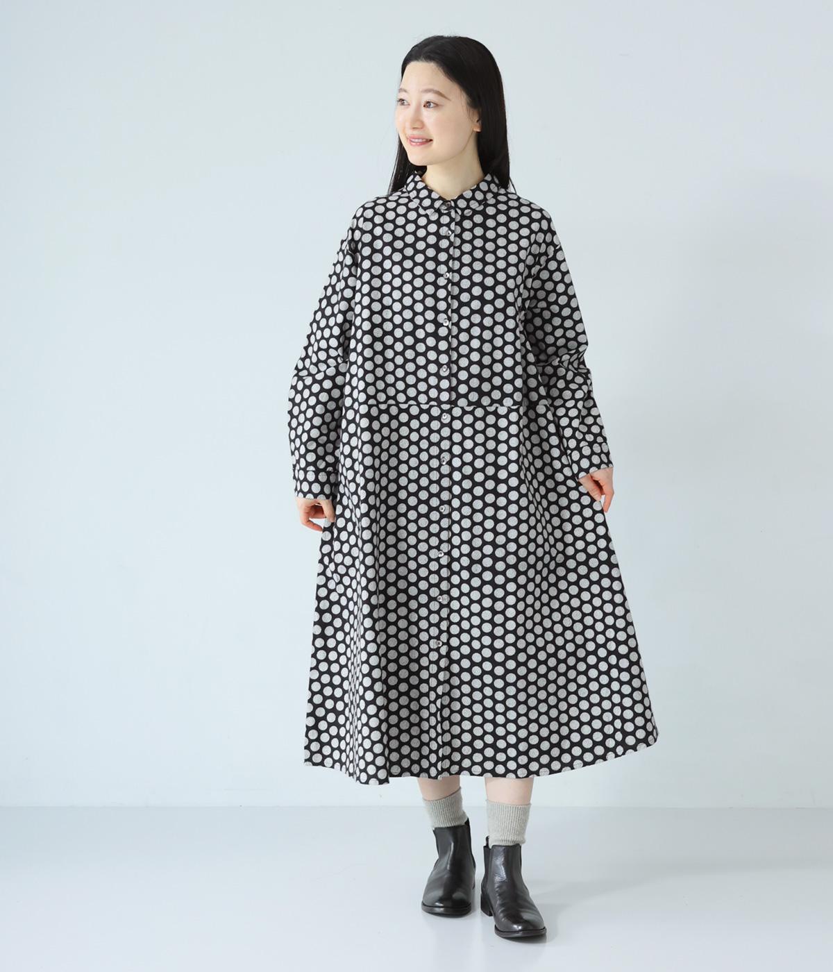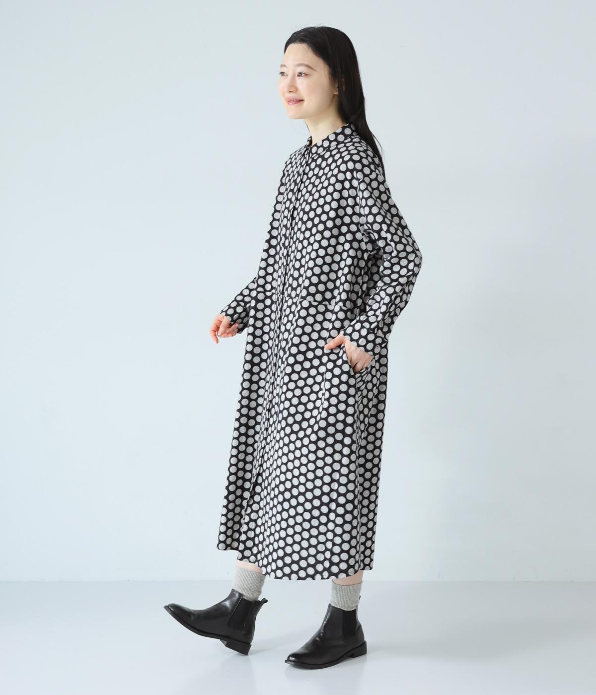 モノトーンのシックなドット柄がポイントのワンピース。甘くなりすぎない、大人らしい総柄スタイルが楽しめる一枚です。ウエストの切り替えが、バランスをアップ。ボタンをあけて羽織りものとして着まわすのもおすすめです。