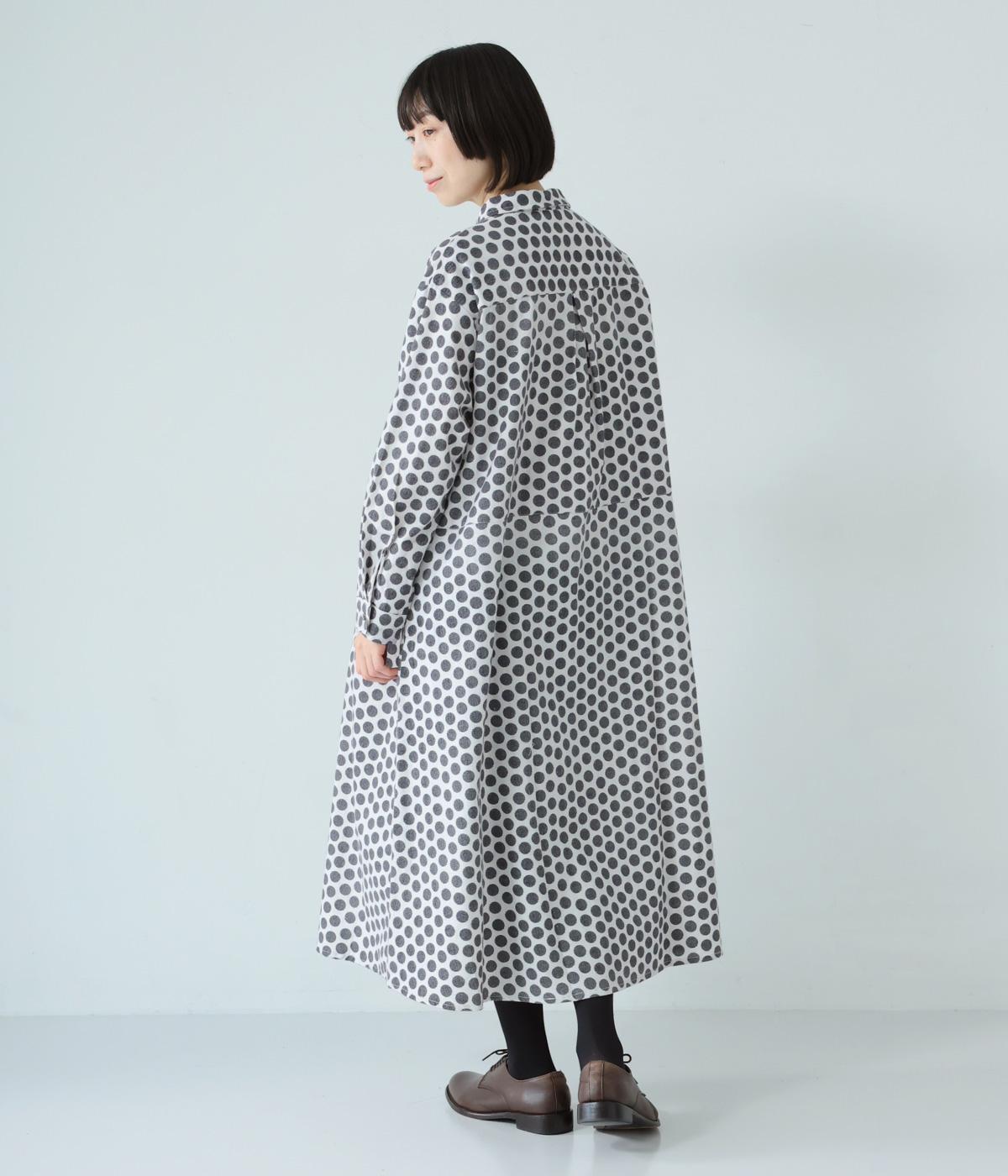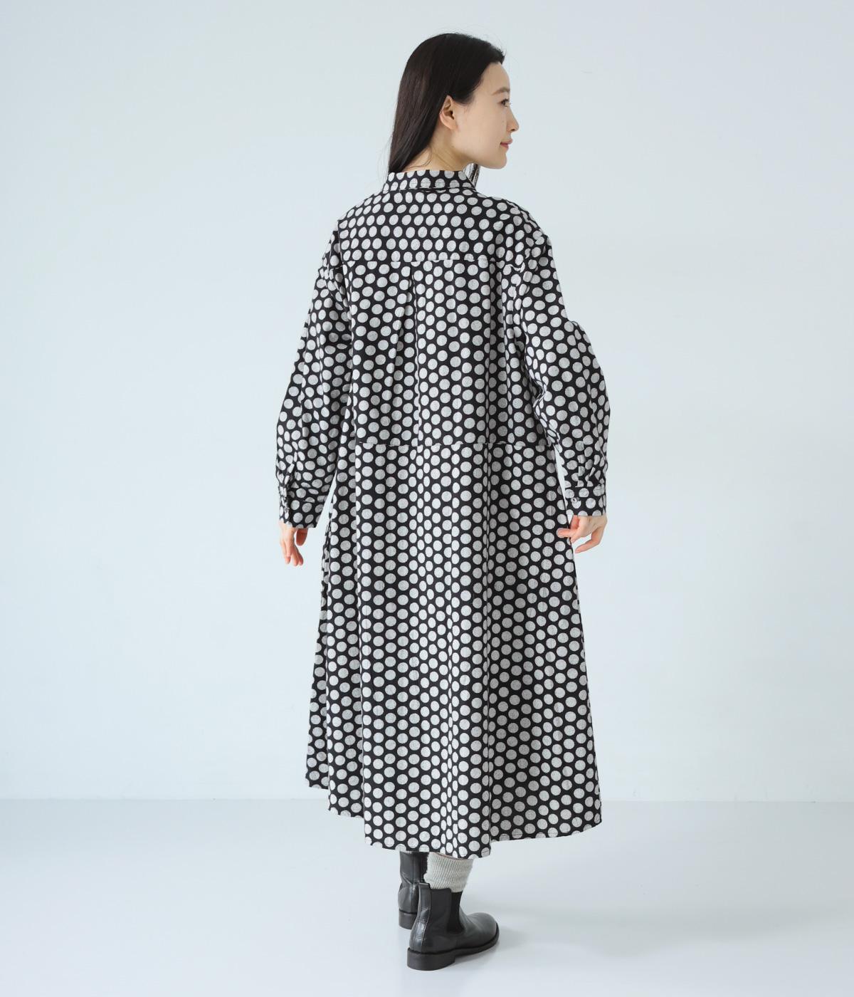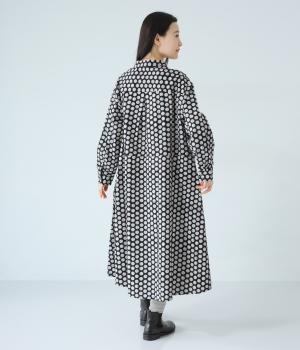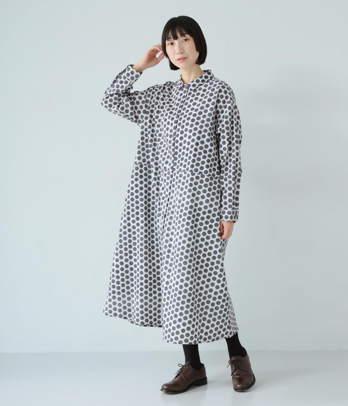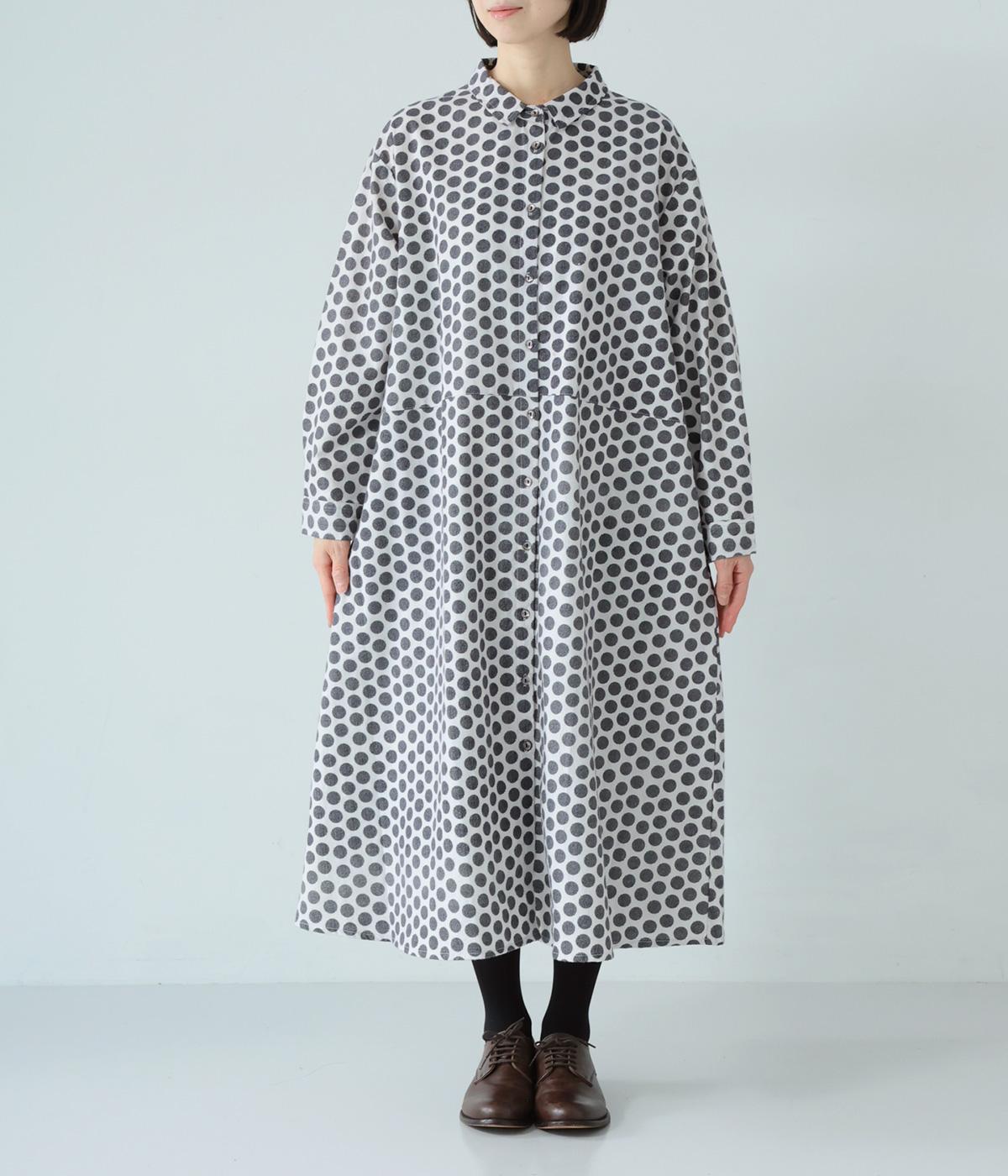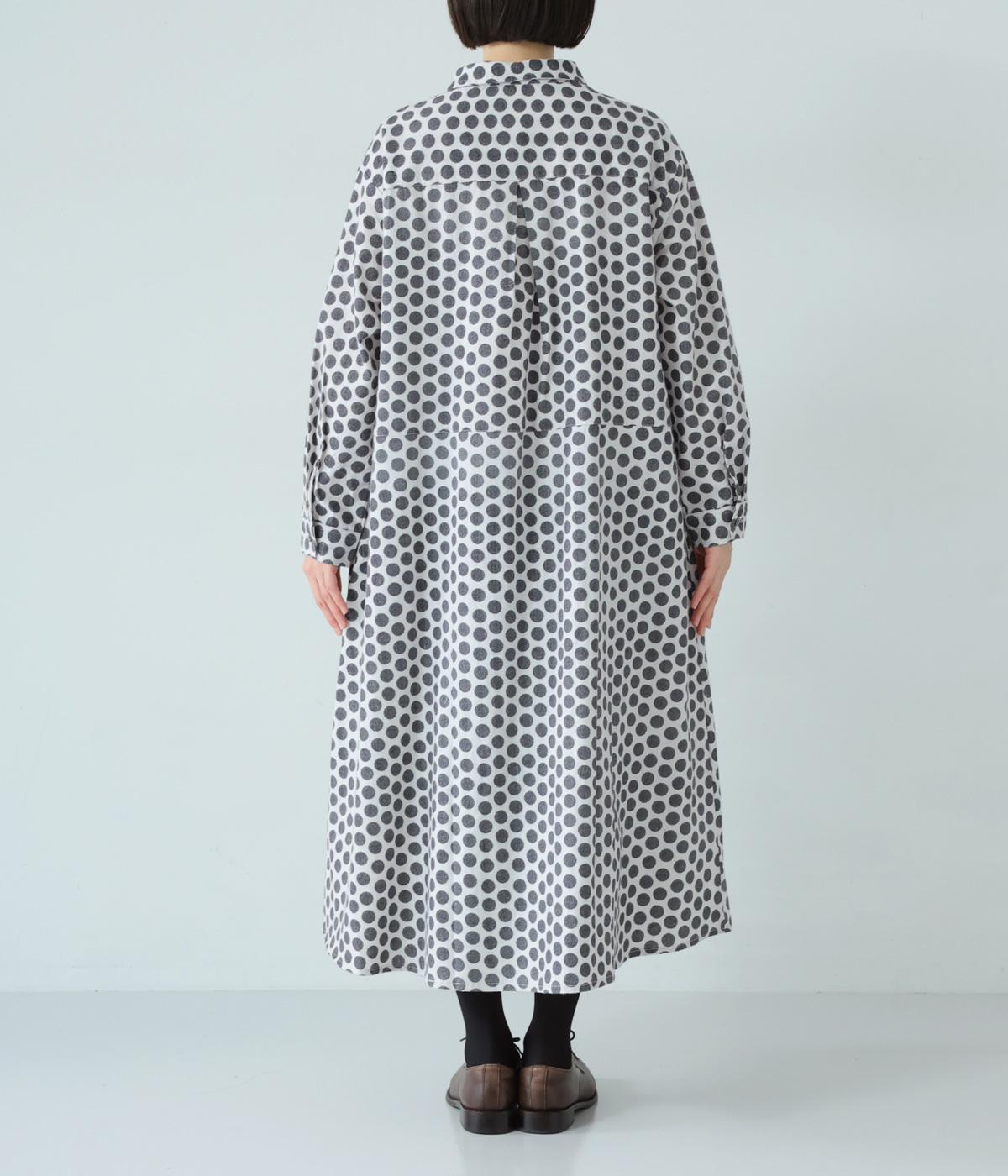 モノトーンのシックなドット柄がポイントのワンピース。甘くなりすぎない、大人らしい総柄スタイルが楽しめる一枚です。ウエストの切り替えが、バランスをアップ。ボタンをあけて羽織りものとして着まわすのもおすすめです。