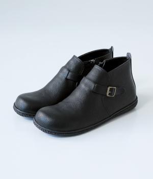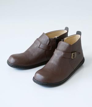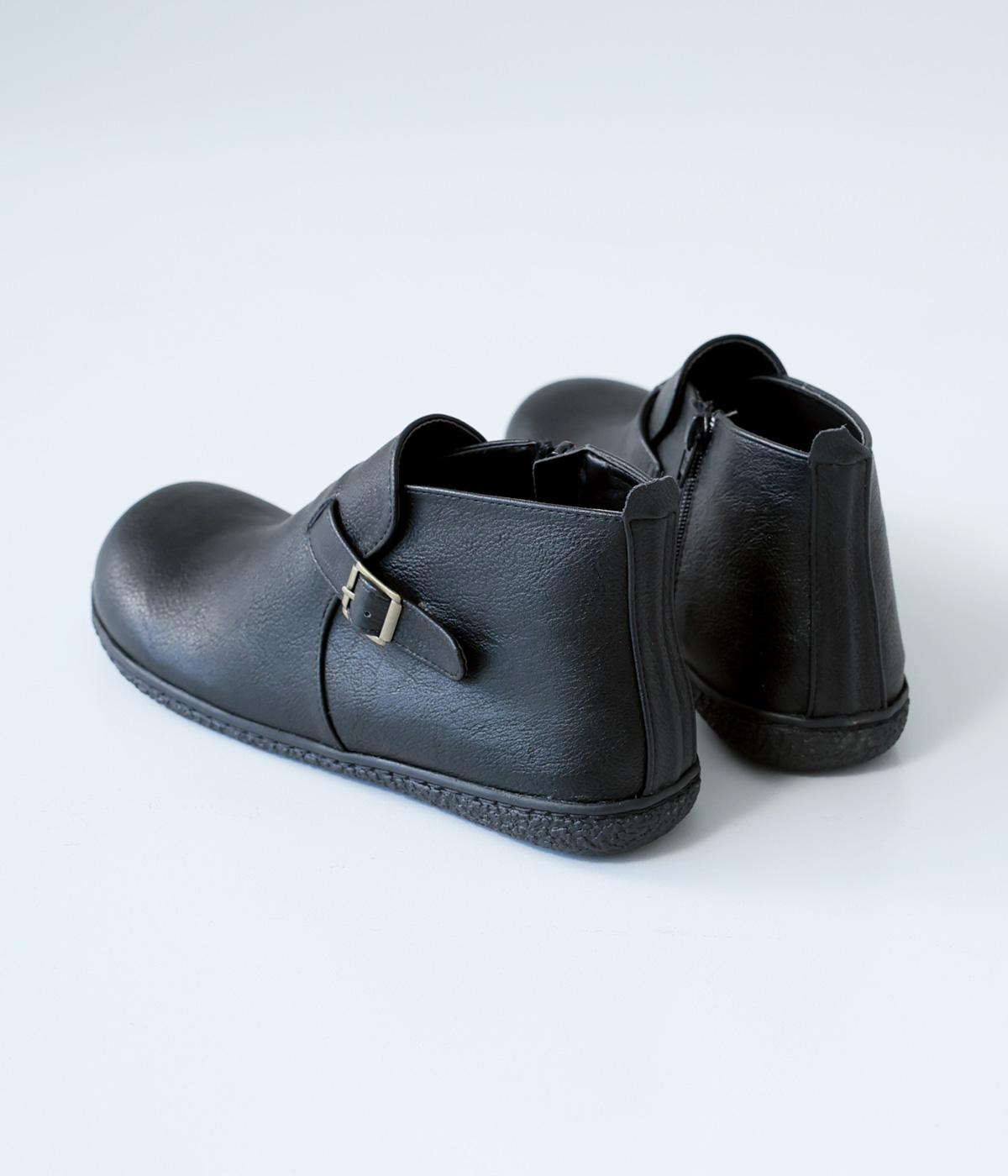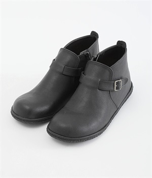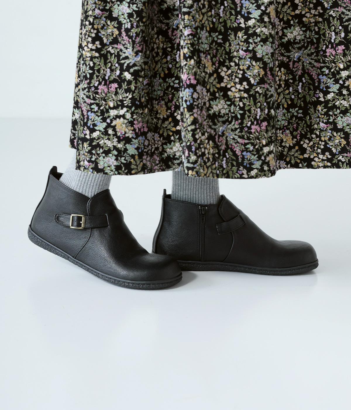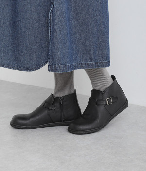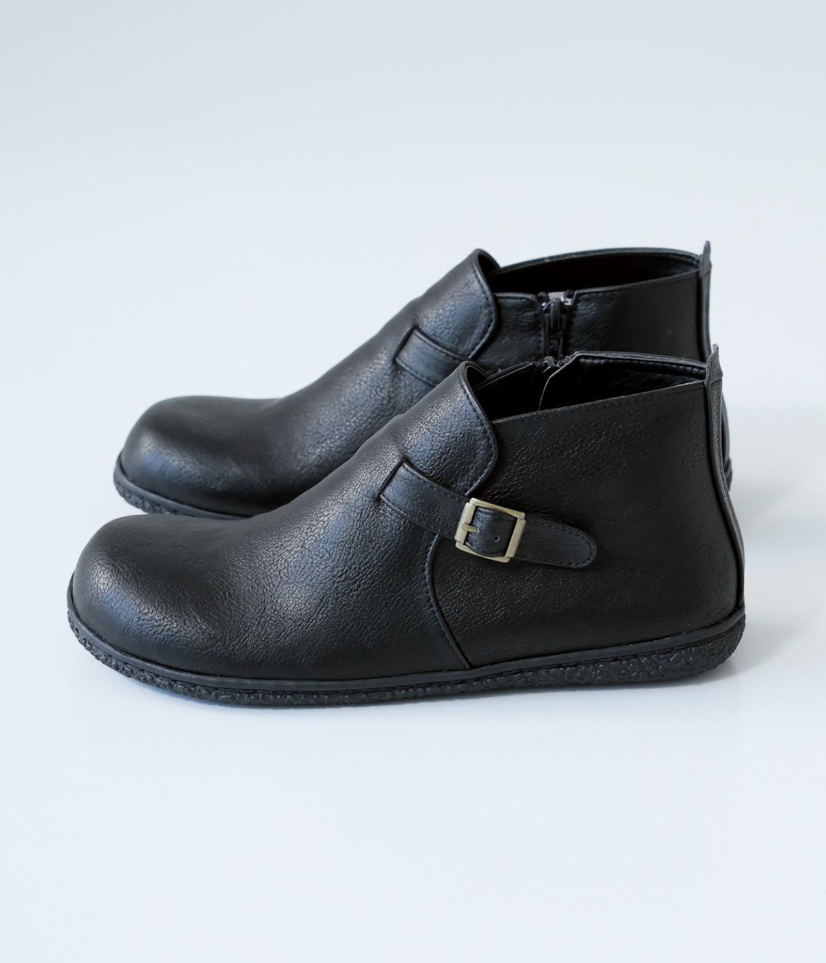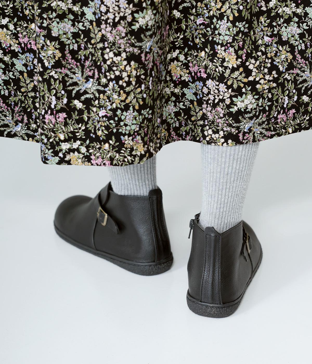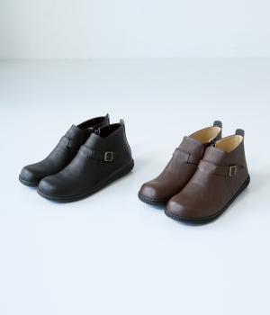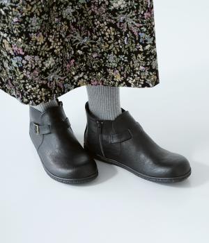 甲に配したベルトデザインがおしゃれなショートブーツ。くるぶしほどの高さと丸みのあるフォルムがかわいらしく、ソックスとのコーディネートも存分にたのしめます。内側には脱ぎ履きをアシストするファスナーをつけました。