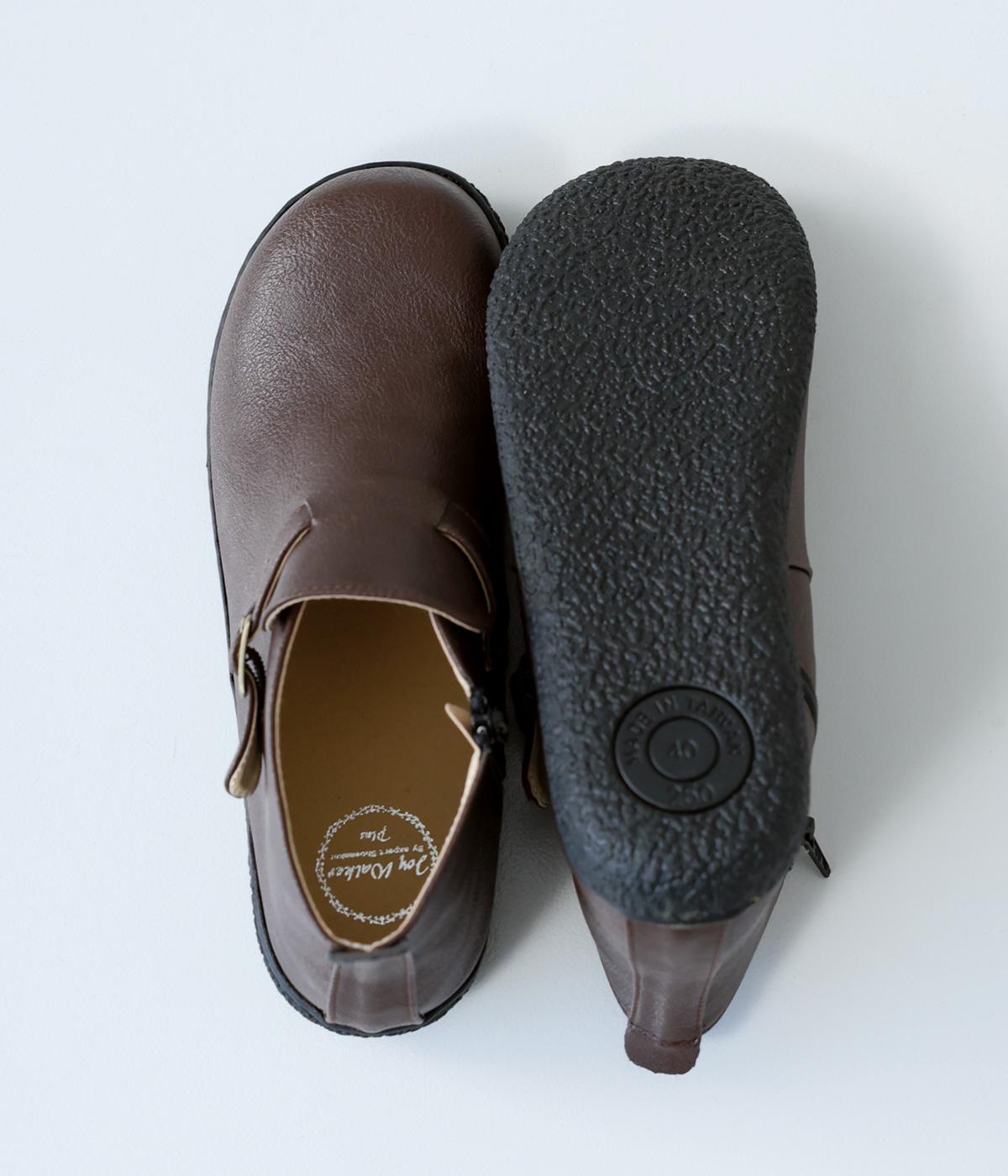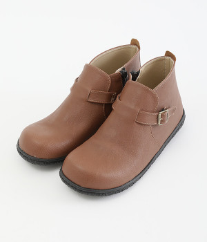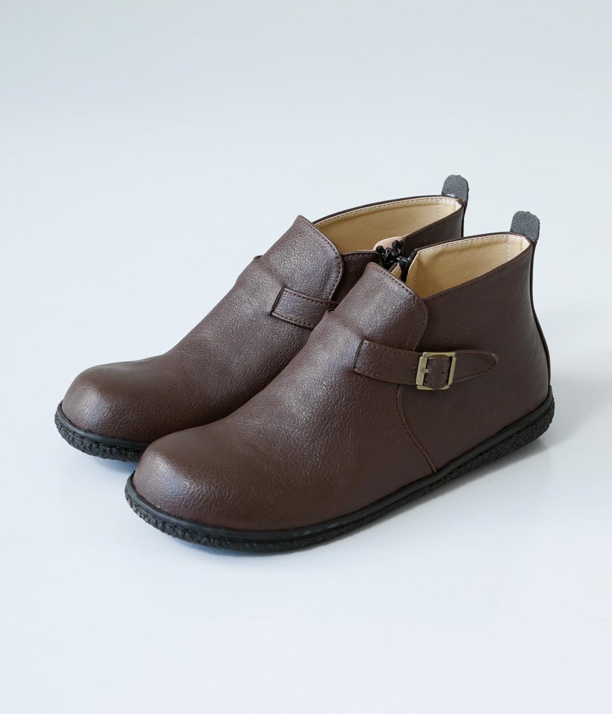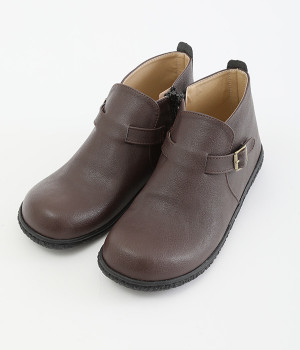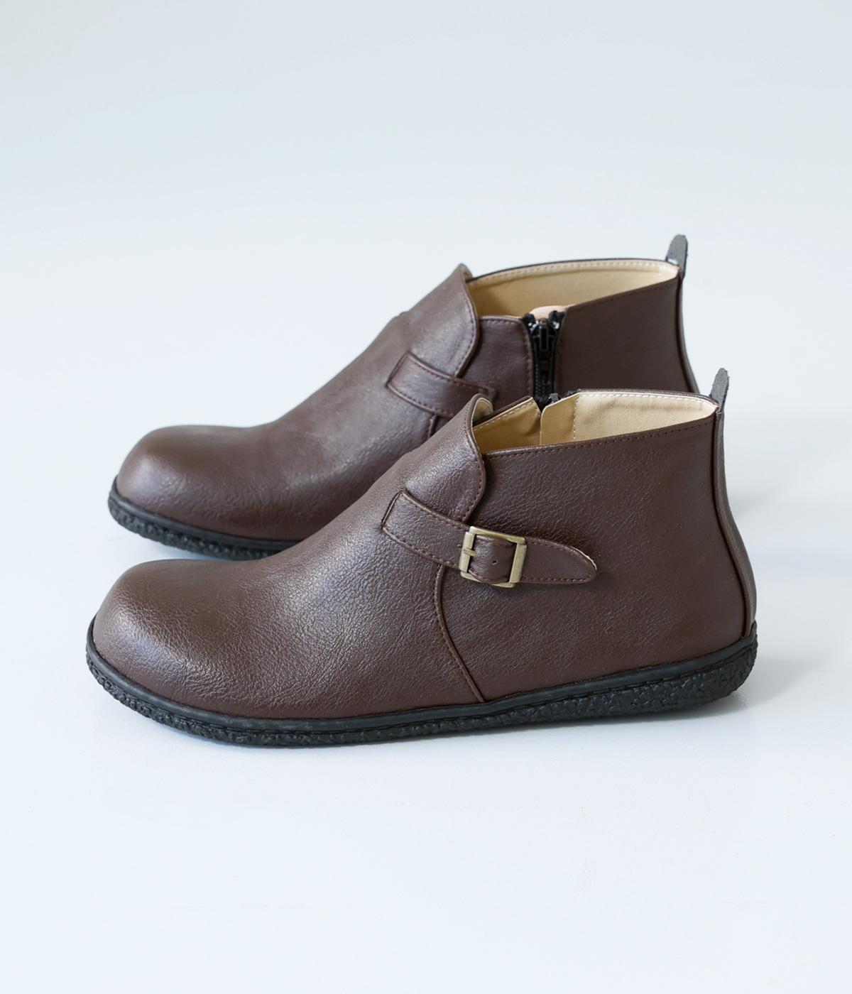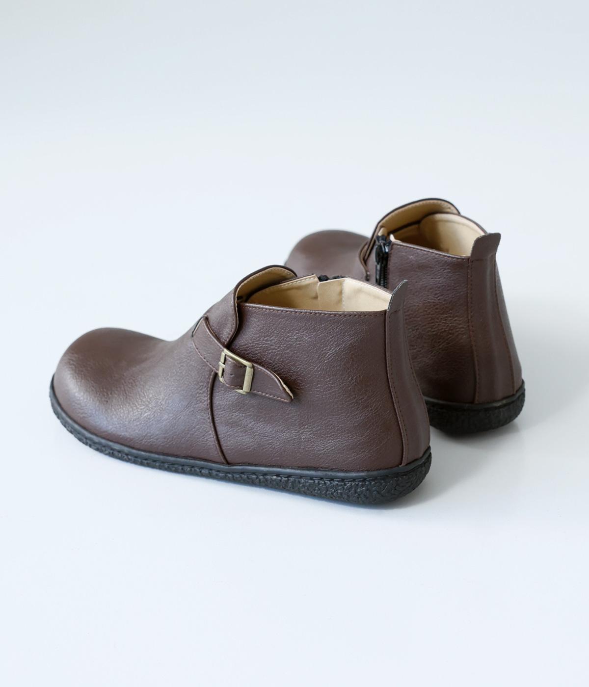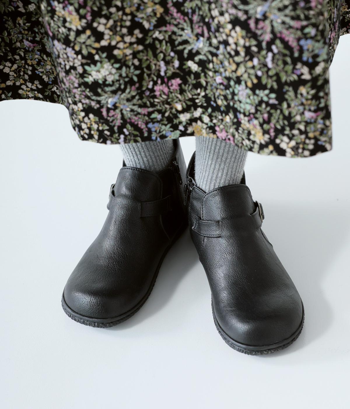 甲に配したベルトデザインがおしゃれなショートブーツ。くるぶしほどの高さと丸みのあるフォルムがかわいらしく、ソックスとのコーディネートも存分にたのしめます。内側には脱ぎ履きをアシストするファスナーをつけました。