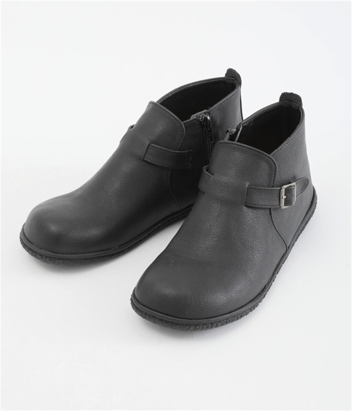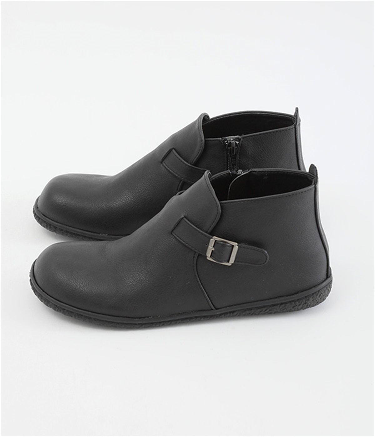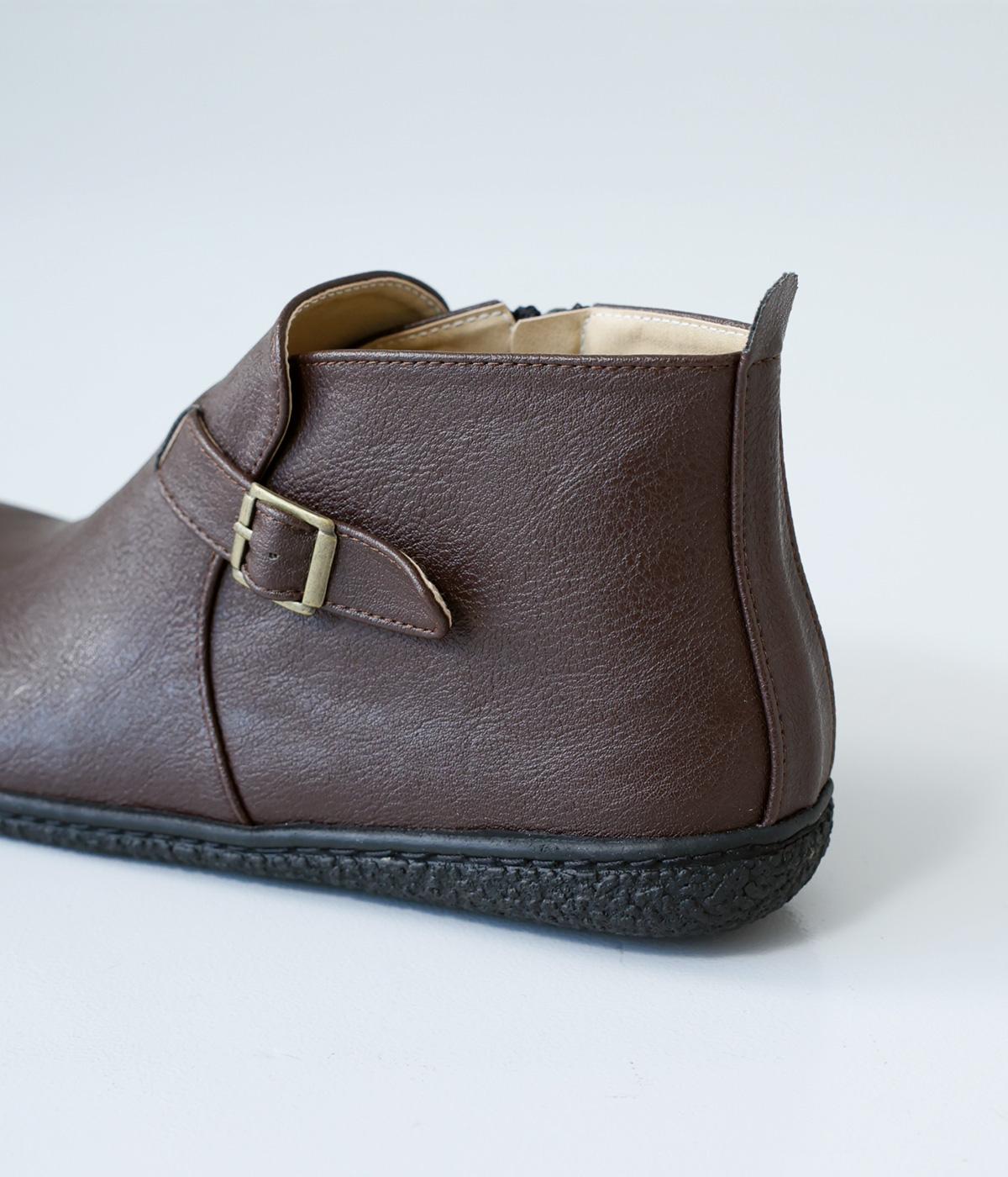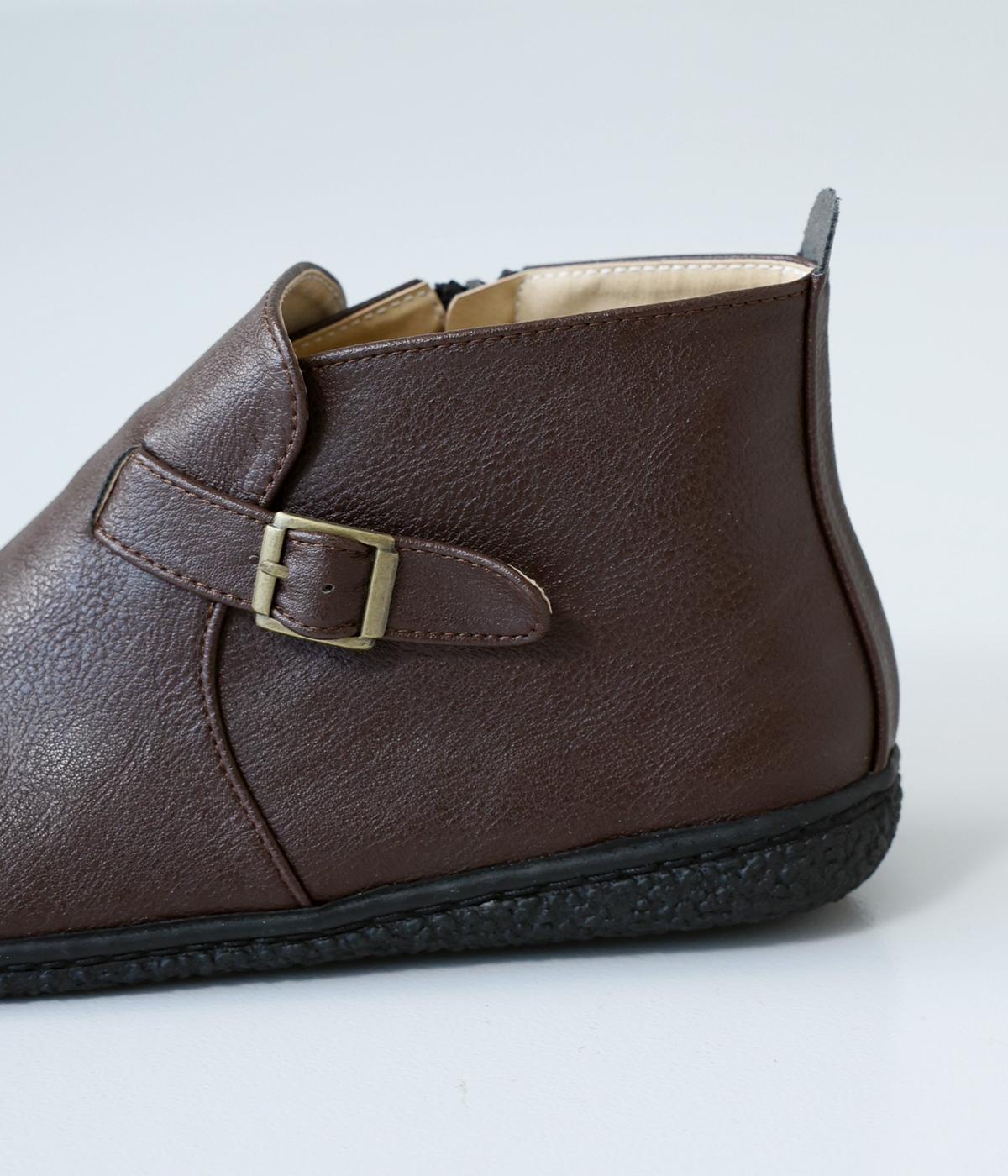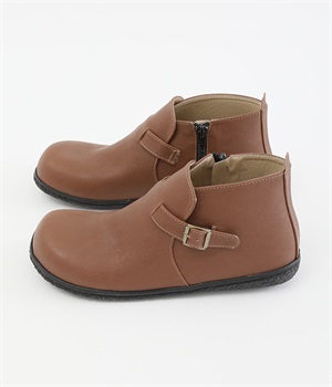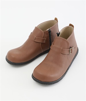 甲に配したベルトデザインがおしゃれなショートブーツ。くるぶしほどの高さと丸みのあるフォルムがかわいらしく、ソックスとのコーディネートも存分にたのしめます。内側には脱ぎ履きをアシストするファスナーをつけました。
