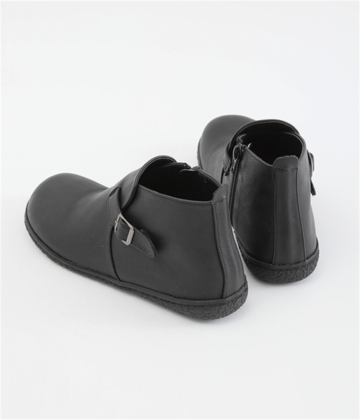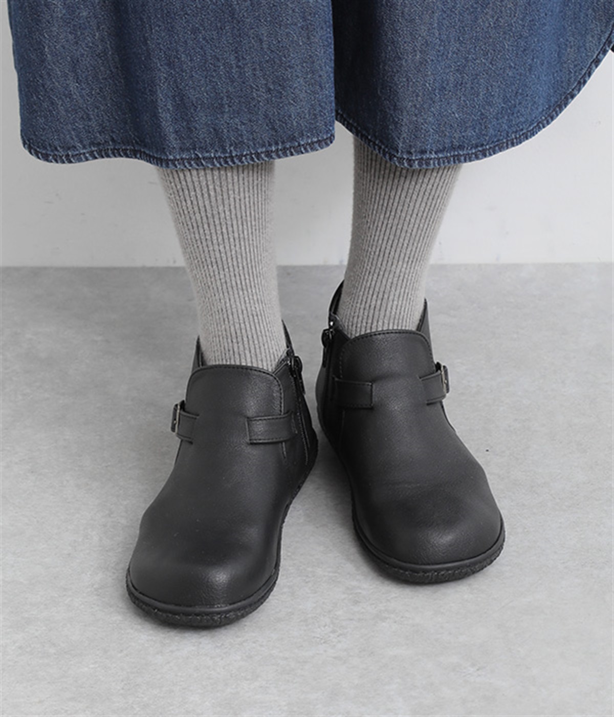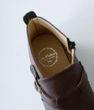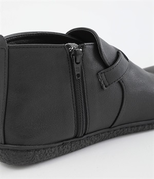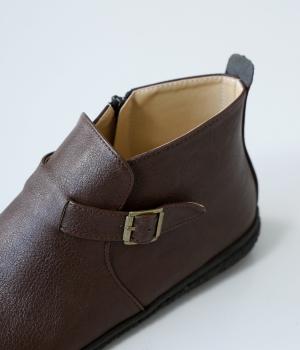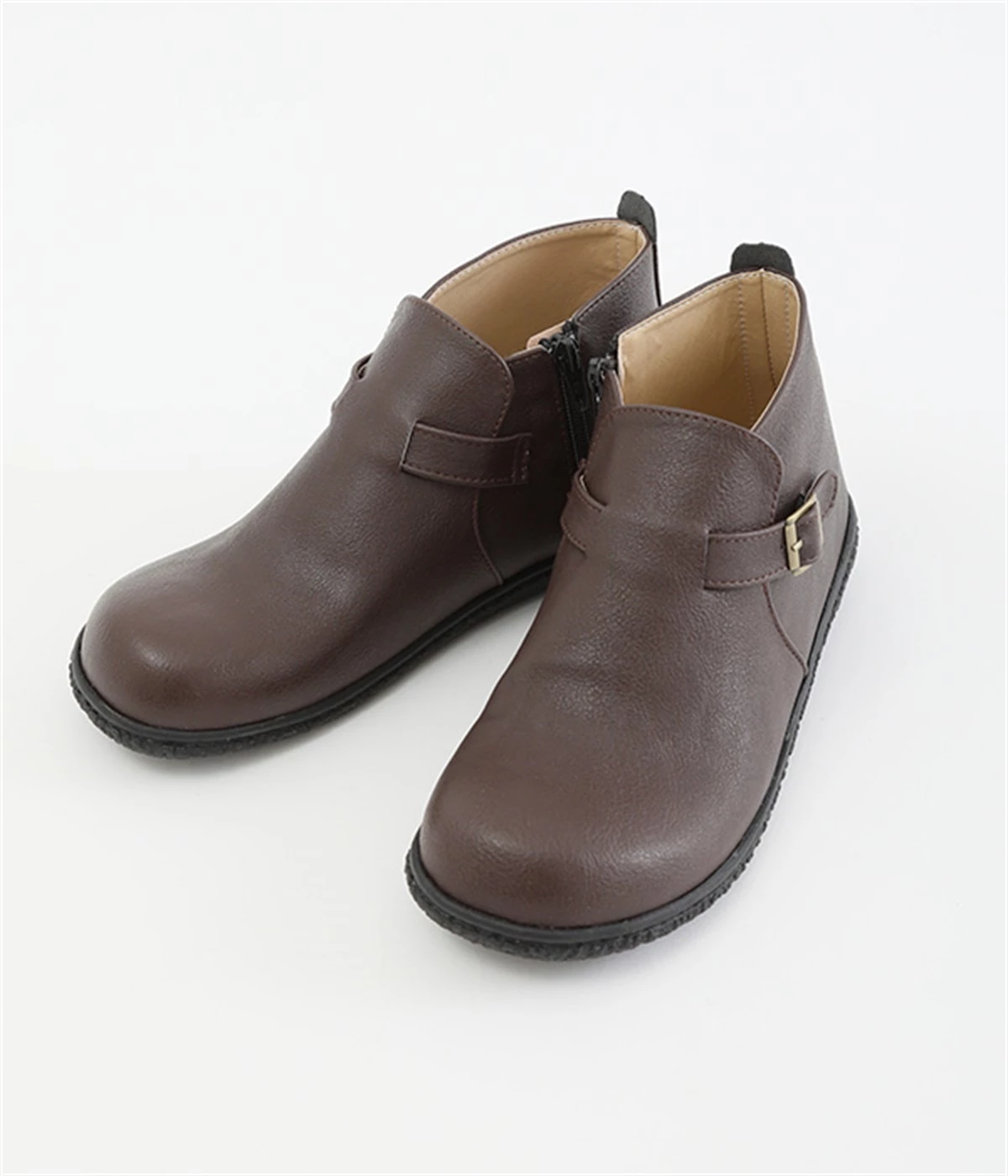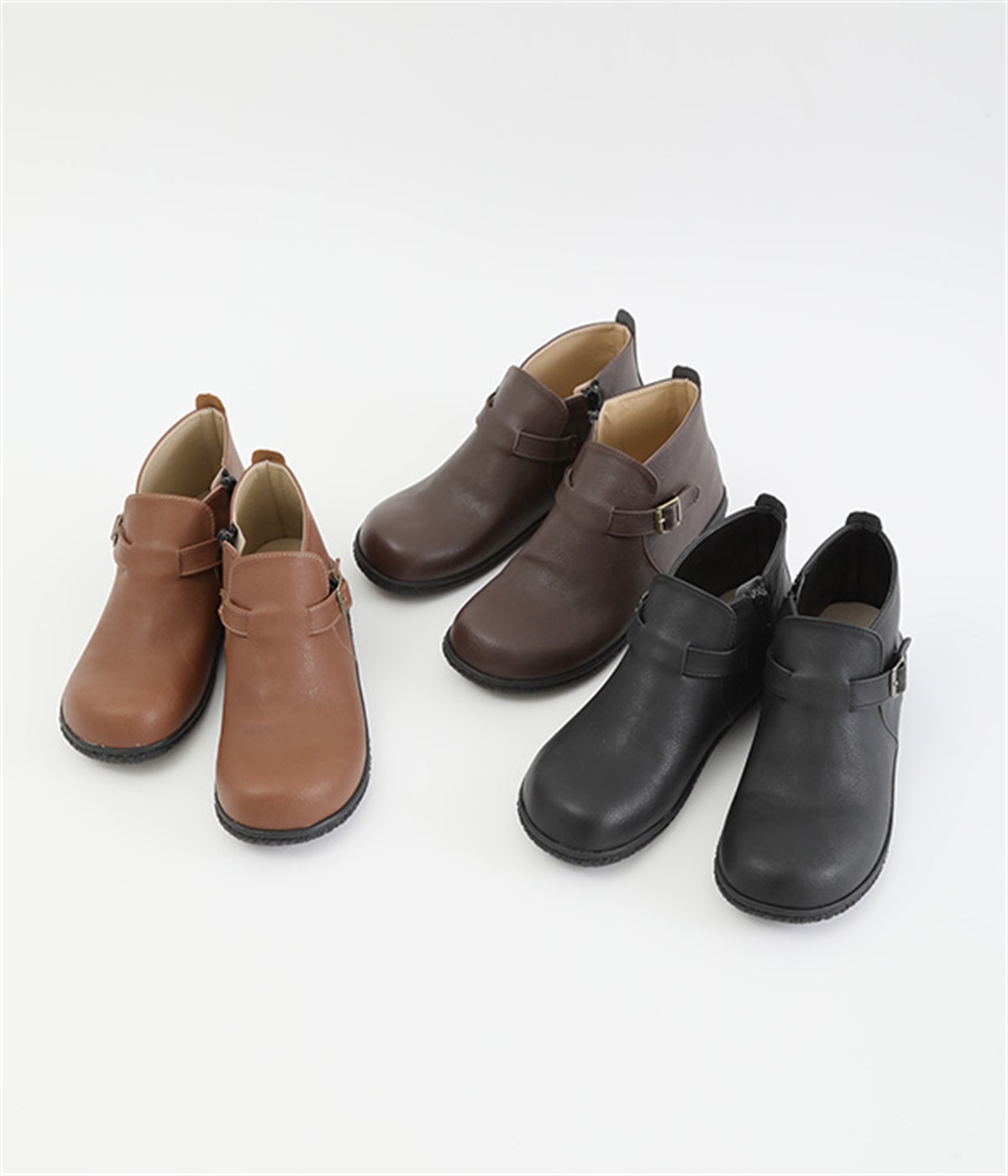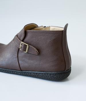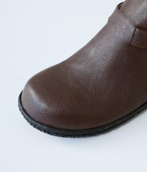 甲に配したベルトデザインがおしゃれなショートブーツ。くるぶしほどの高さと丸みのあるフォルムがかわいらしく、ソックスとのコーディネートも存分にたのしめます。内側には脱ぎ履きをアシストするファスナーをつけました。