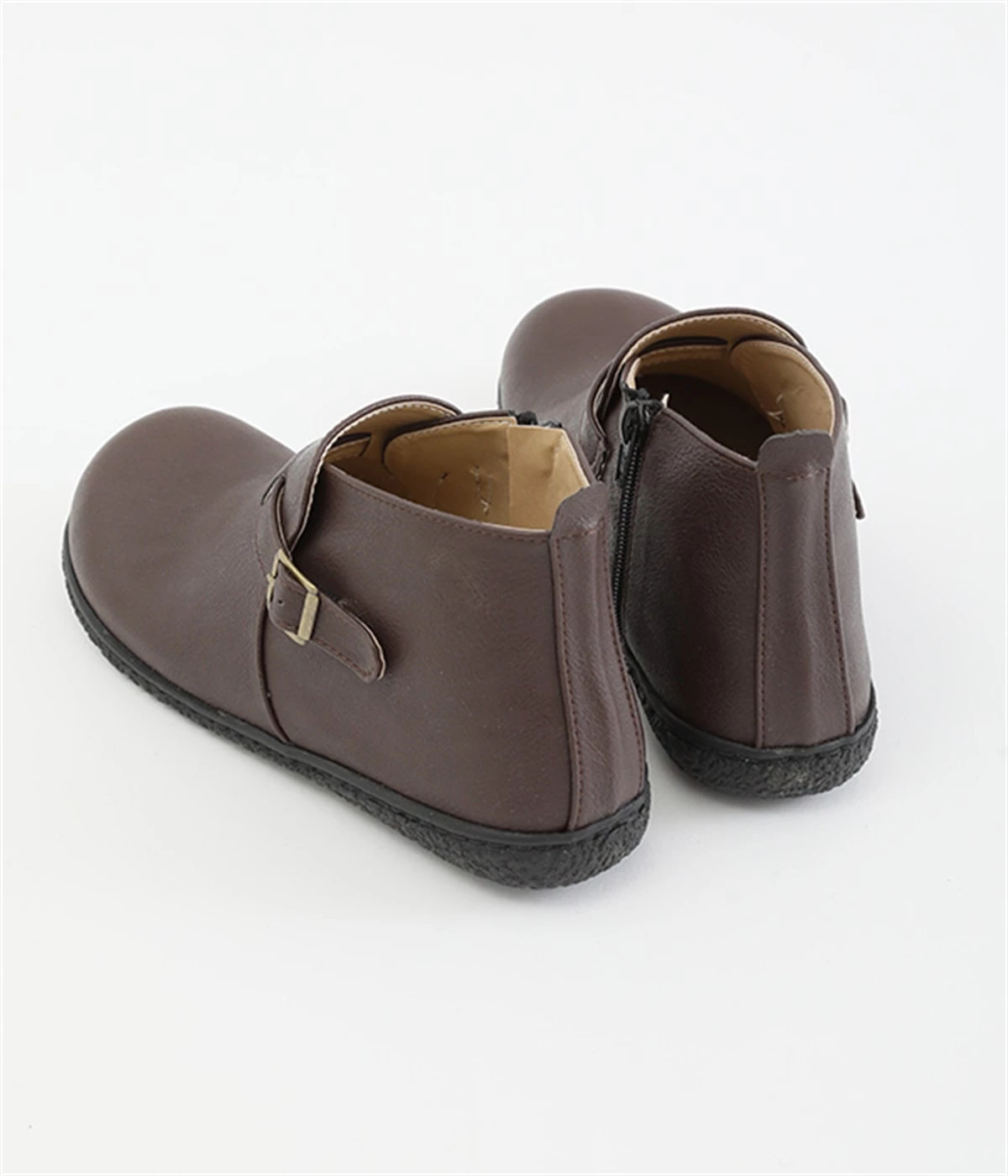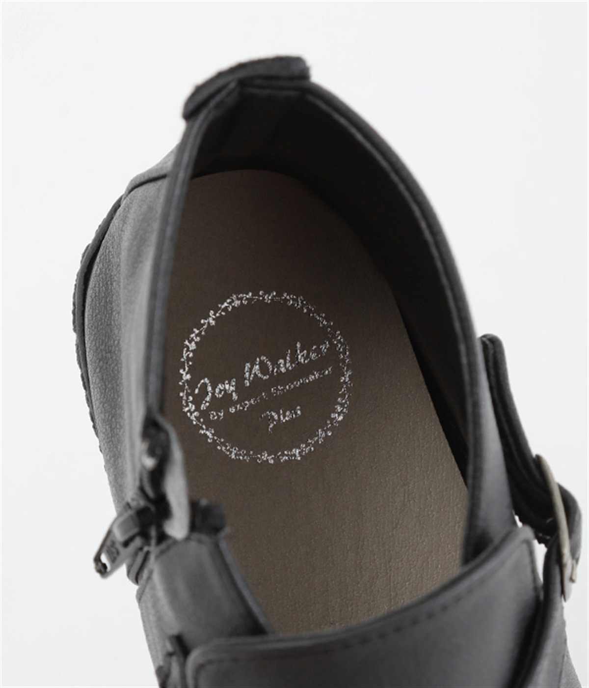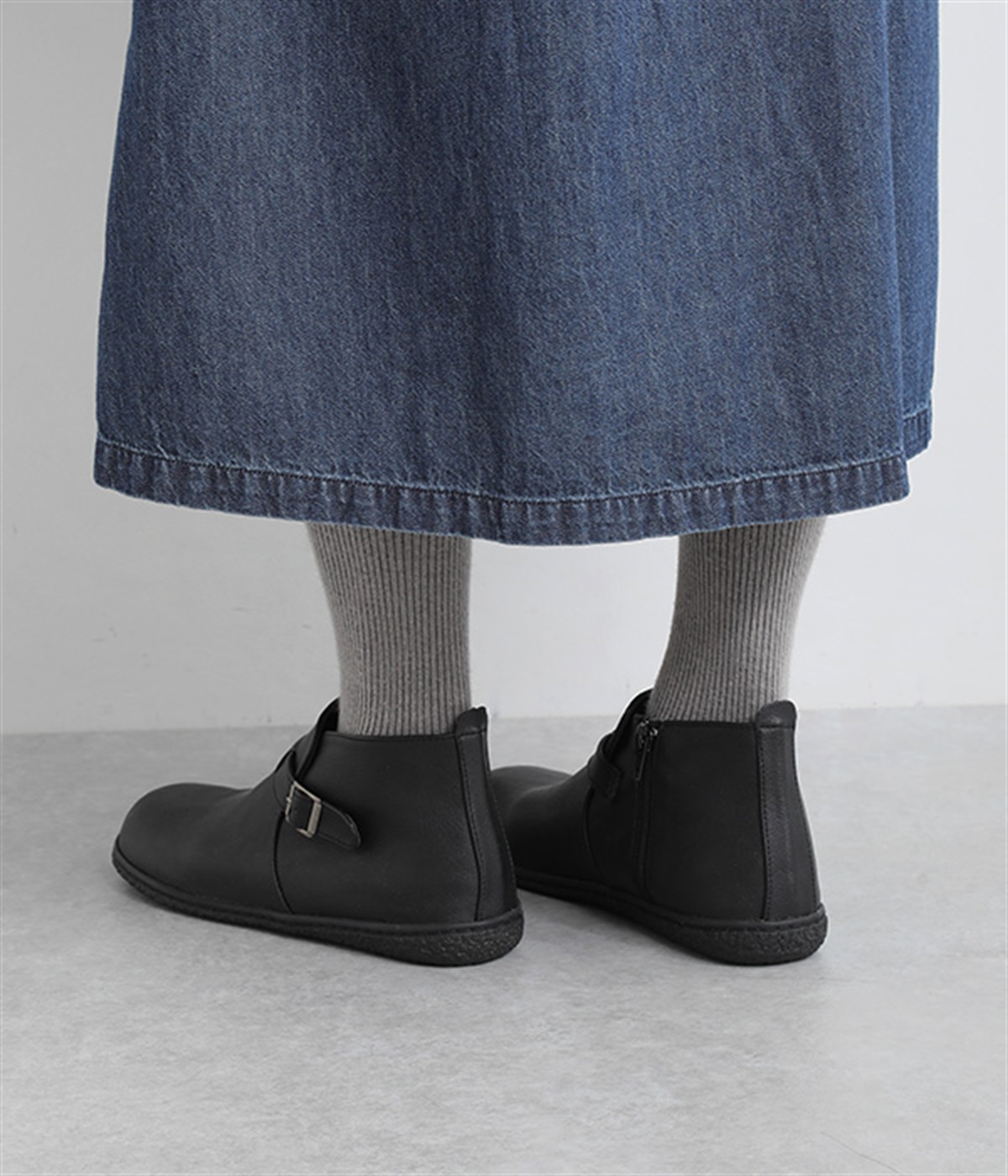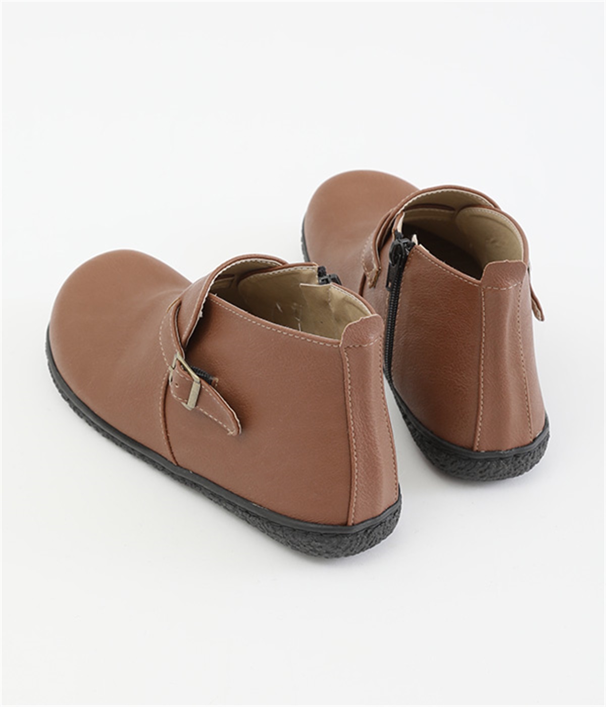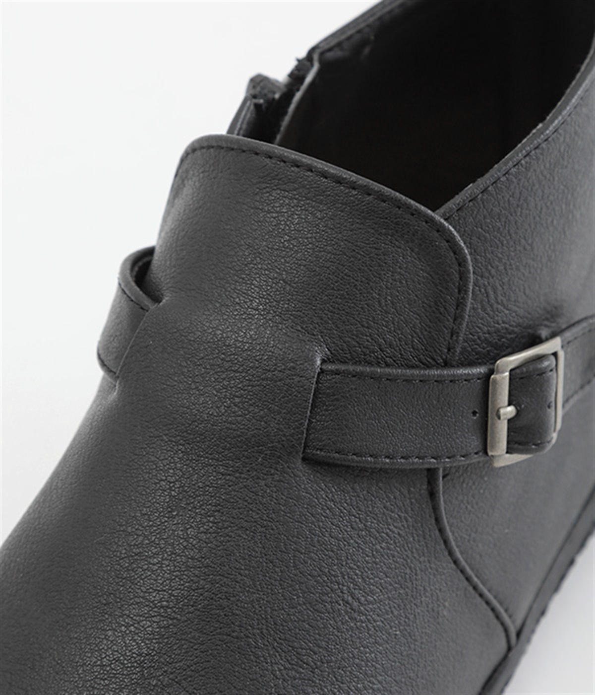 甲に配したベルトデザインがおしゃれなショートブーツ。くるぶしほどの高さと丸みのあるフォルムがかわいらしく、ソックスとのコーディネートも存分にたのしめます。内側には脱ぎ履きをアシストするファスナーをつけました。