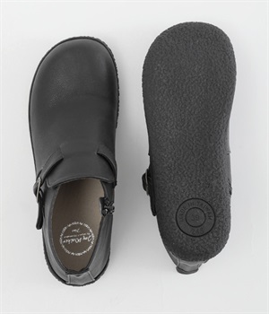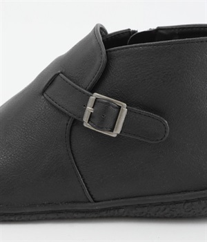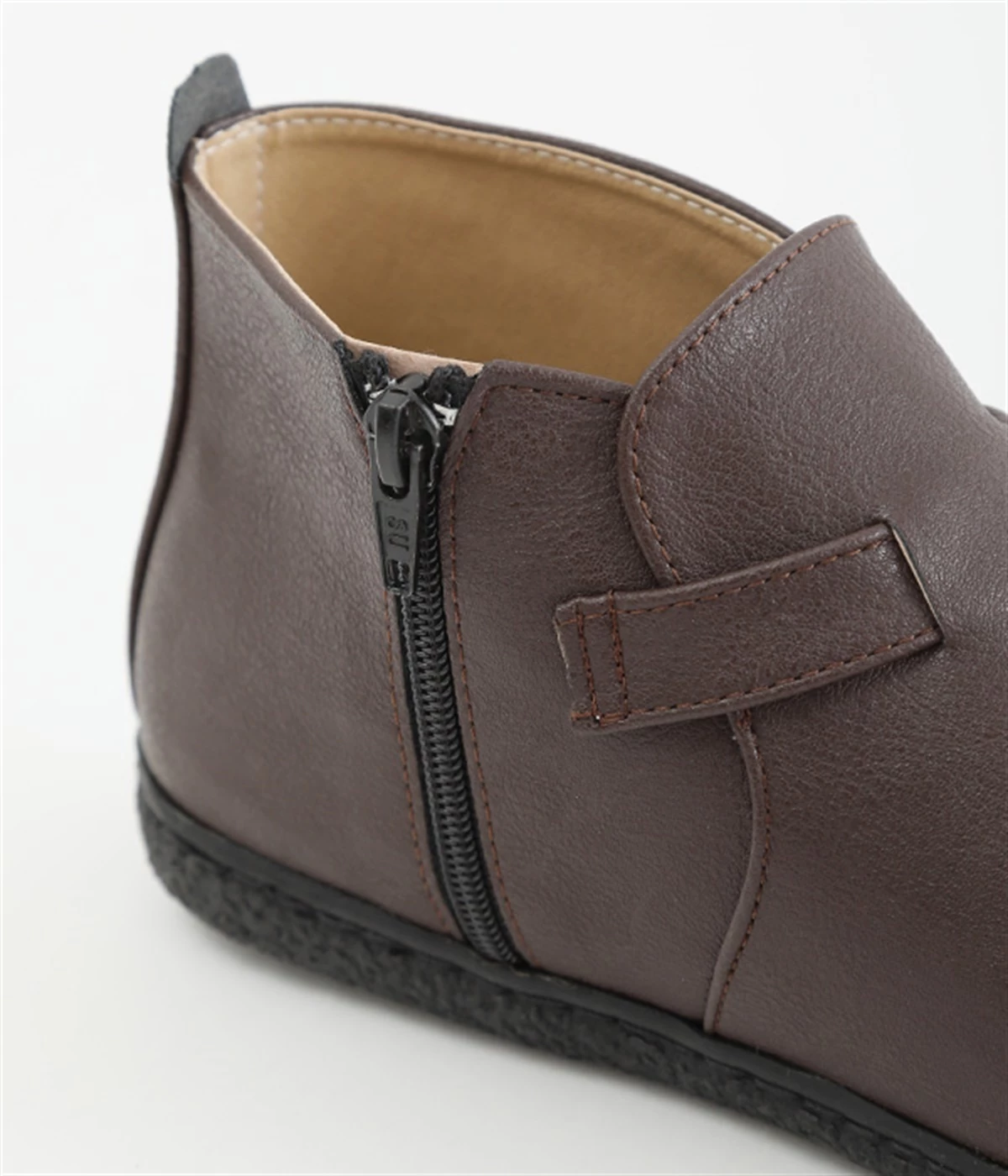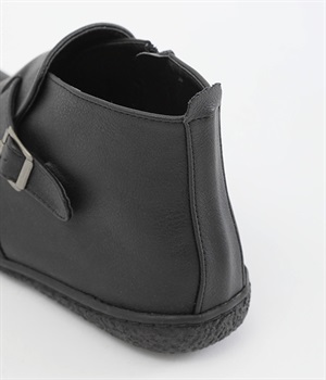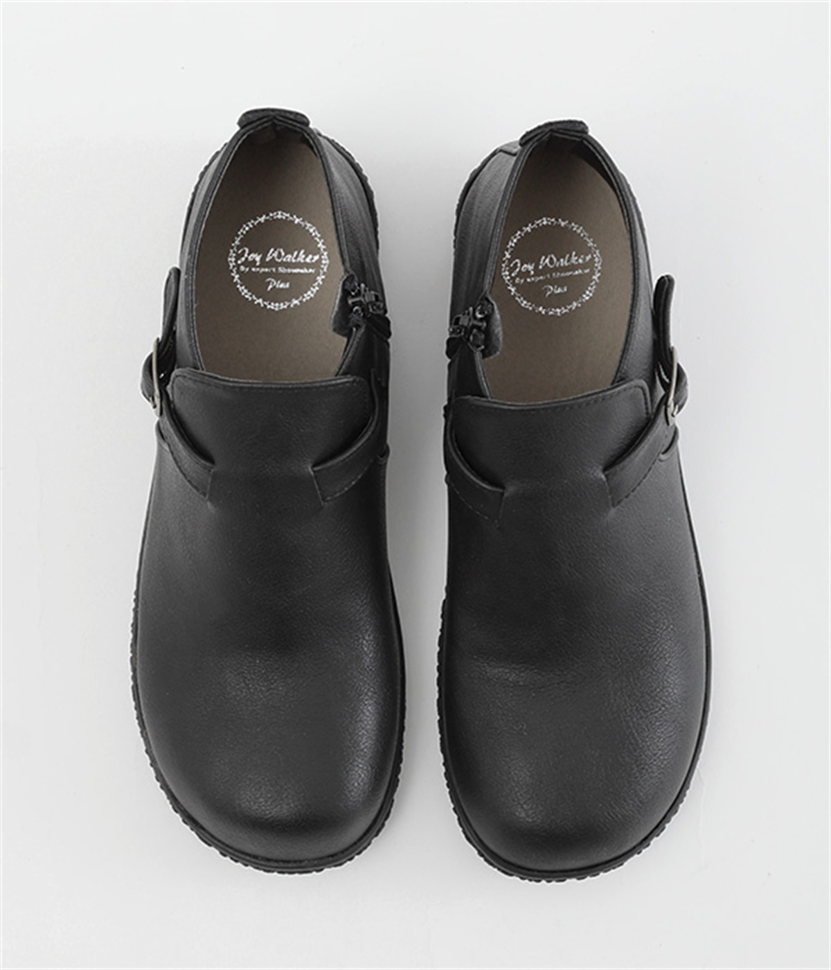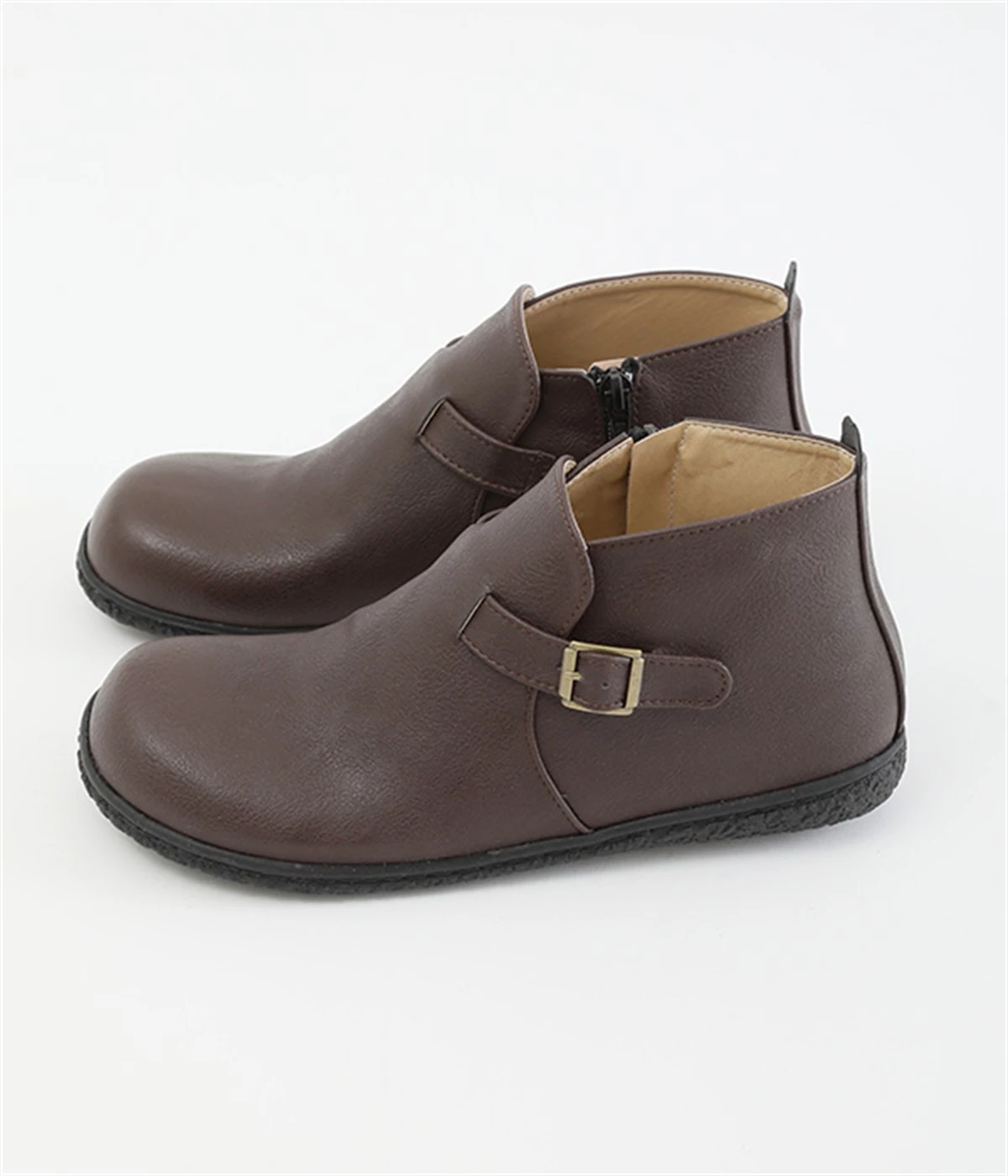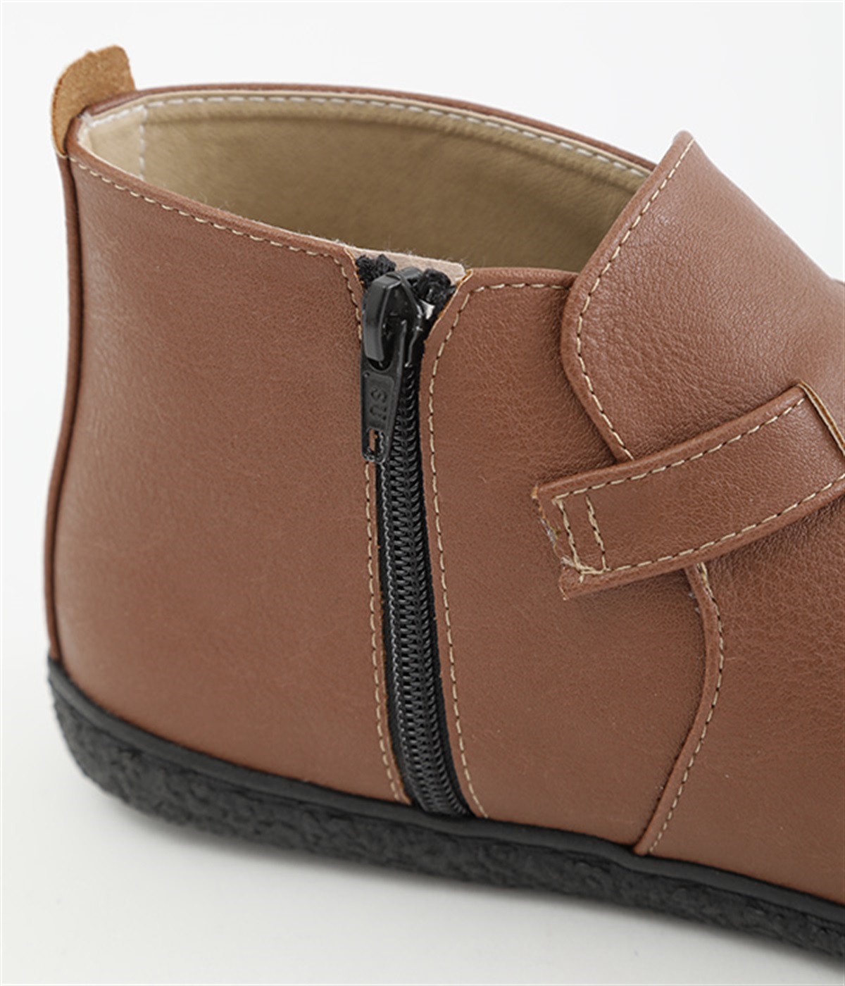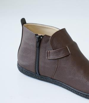 甲に配したベルトデザインがおしゃれなショートブーツ。くるぶしほどの高さと丸みのあるフォルムがかわいらしく、ソックスとのコーディネートも存分にたのしめます。内側には脱ぎ履きをアシストするファスナーをつけました。