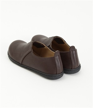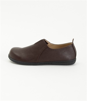 センターのゴムが少しレトロな雰囲気漂うスリッポンシューズです。しぼのある柔らかな質感のレザーのような風合いを持った合皮素材で、足なじみが良く履きやすいのがポイント。先端の丸いトゥがかわいらしい足元を演出し、柄物ソックスなどとの足元コーデも楽しめるデザインです。ソールはゴムで滑りにくい仕様に。カジュアルからキレイめまで幅広く合わせられるシンプルさも魅力です。