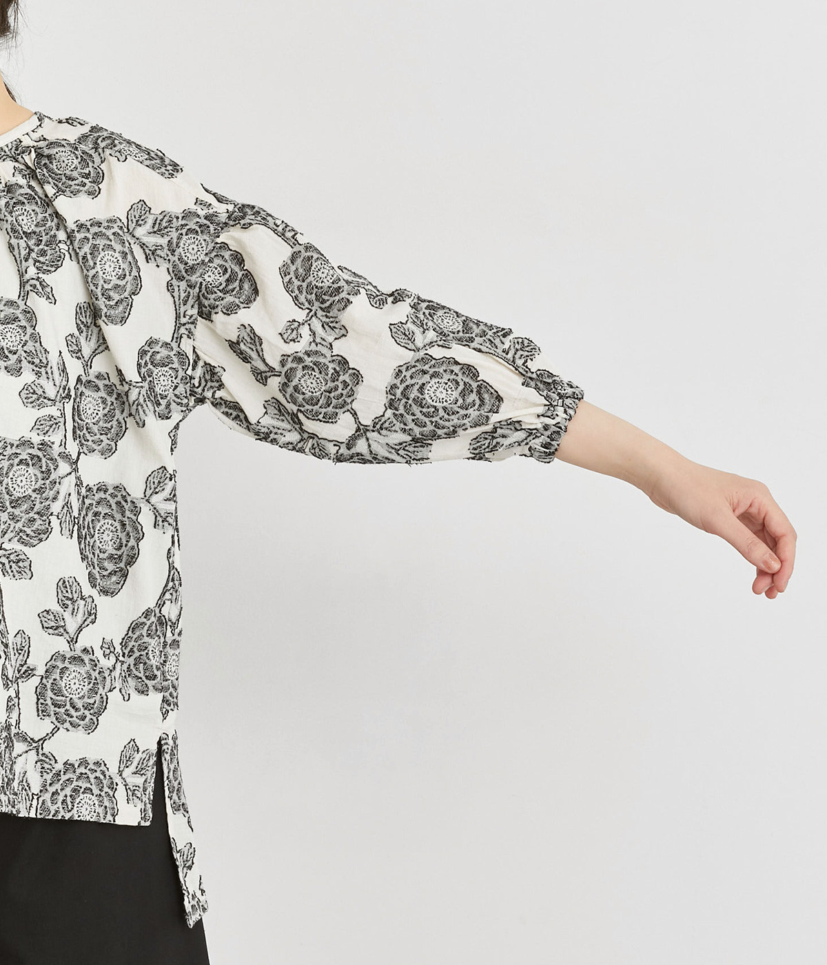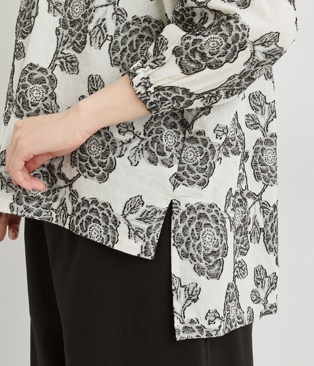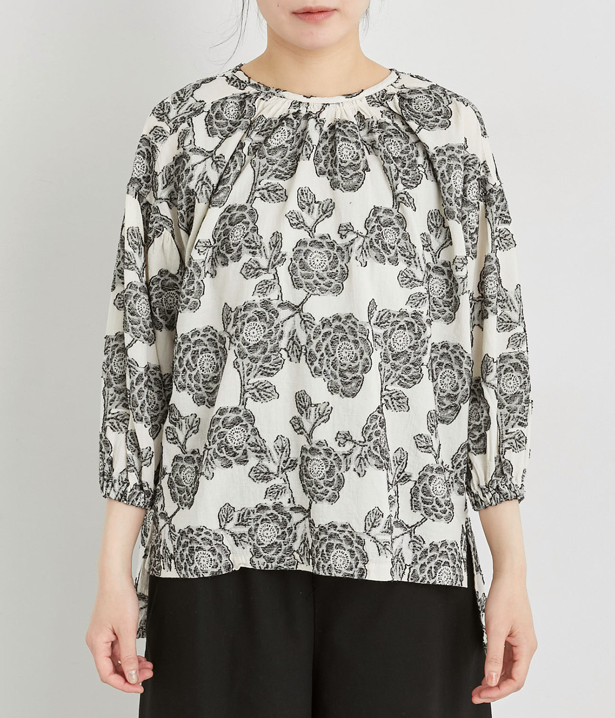 アイキャッチになる花柄を活かしたベーシックな一枚です。前後差がありサイドにスリットを入れたデザインですっきりと着用できます。前襟ぐりのギャザーとステッチがさり気ないポイントになっています。袖口ゴム入りなのでたくし上げのアレンジもおすすめ。