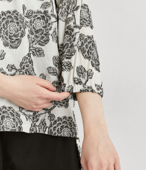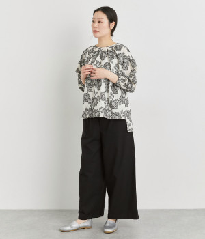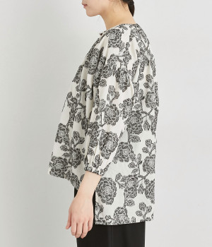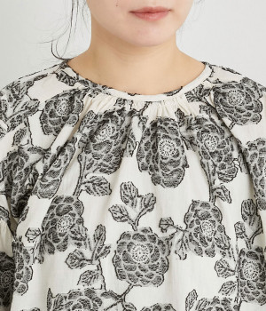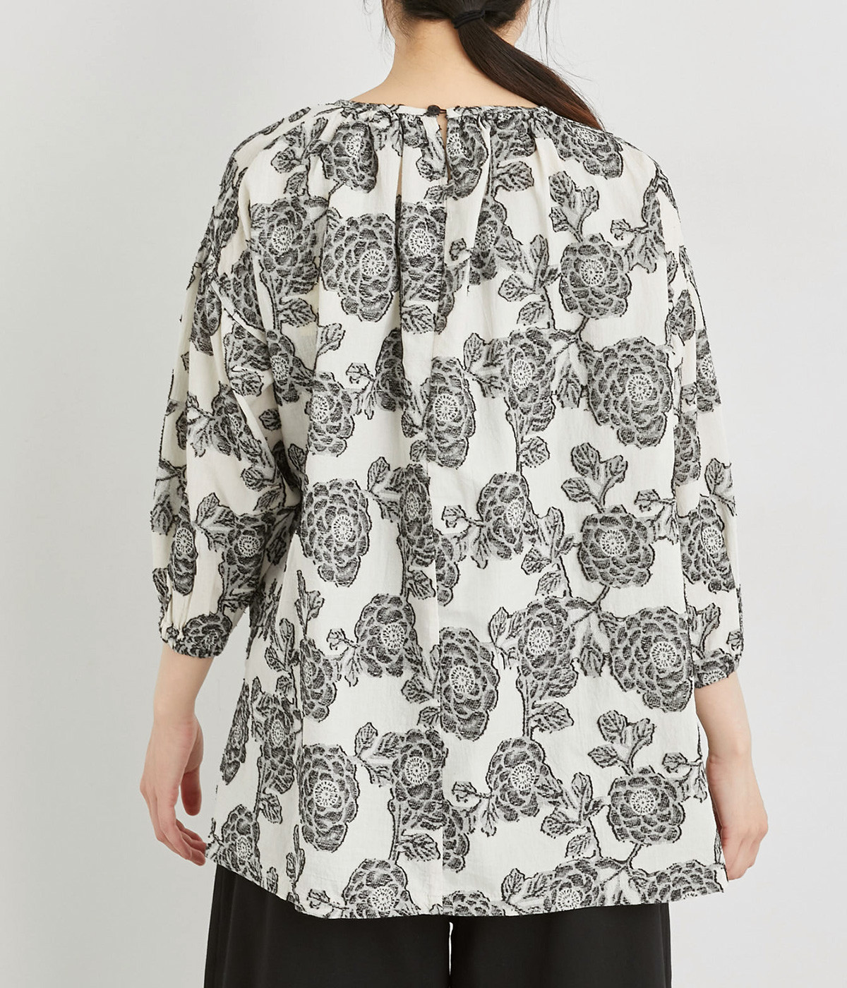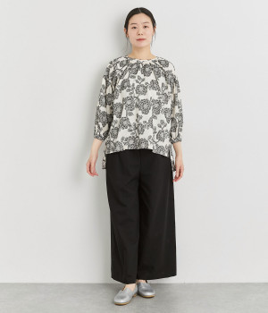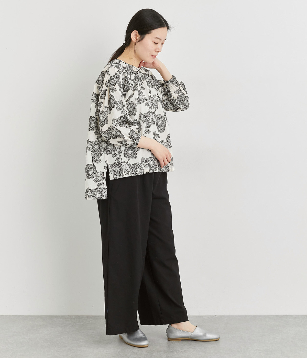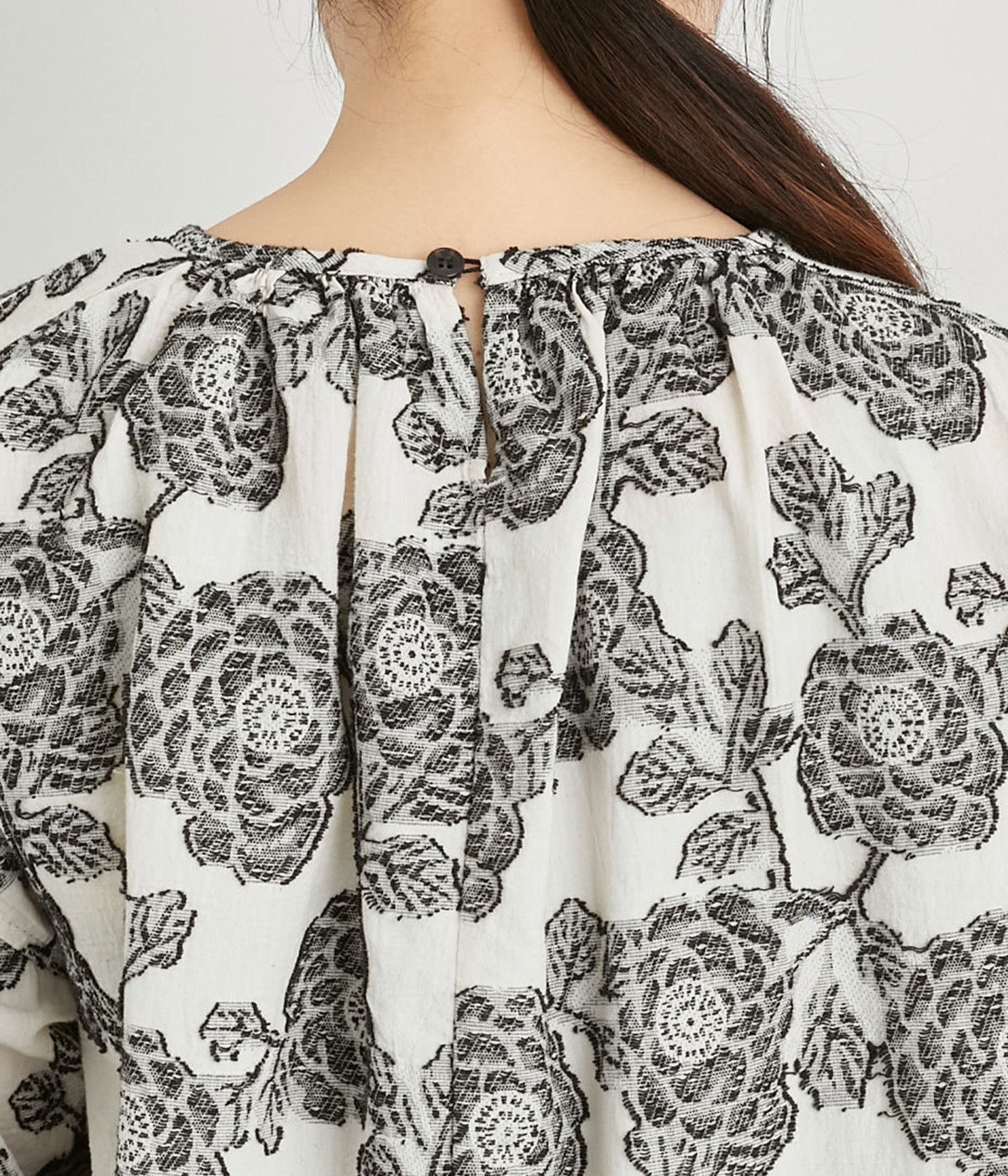 アイキャッチになる花柄を活かしたベーシックな一枚です。前後差がありサイドにスリットを入れたデザインですっきりと着用できます。前襟ぐりのギャザーとステッチがさり気ないポイントになっています。袖口ゴム入りなのでたくし上げのアレンジもおすすめ。