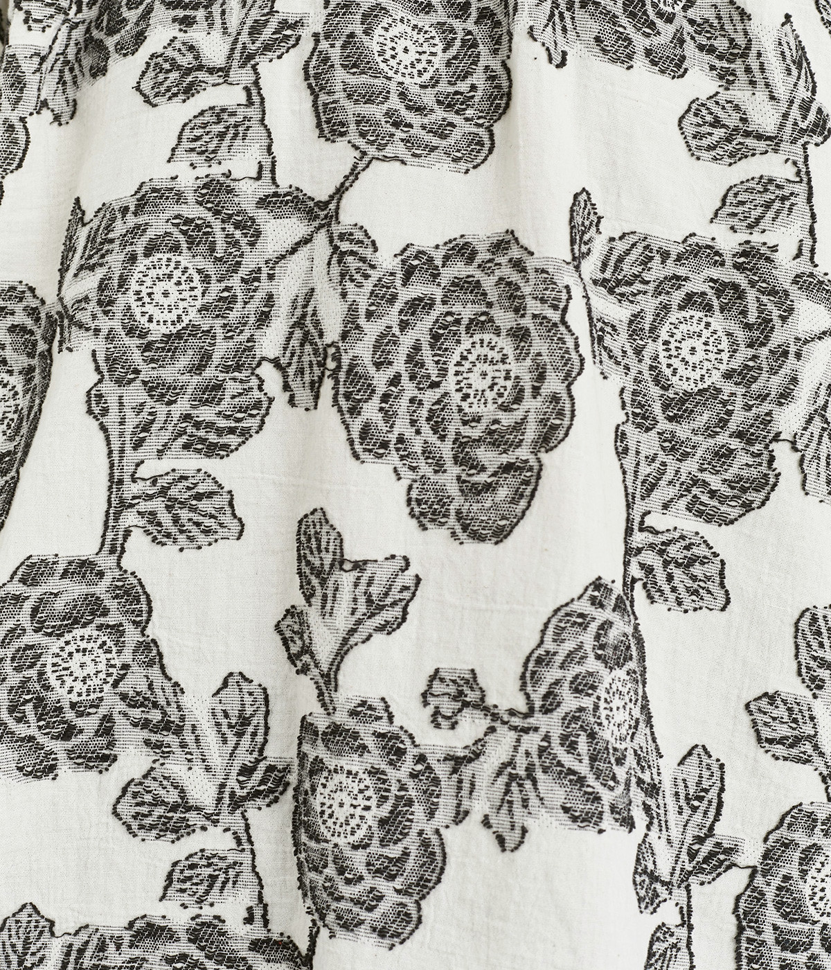 立体感のある花柄がモダンで目を惹くジャカード織の総柄生地を使用しました。肌離れのいいさらりとした素材が心地よく、着こなししだいでロングシーズン活躍します。