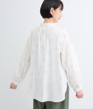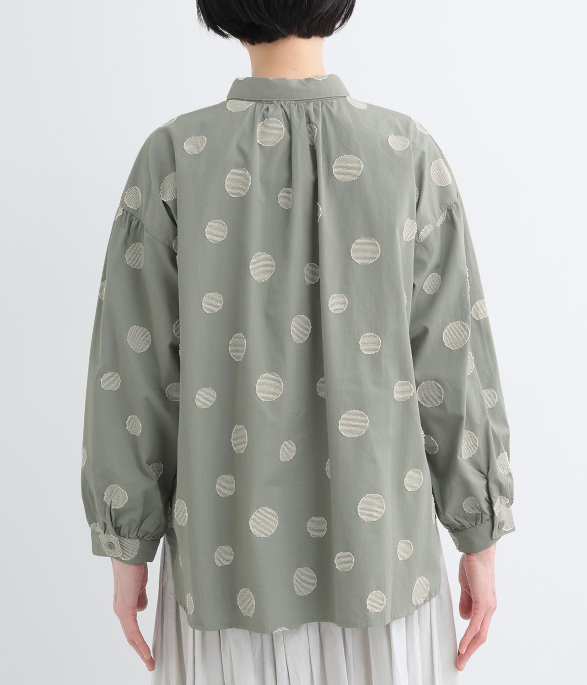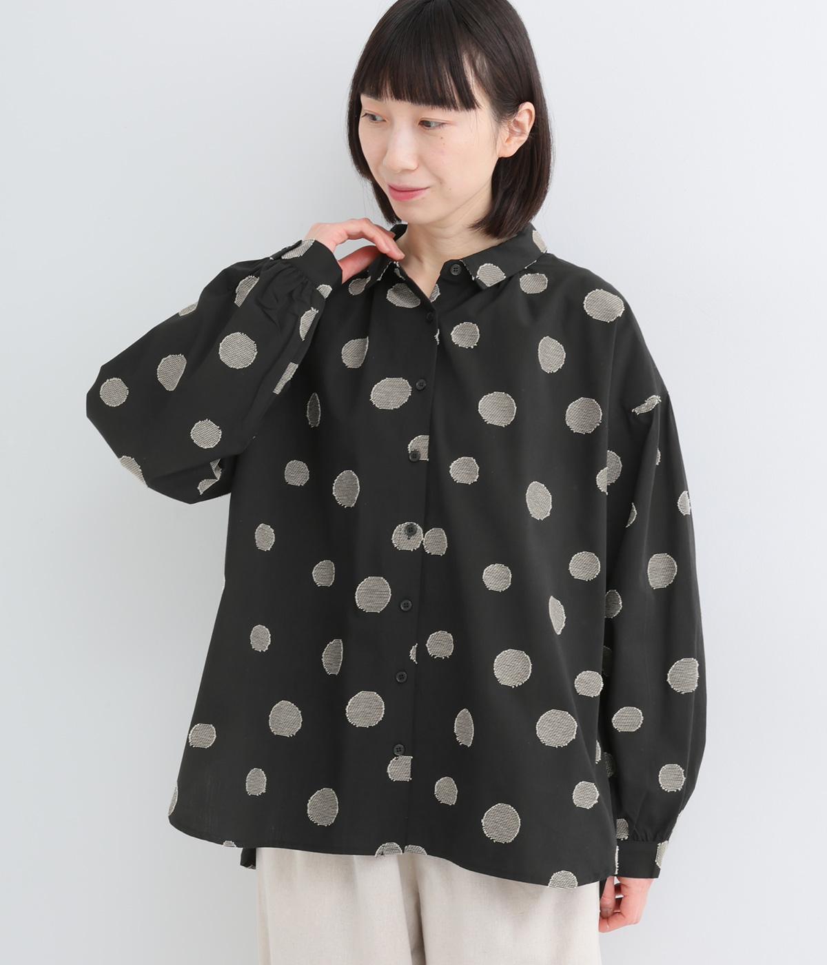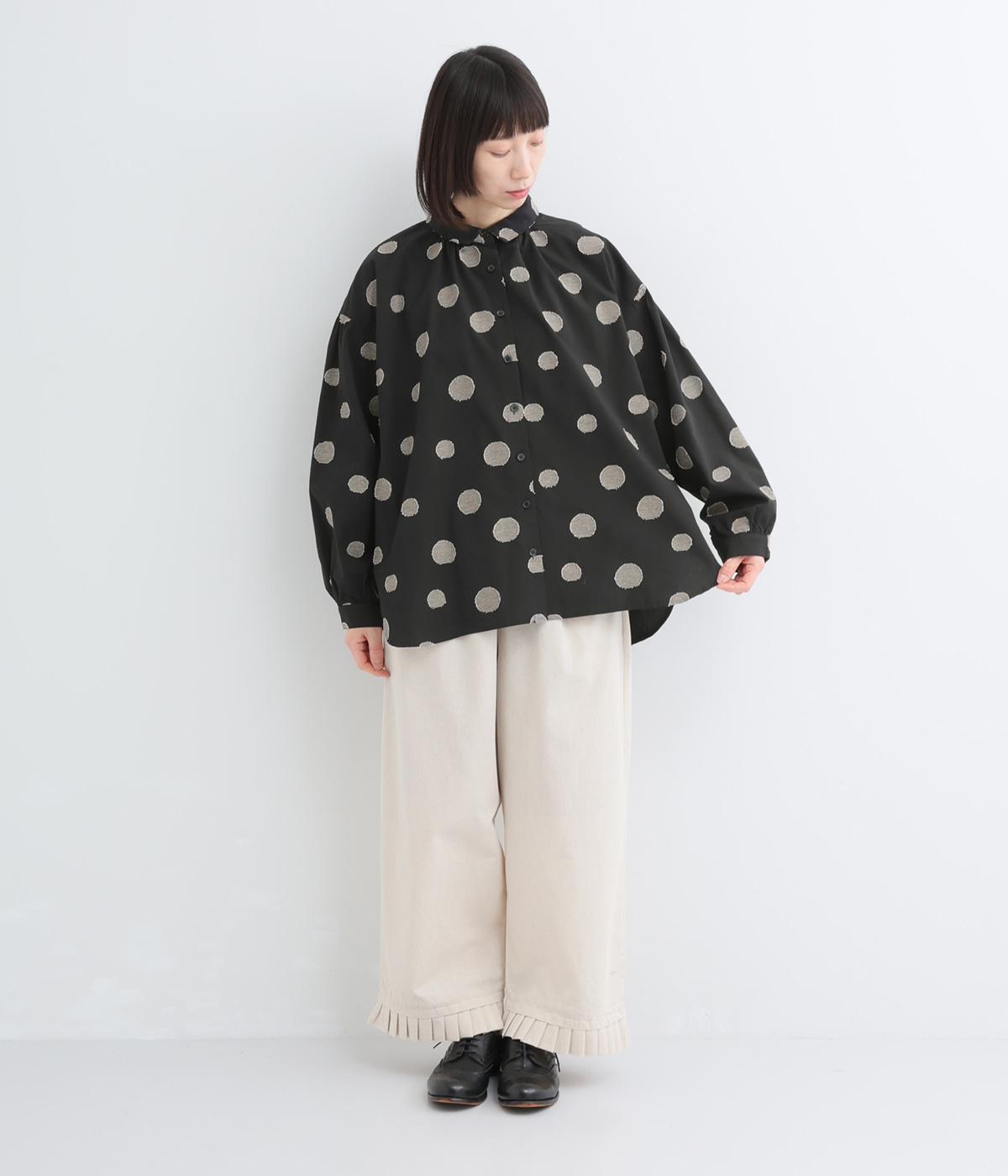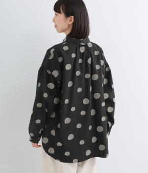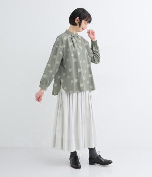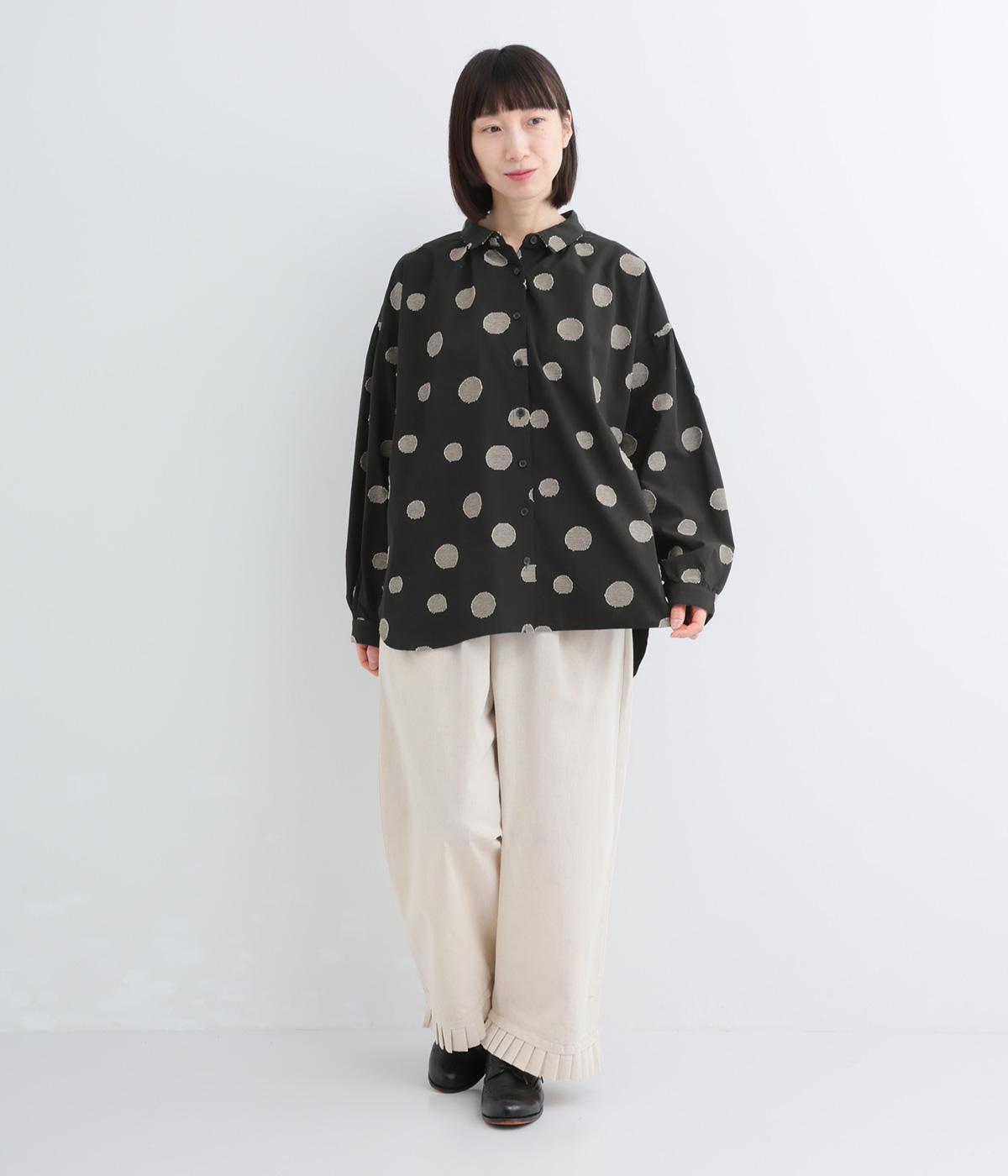 ジャガード織りで表現したランダムなドット柄が、甘すぎない落ち着いた表情のブラウス。ふんわりとゆとりのあるシルエットがやわらかな雰囲気を後押しし、前後差のある裾が腰まわりをさりげなくカバーします。