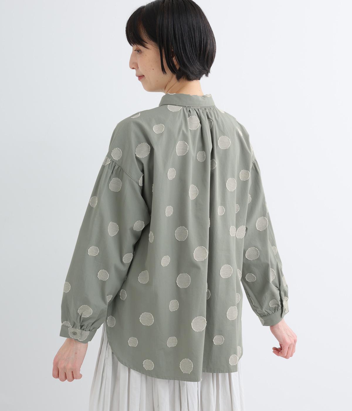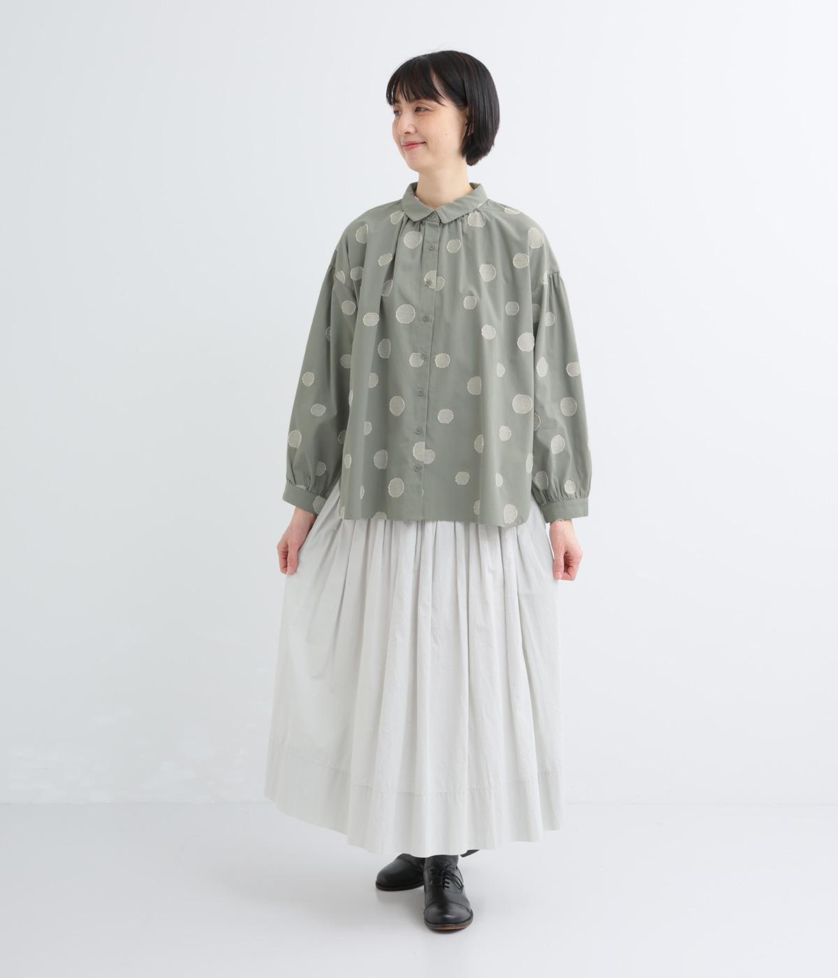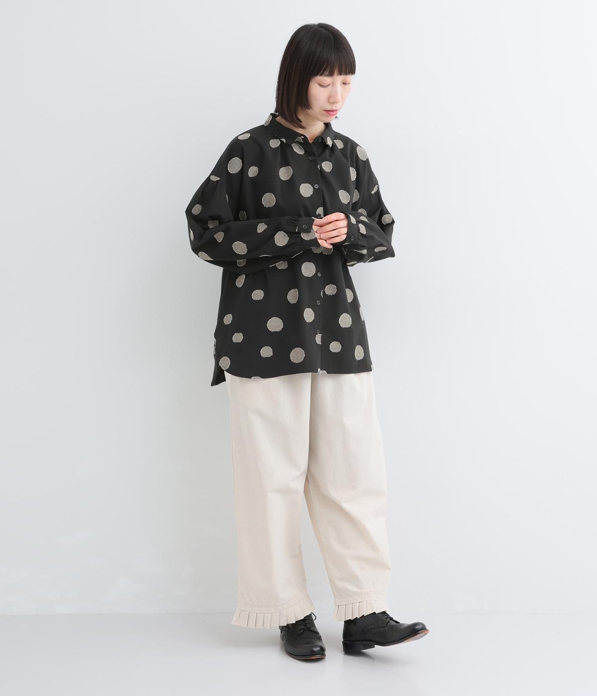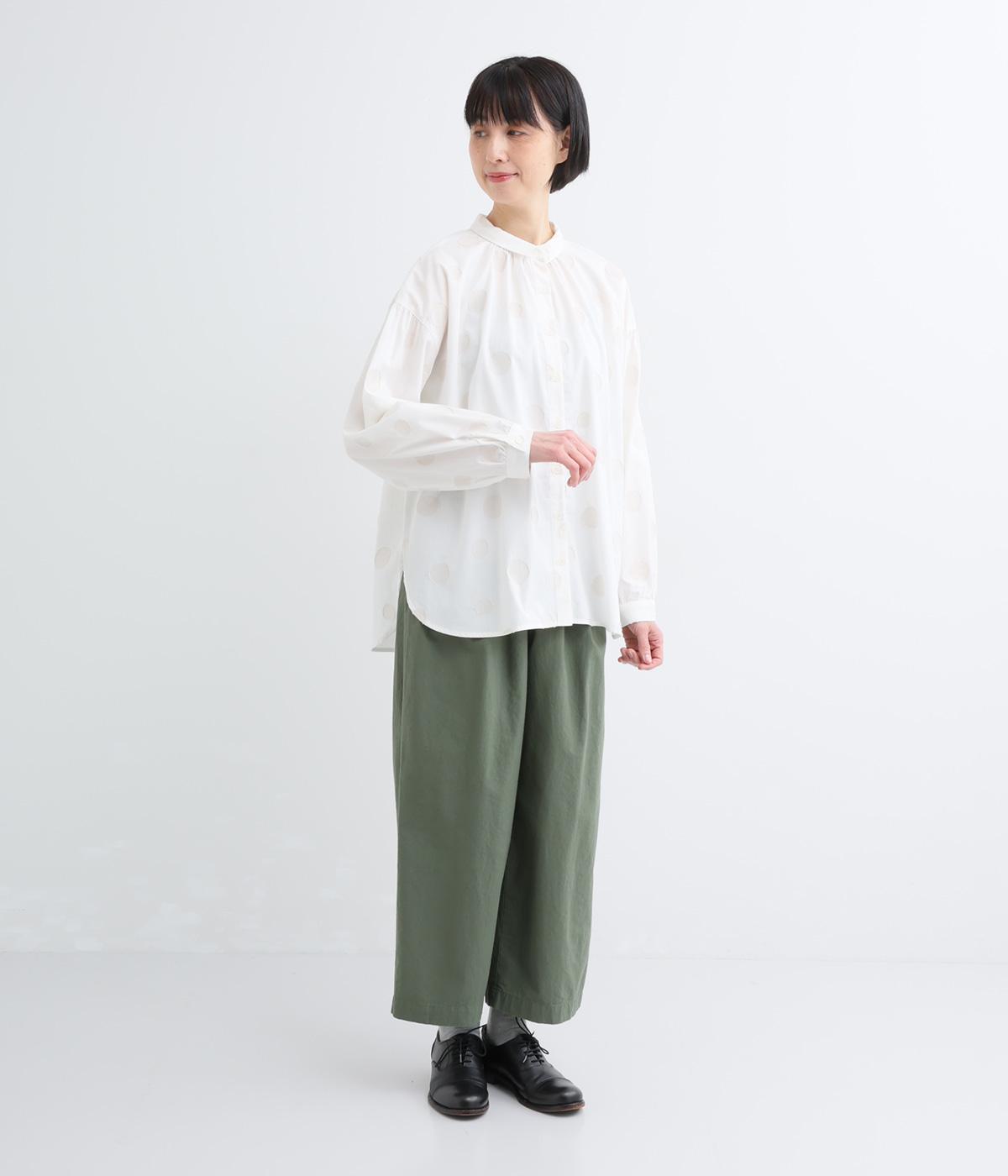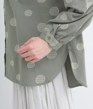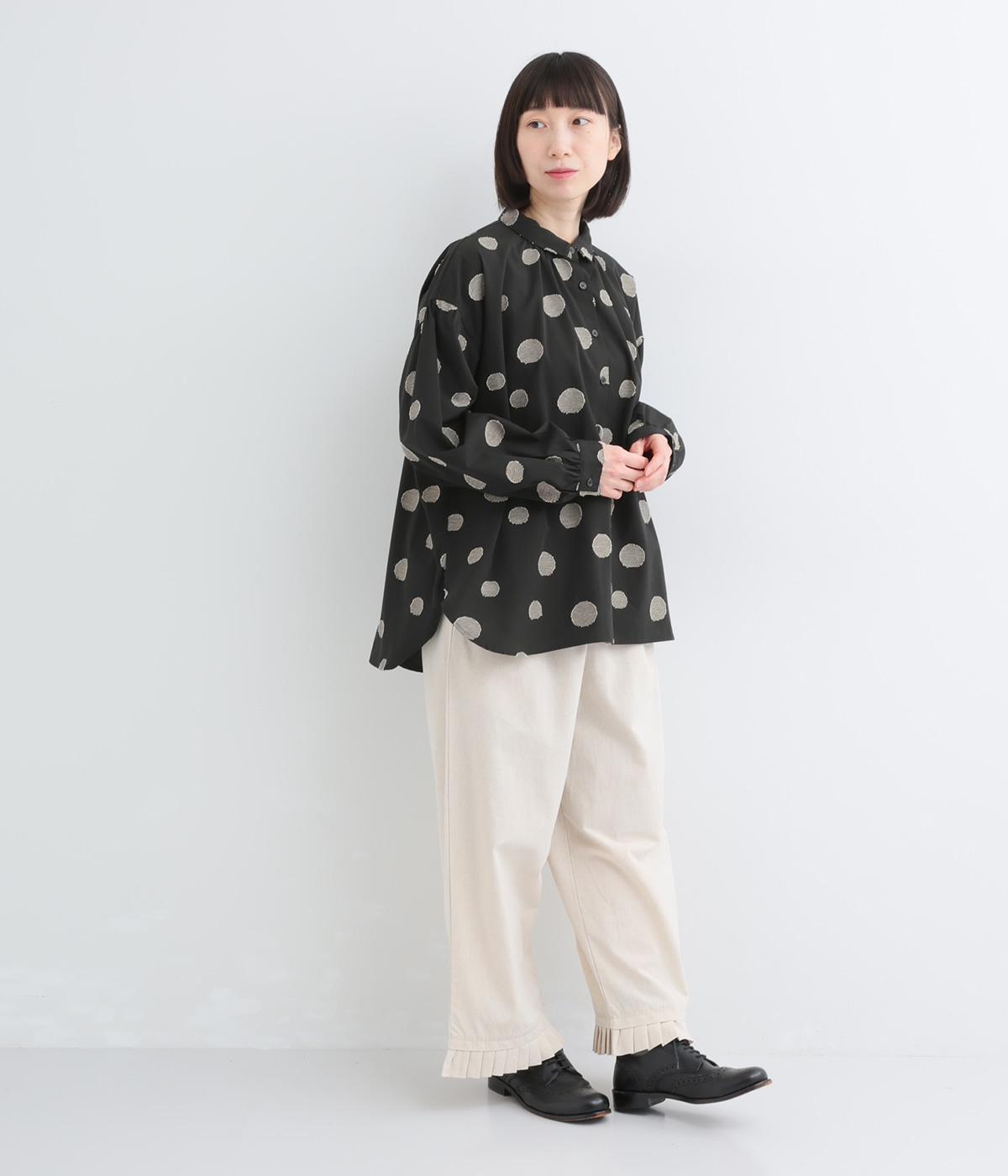 ジャガード織りで表現したランダムなドット柄が、甘すぎない落ち着いた表情のブラウス。ふんわりとゆとりのあるシルエットがやわらかな雰囲気を後押しし、前後差のある裾が腰まわりをさりげなくカバーします。