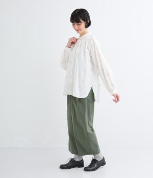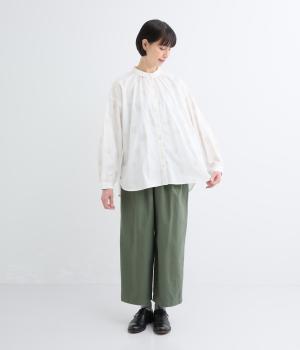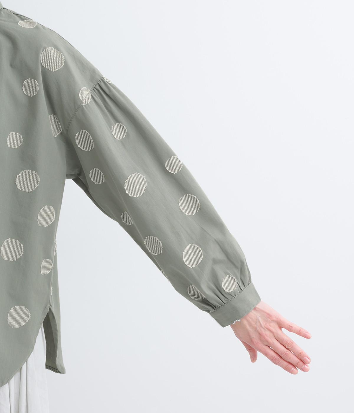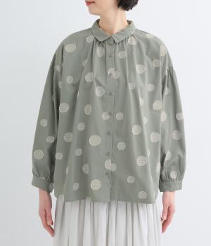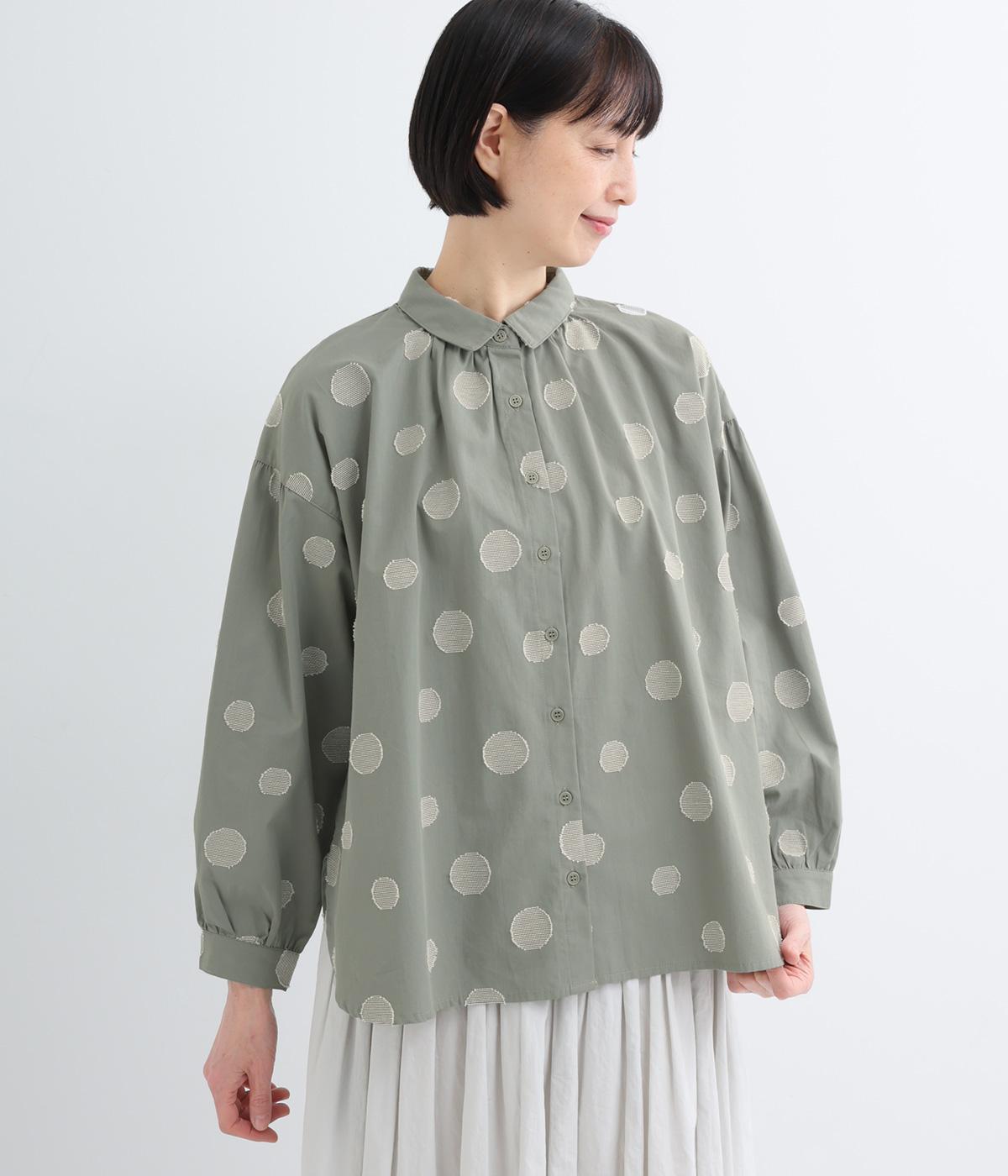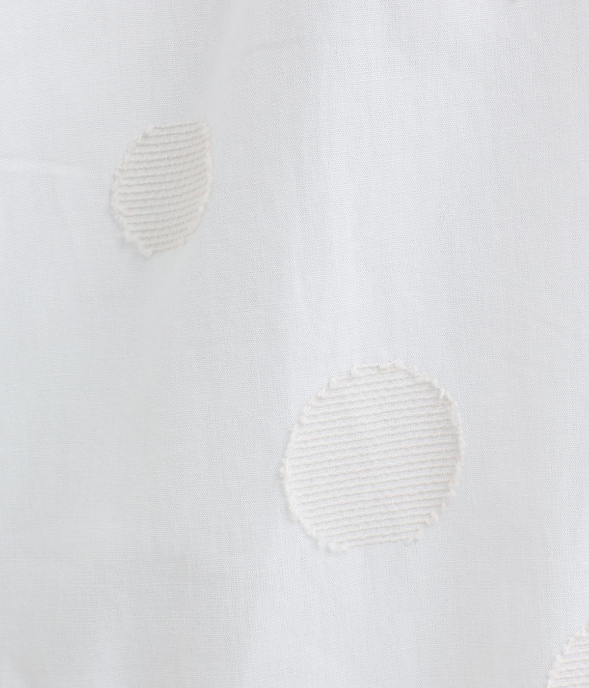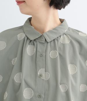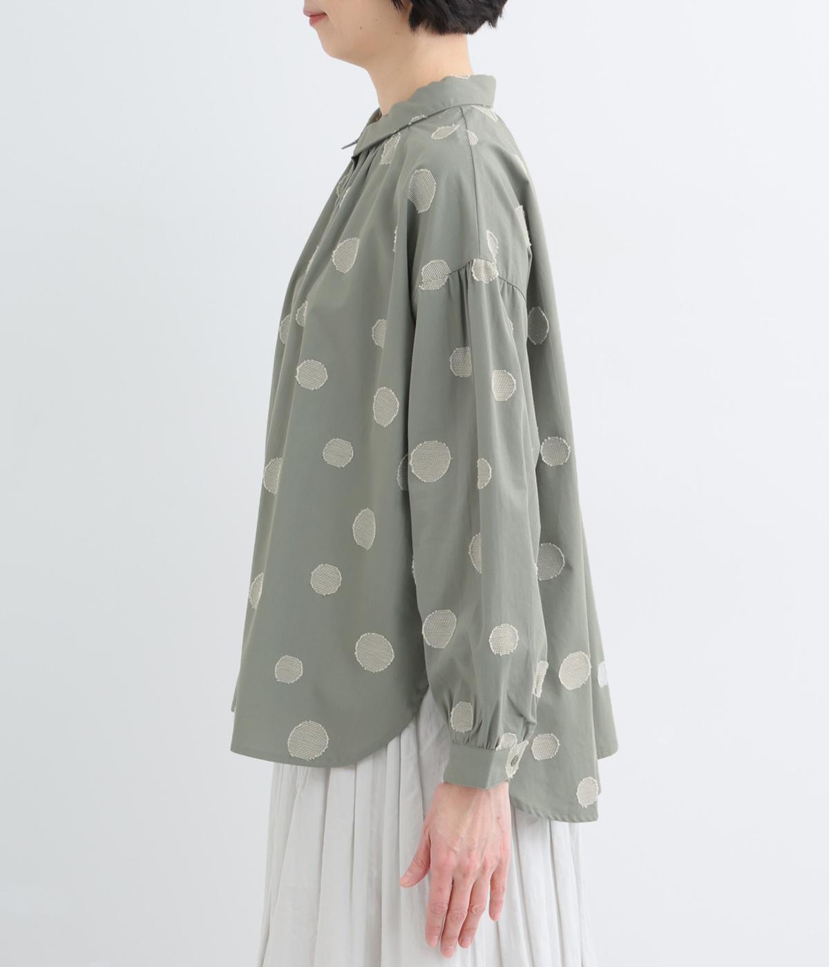 ジャガード織りで表現したランダムなドット柄が、甘すぎない落ち着いた表情のブラウス。ふんわりとゆとりのあるシルエットがやわらかな雰囲気を後押しし、前後差のある裾が腰まわりをさりげなくカバーします。