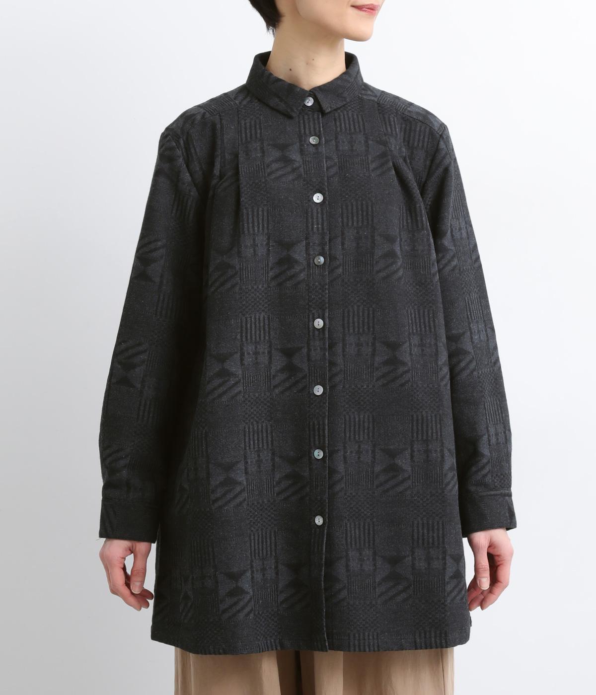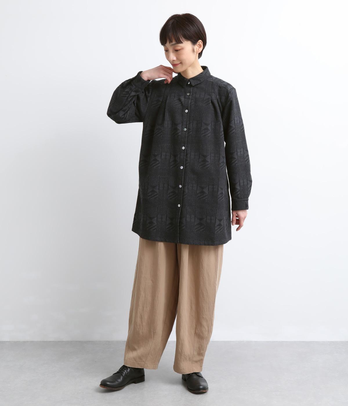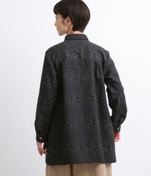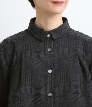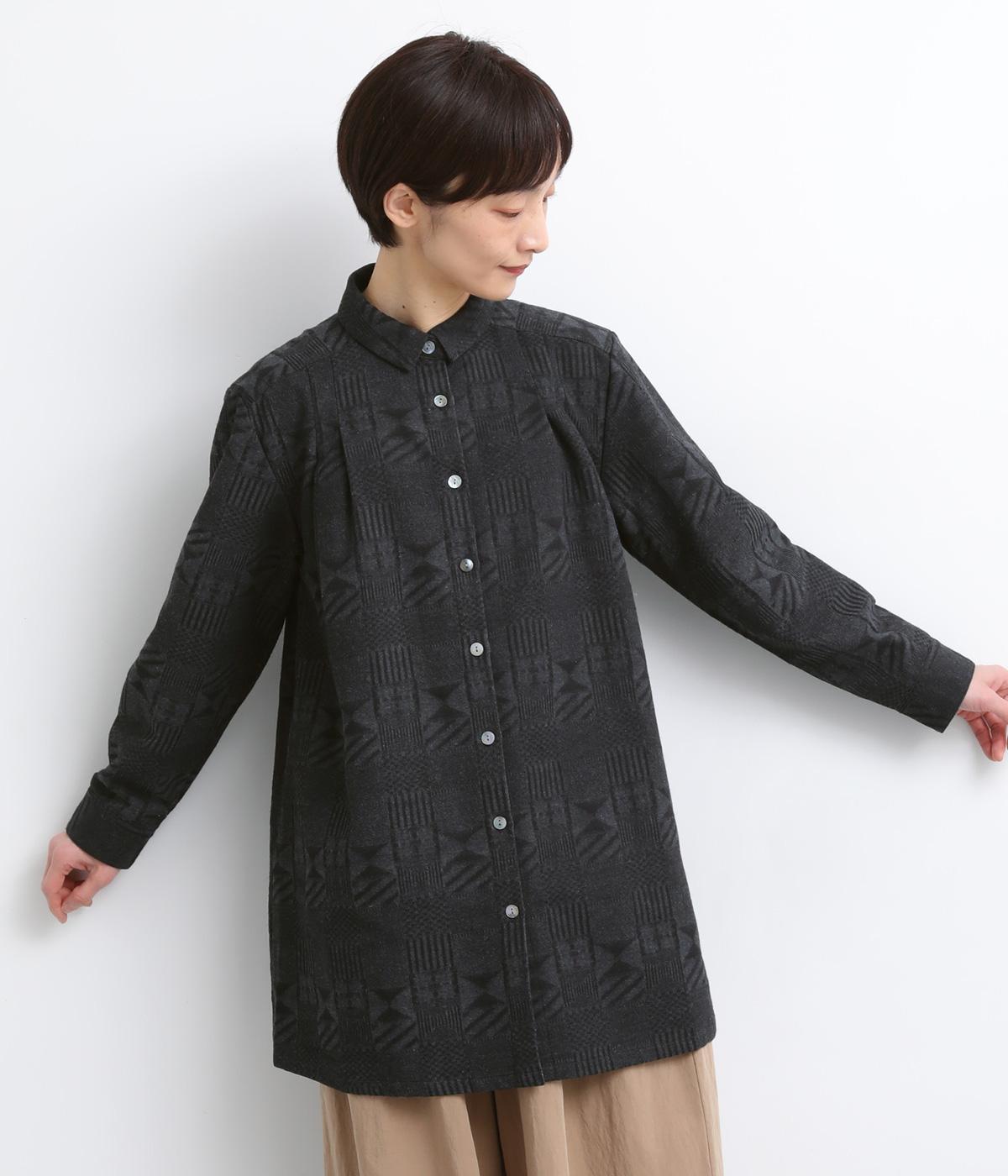 ジャカード織りの幾何学模様がさりげない立体感を添える、ロング丈のブラウスです。織り柄が光によって表情を変え、シンプルながらも奥行きのある印象に仕上げました。前後に入れたタックが動きを生み、ゆるやかなAラインを演出。ポケットつきなのもうれしいポイントです。