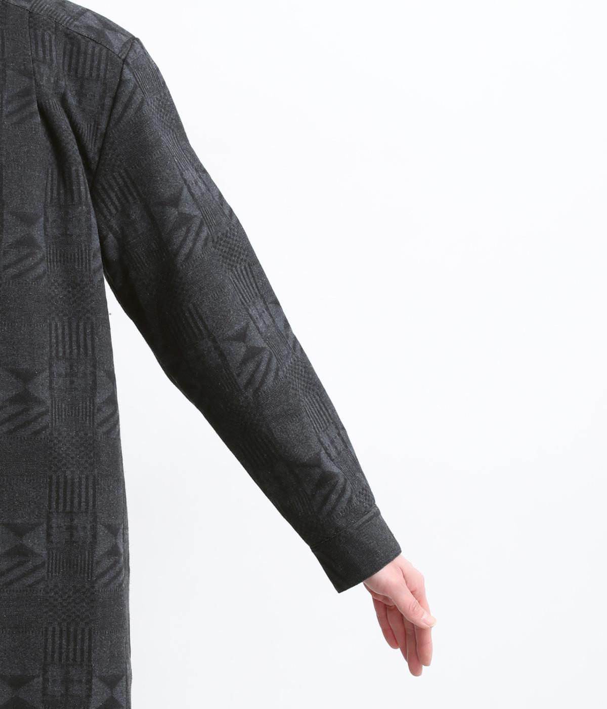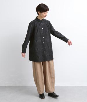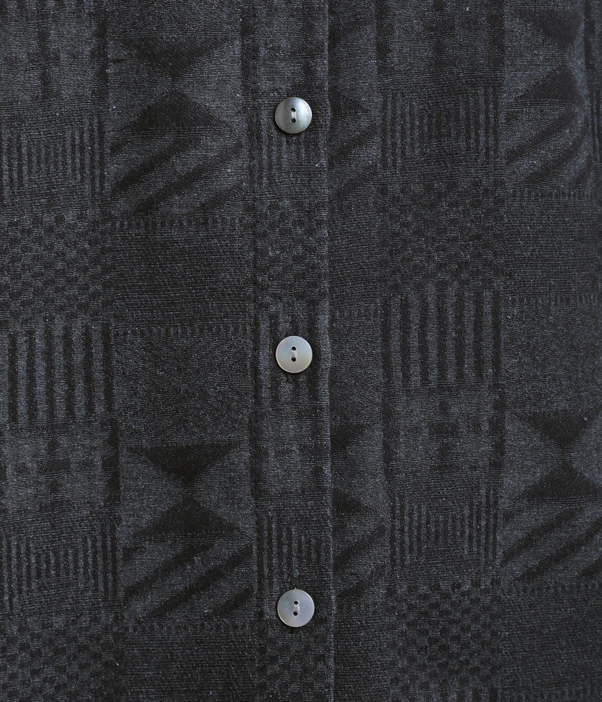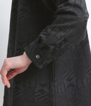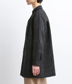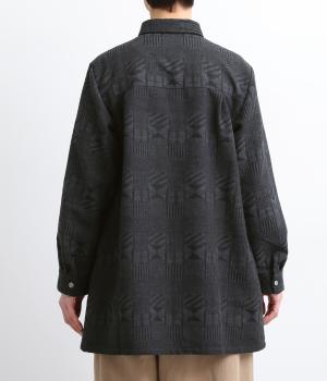 ジャカード織りの幾何学模様がさりげない立体感を添える、ロング丈のブラウスです。織り柄が光によって表情を変え、シンプルながらも奥行きのある印象に仕上げました。前後に入れたタックが動きを生み、ゆるやかなAラインを演出。ポケットつきなのもうれしいポイントです。