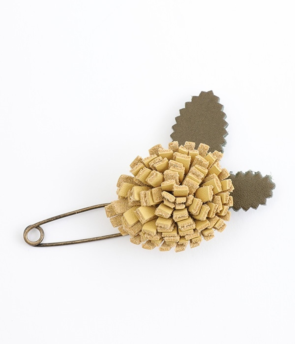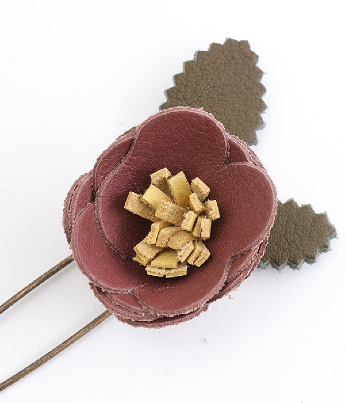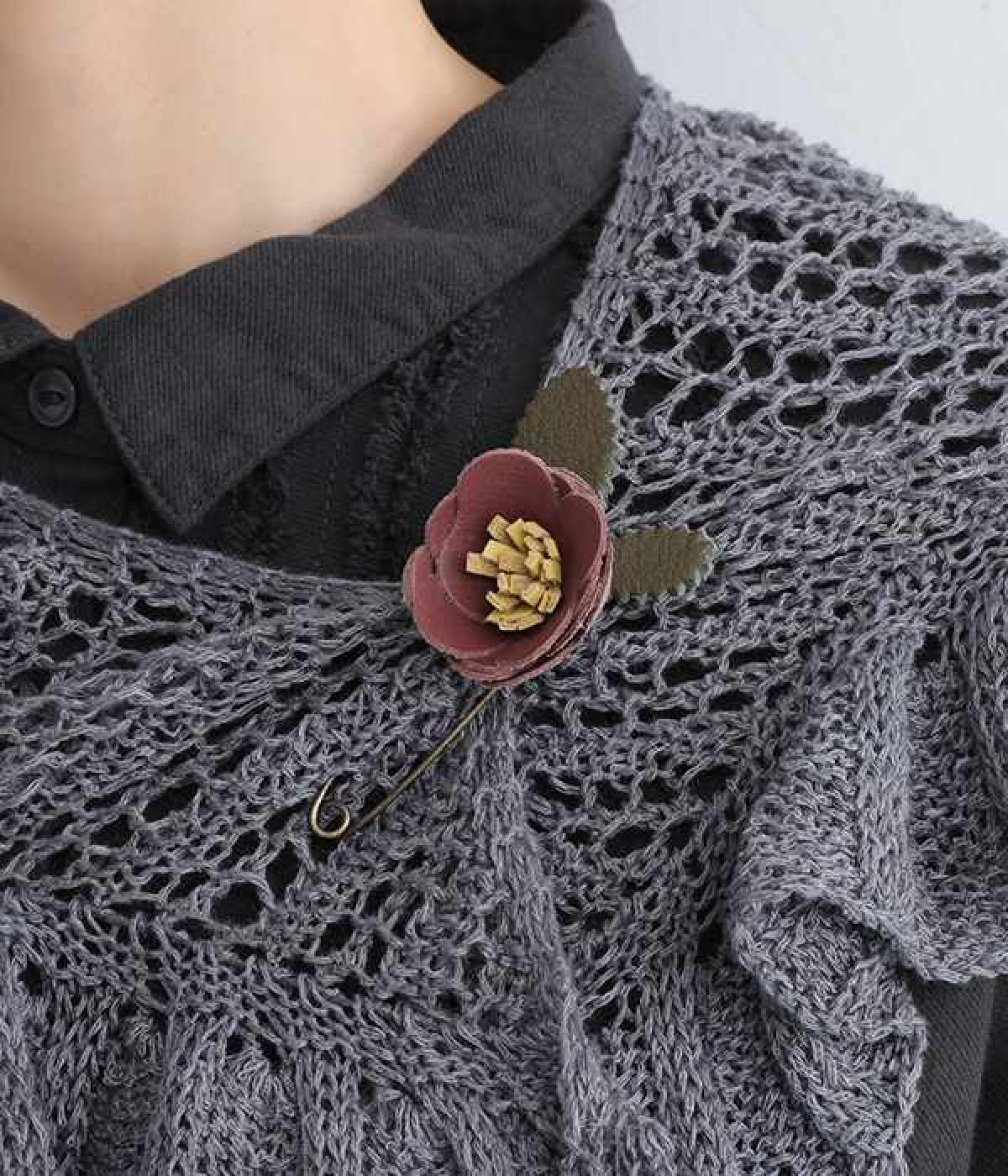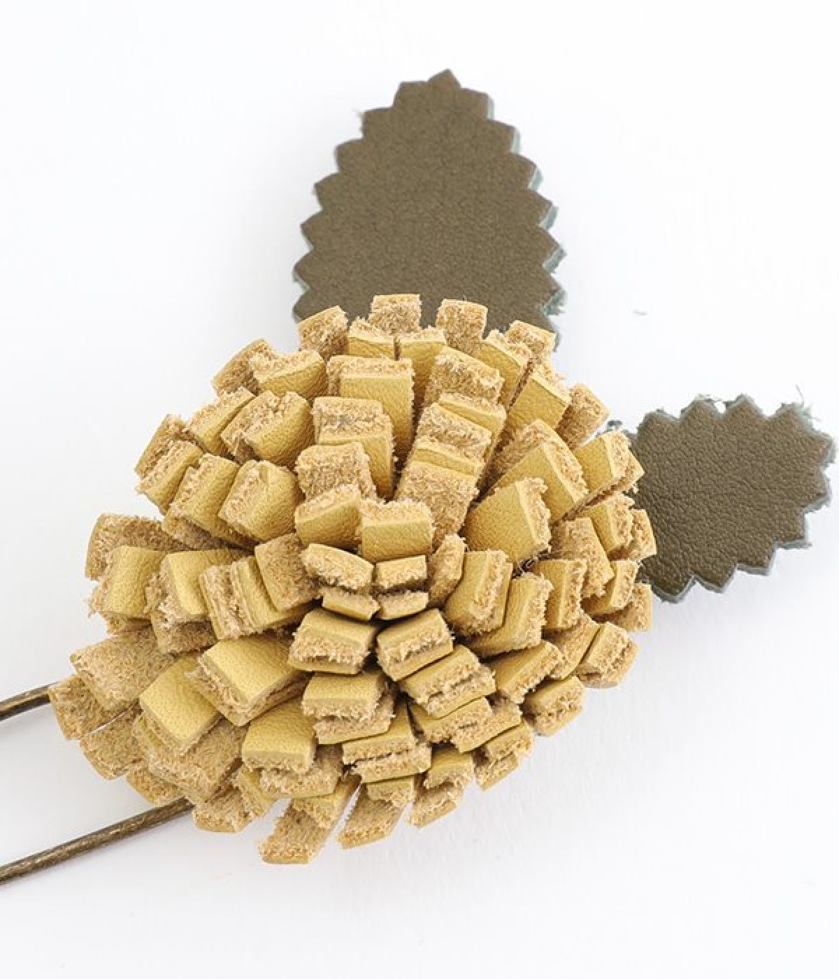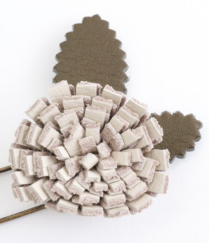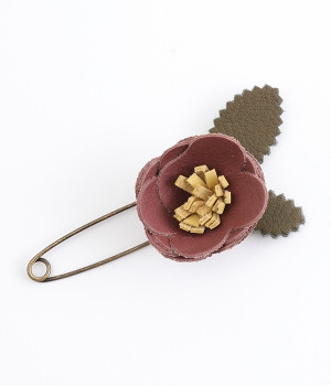 日常に淡い優しさを添える、お花をモチーフにしたショールピンです。レザーを一つ一つ手作業でつまんで立体的になるように形作っている、クラフト感が愛らしいアイテム。ぬくもりのある素材と落ち着いた色合いで派手になりすぎず、絶妙なアクセントになってくれます。ニットやシャツの胸元や、帽子やストールにつけても奥行きのある装いが完成します。