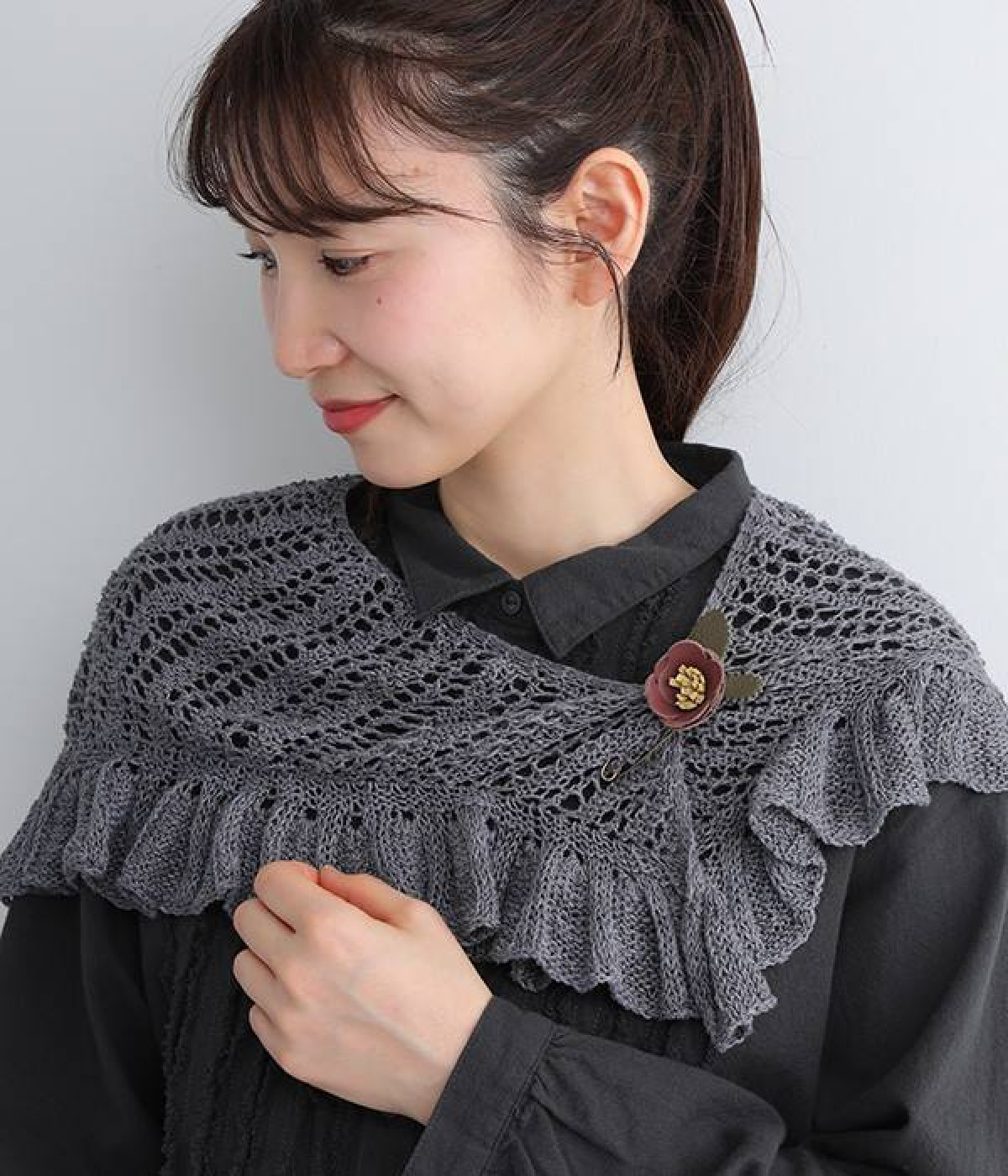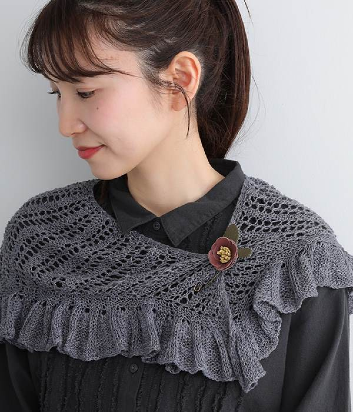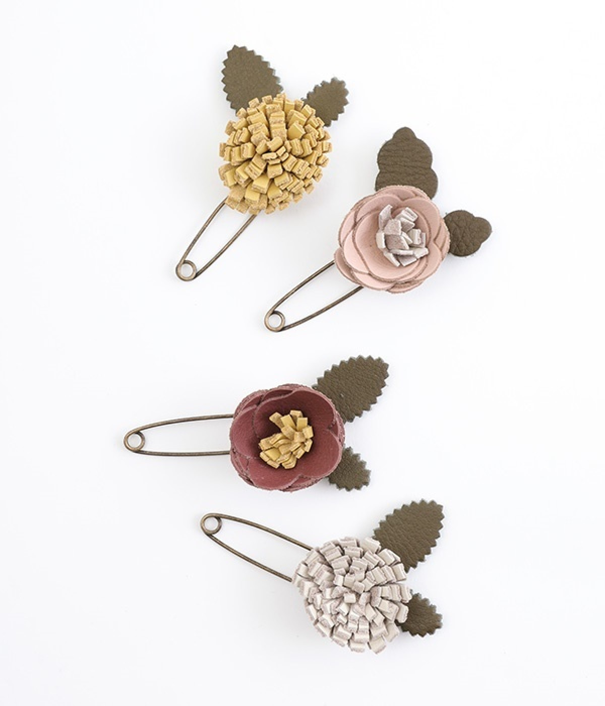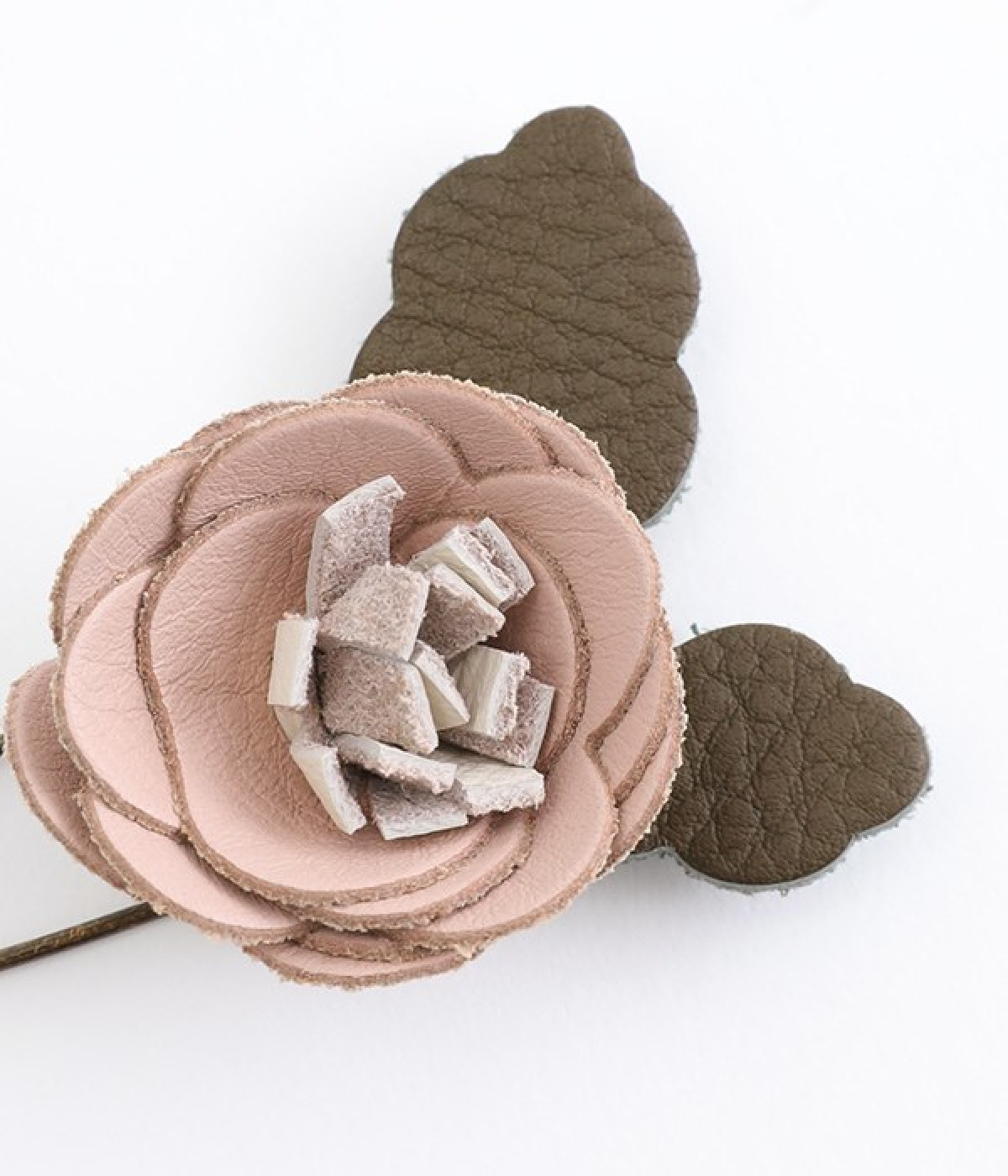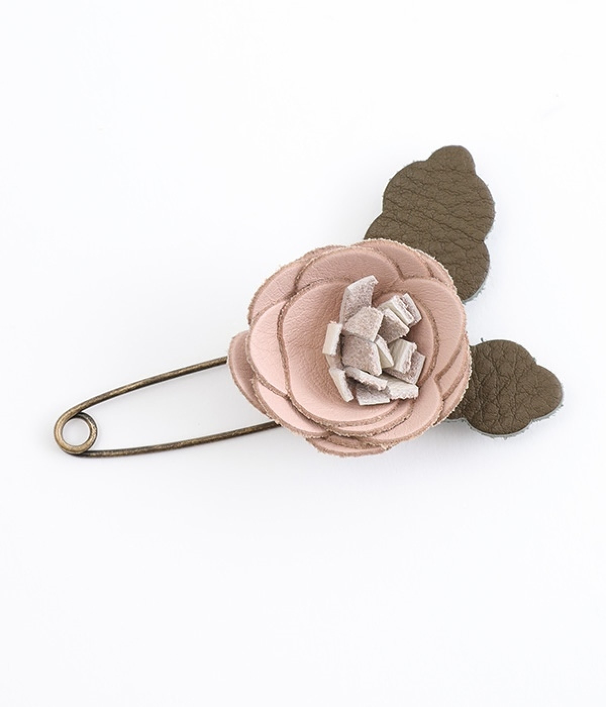 日常に淡い優しさを添える、お花をモチーフにしたショールピンです。レザーを一つ一つ手作業でつまんで立体的になるように形作っている、クラフト感が愛らしいアイテム。ぬくもりのある素材と落ち着いた色合いで派手になりすぎず、絶妙なアクセントになってくれます。ニットやシャツの胸元や、帽子やストールにつけても奥行きのある装いが完成します。